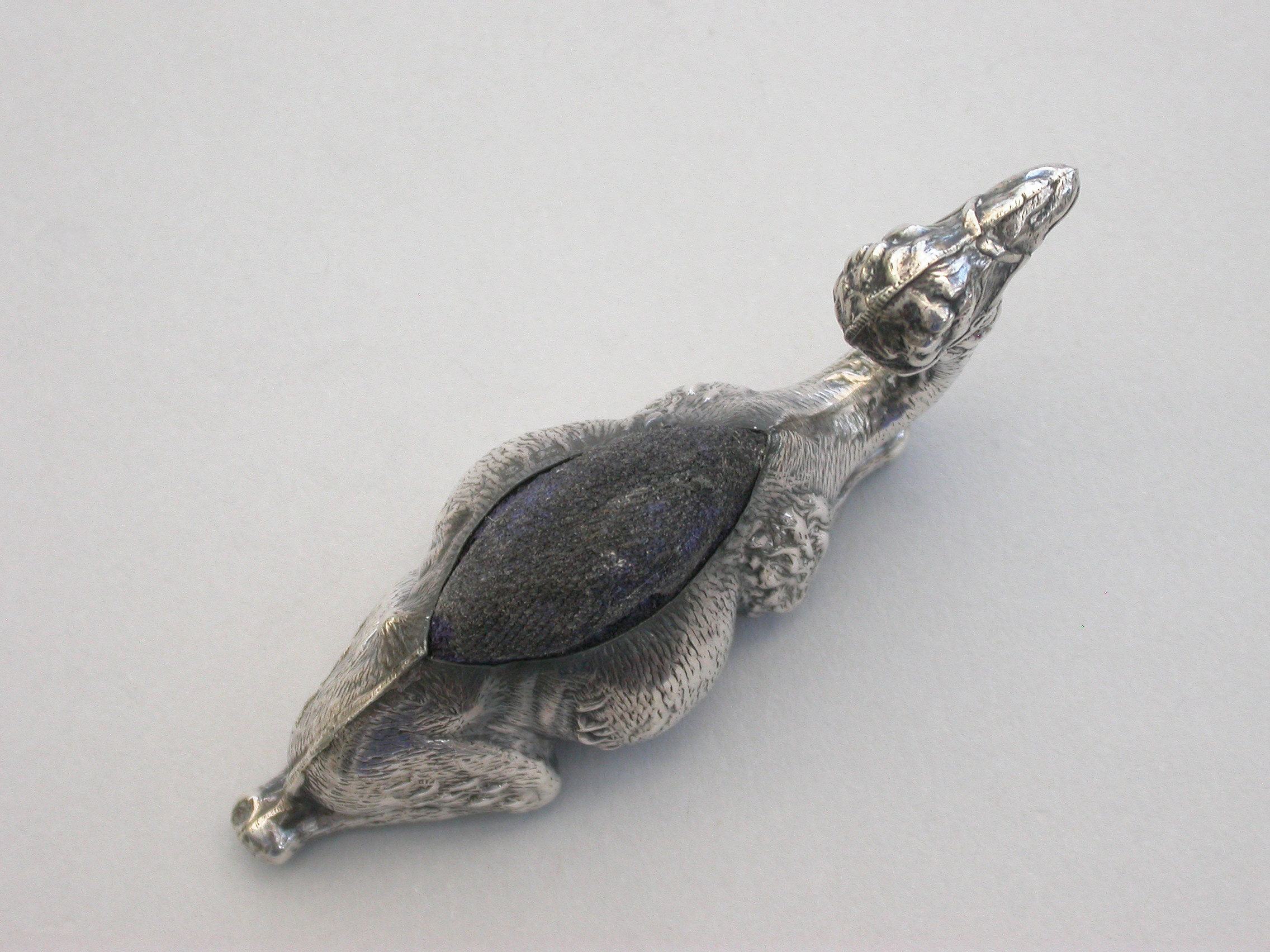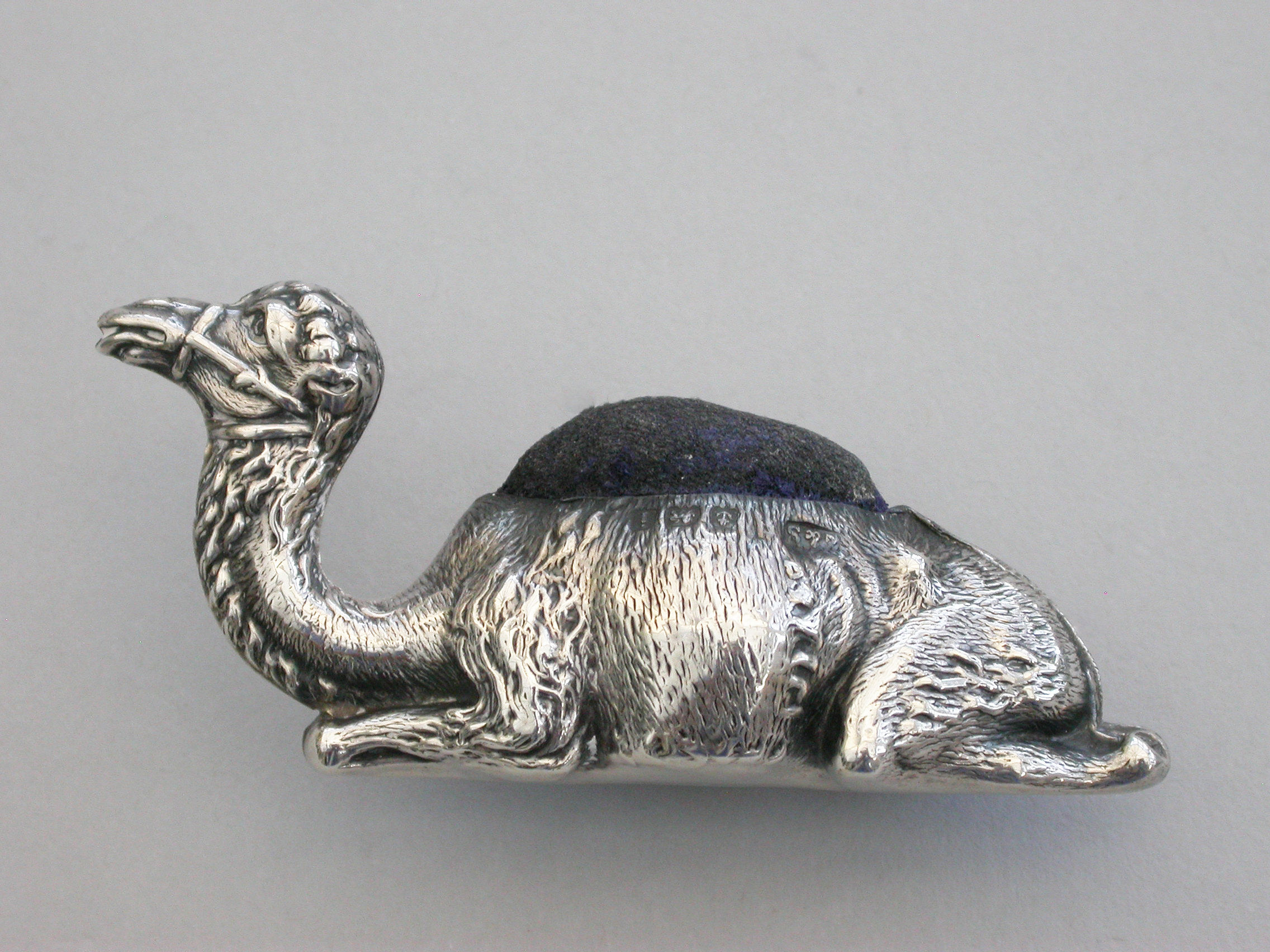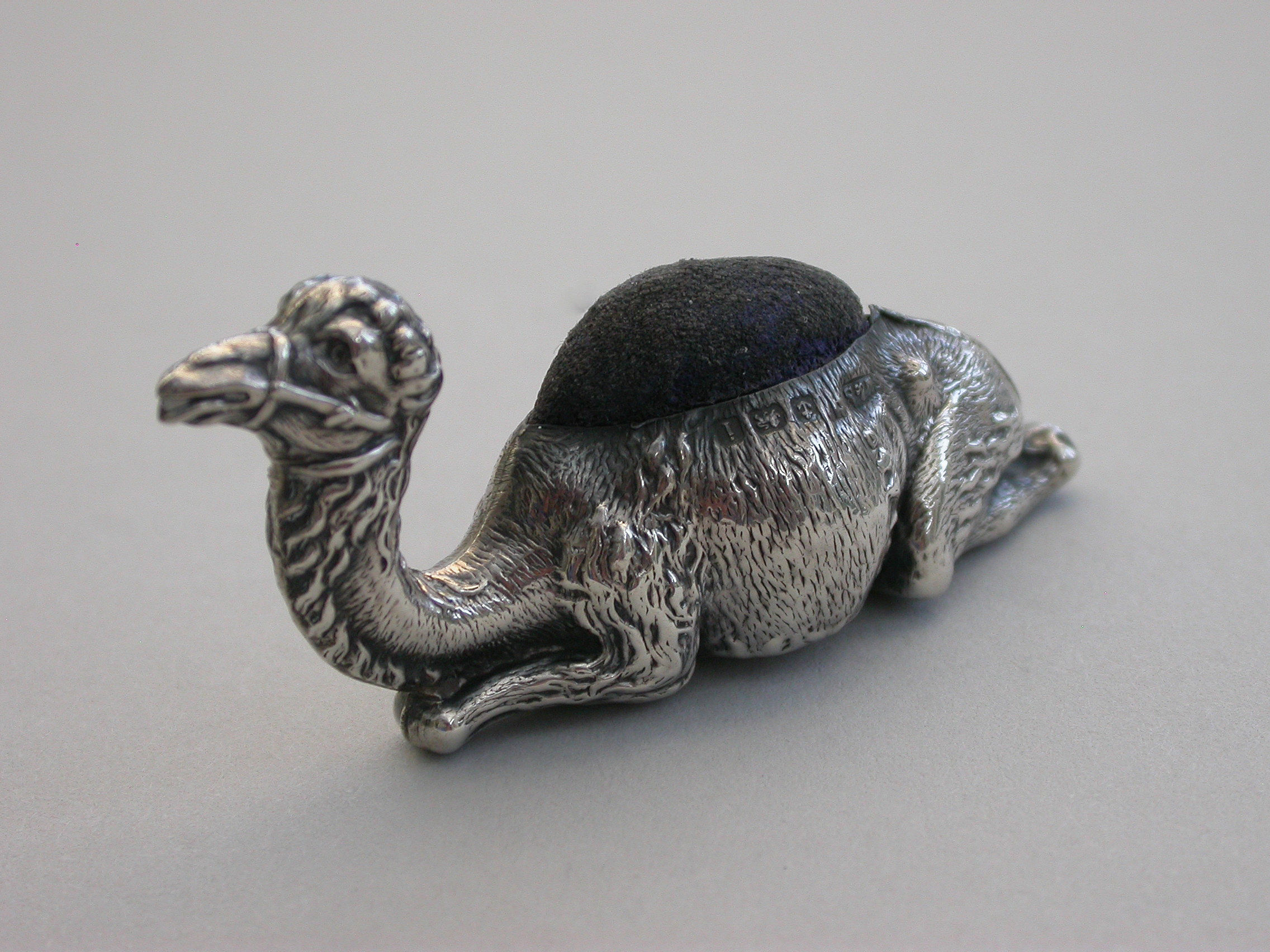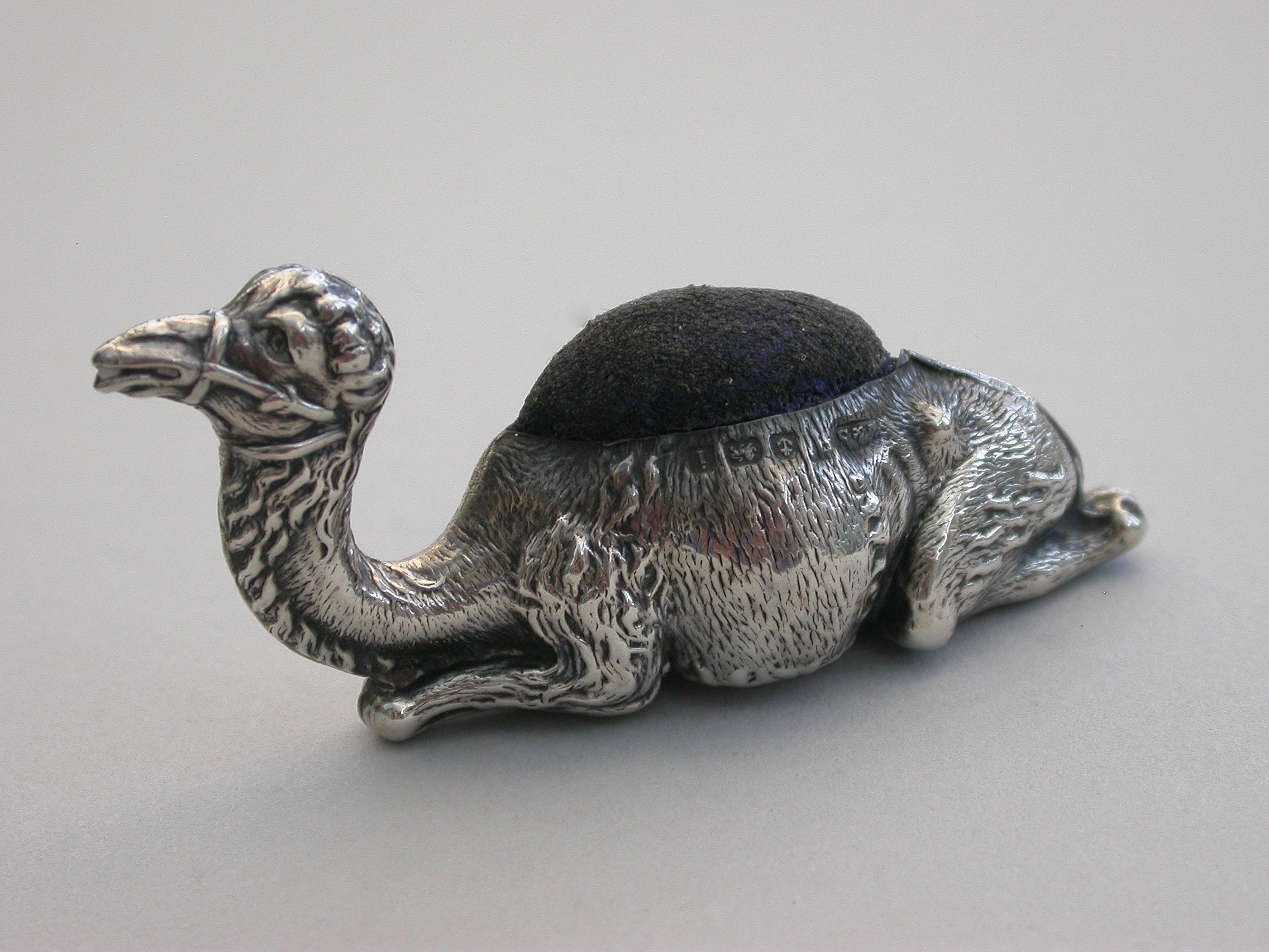 A rare Edwardian novelty silver Pin Cushion made in the form of a recumbent Camel, complete with original cushion and the smaller of the two known sizes.