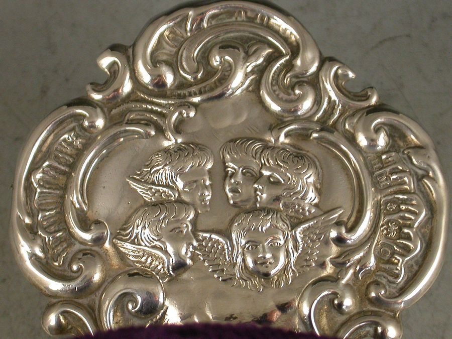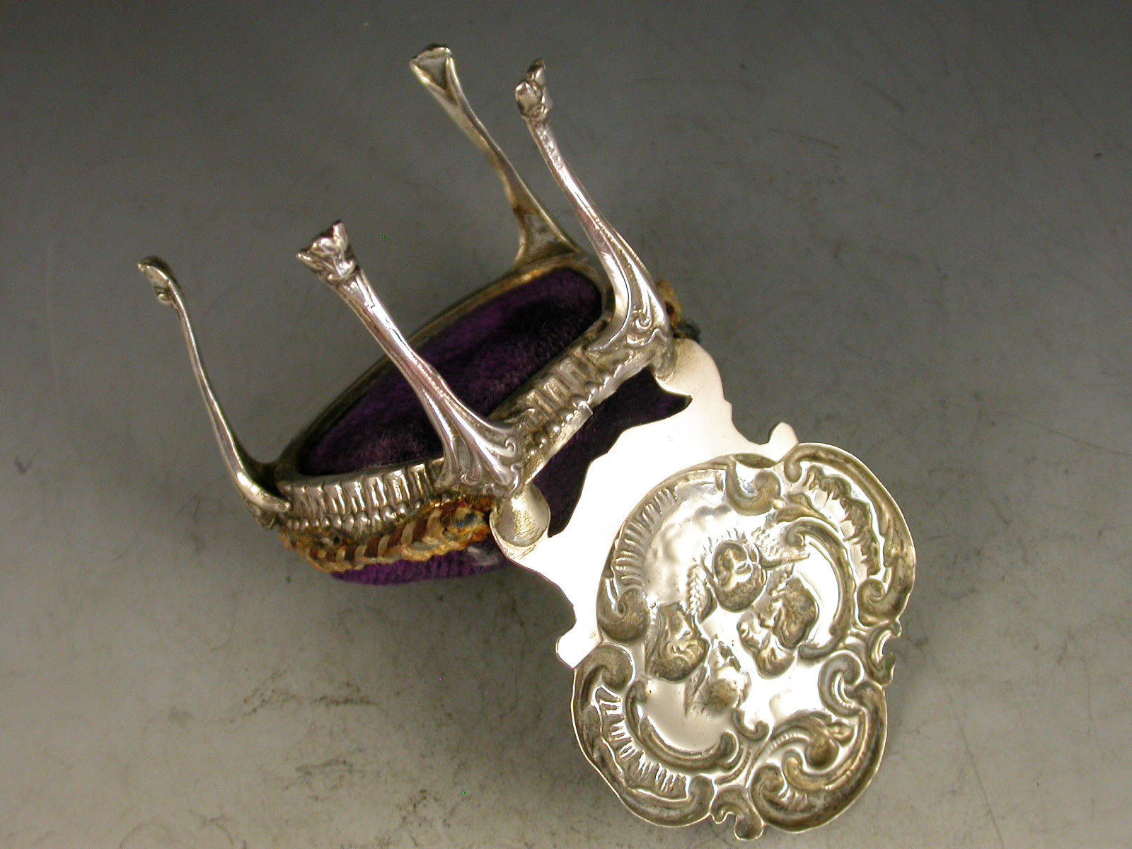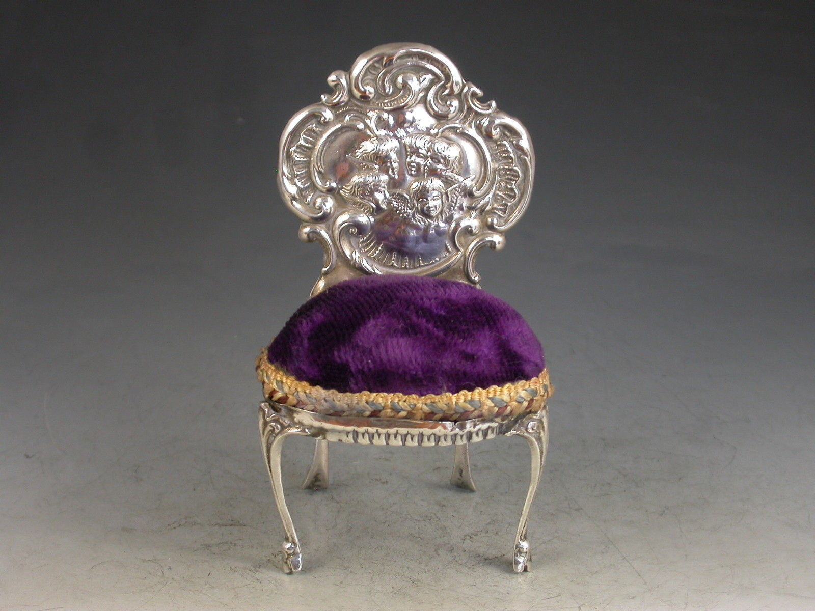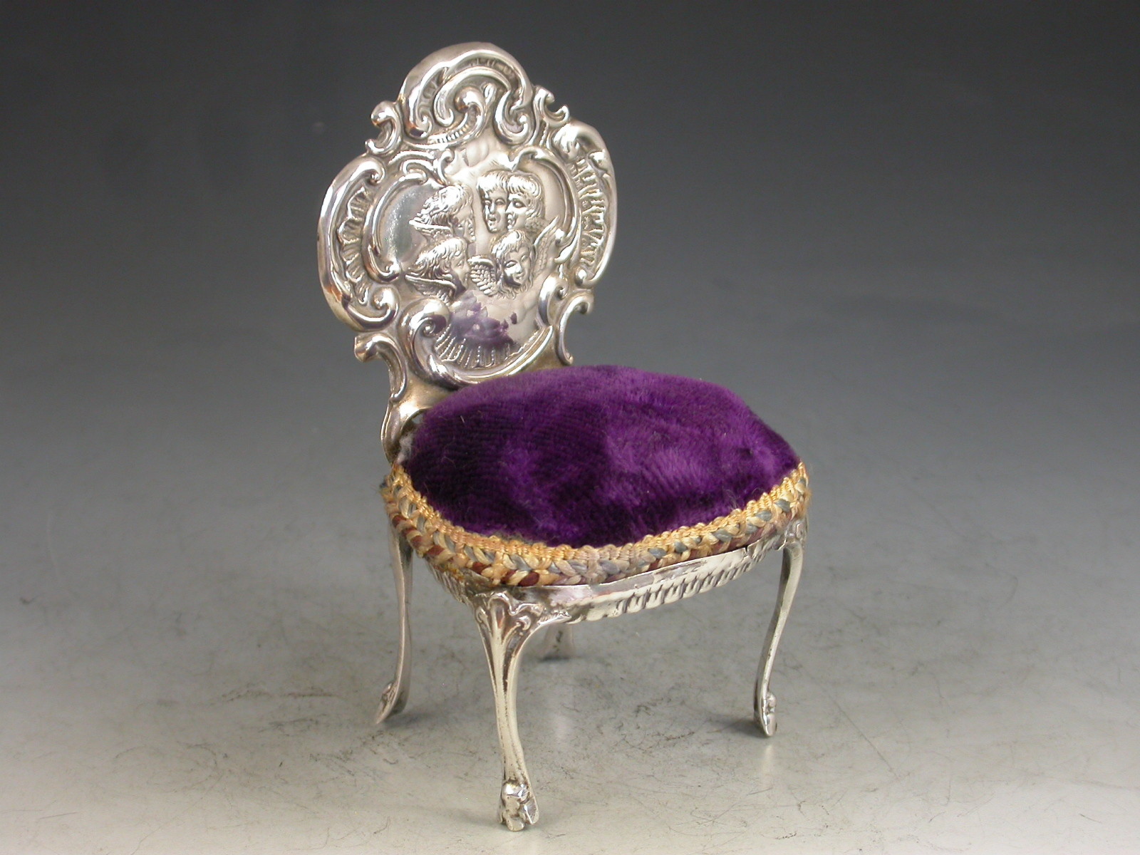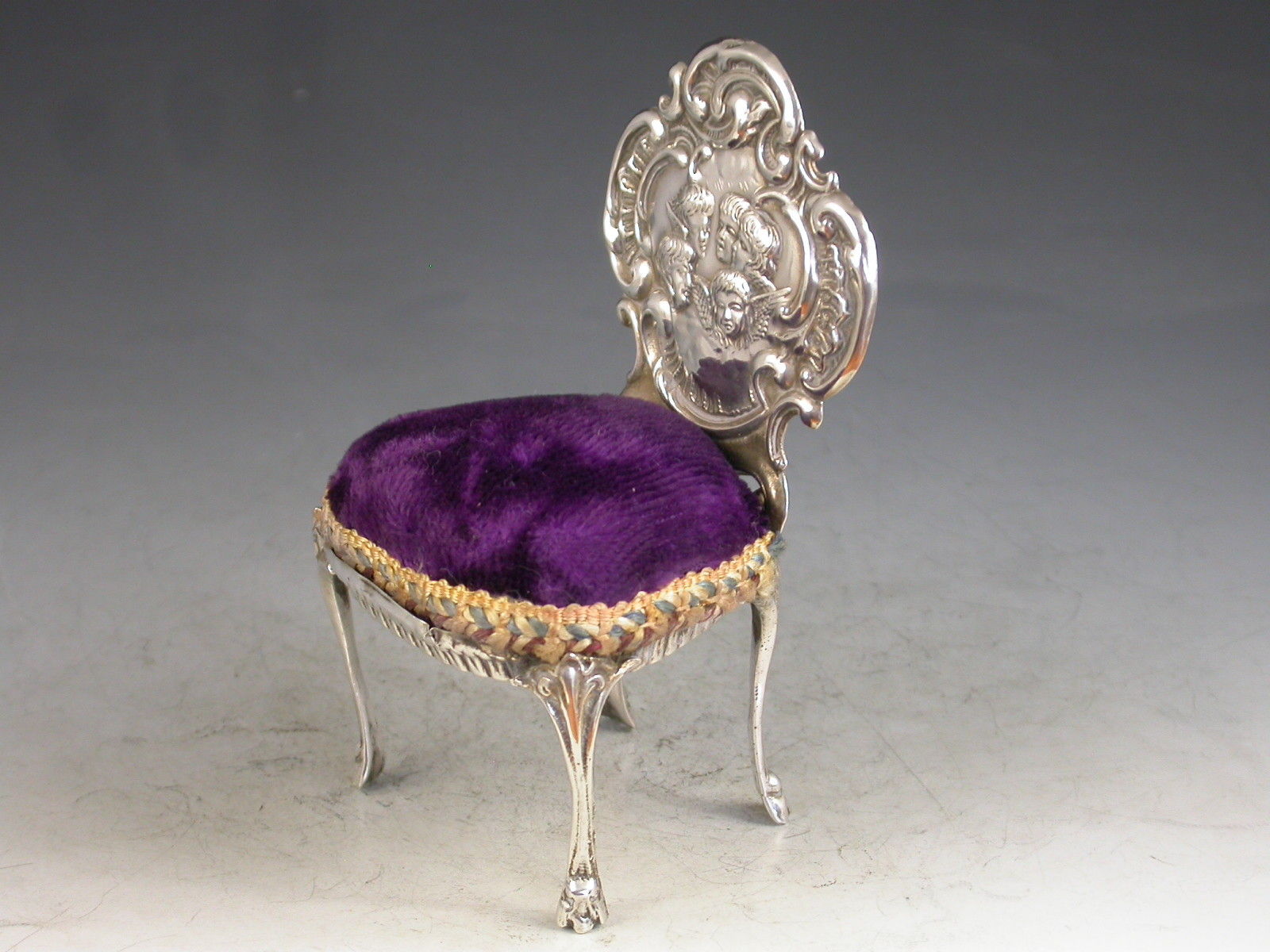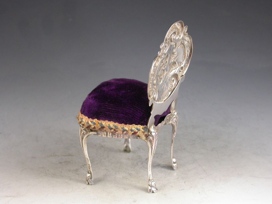 A good Edwardian novelty silver Pin Cushion made in the form of a Rococo Revival style Chair with cabriole legs and shaped back, chased and embossed with 'Reynold's Angels'. Complete with original purple velvet cushion.