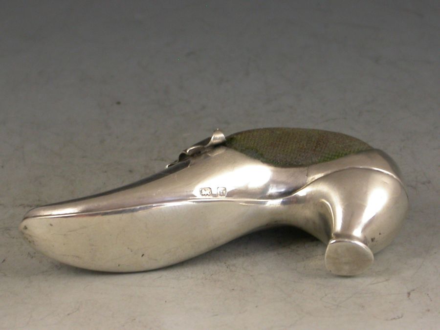 A good Edwardian novelty silver Pin Cushion made in the form of a high heeled fancy shoe with applied buckle and ribbon. Complete with original cushion.