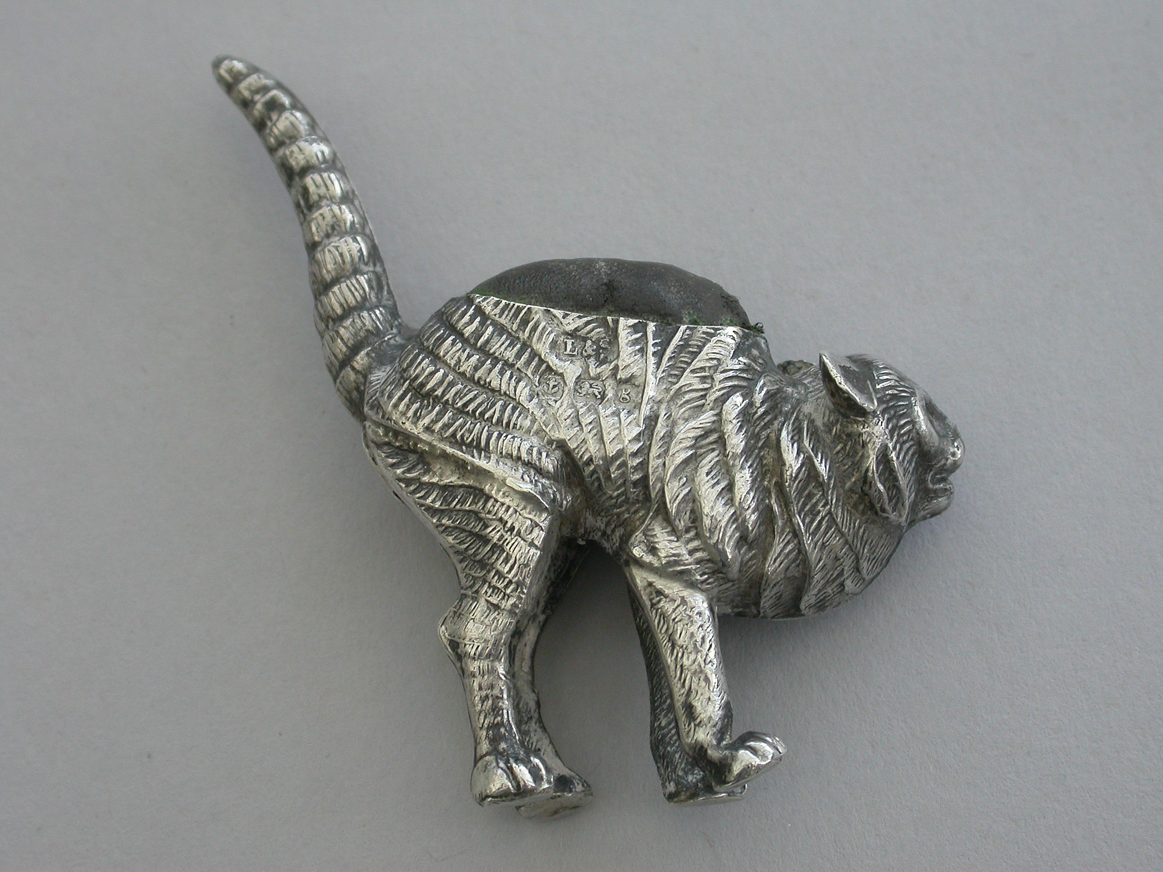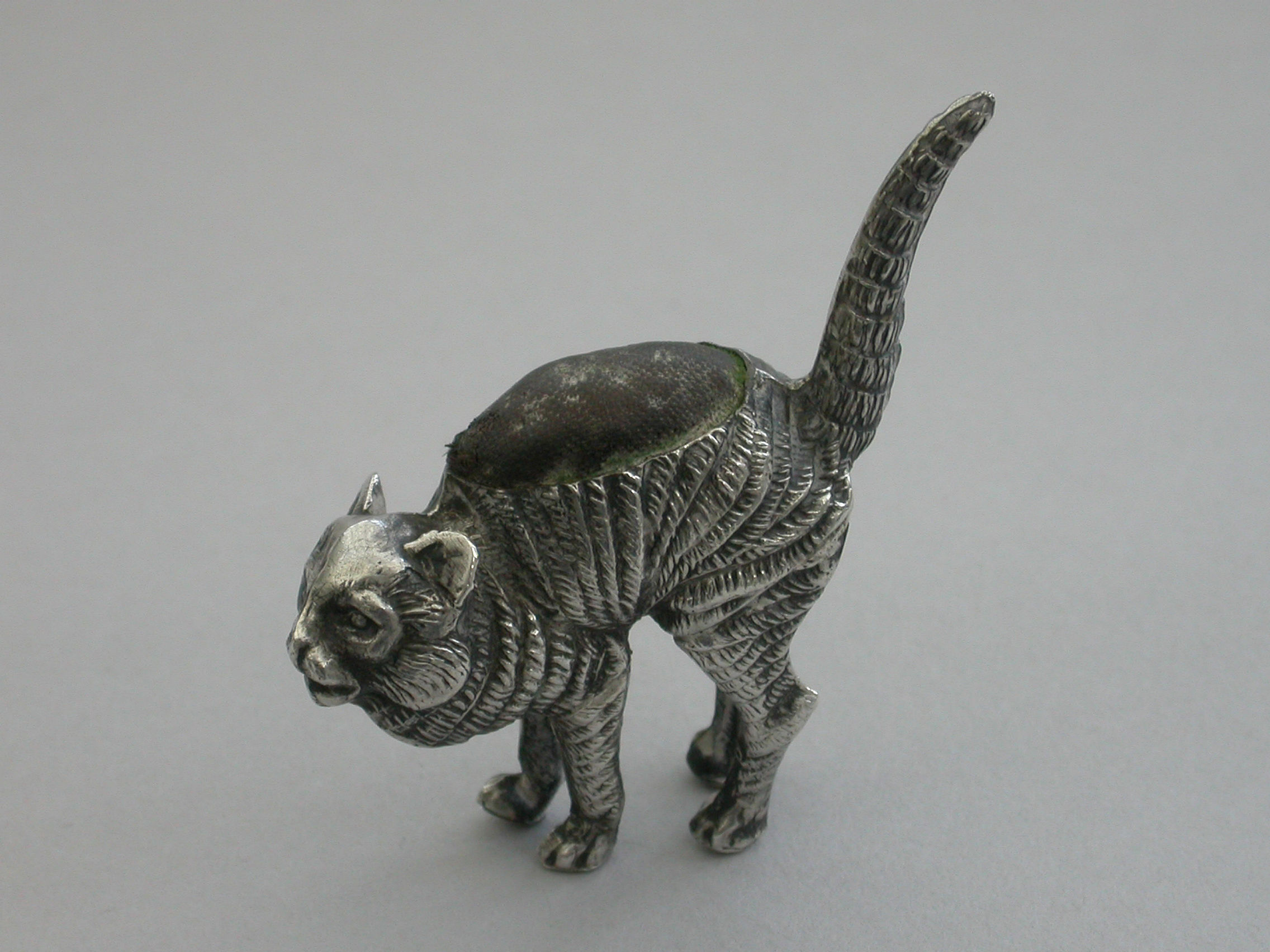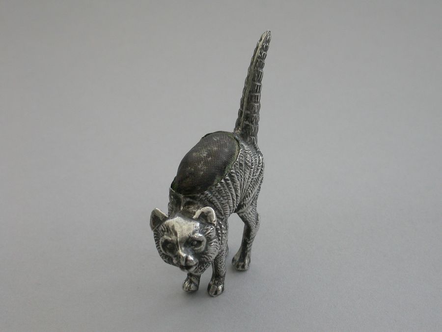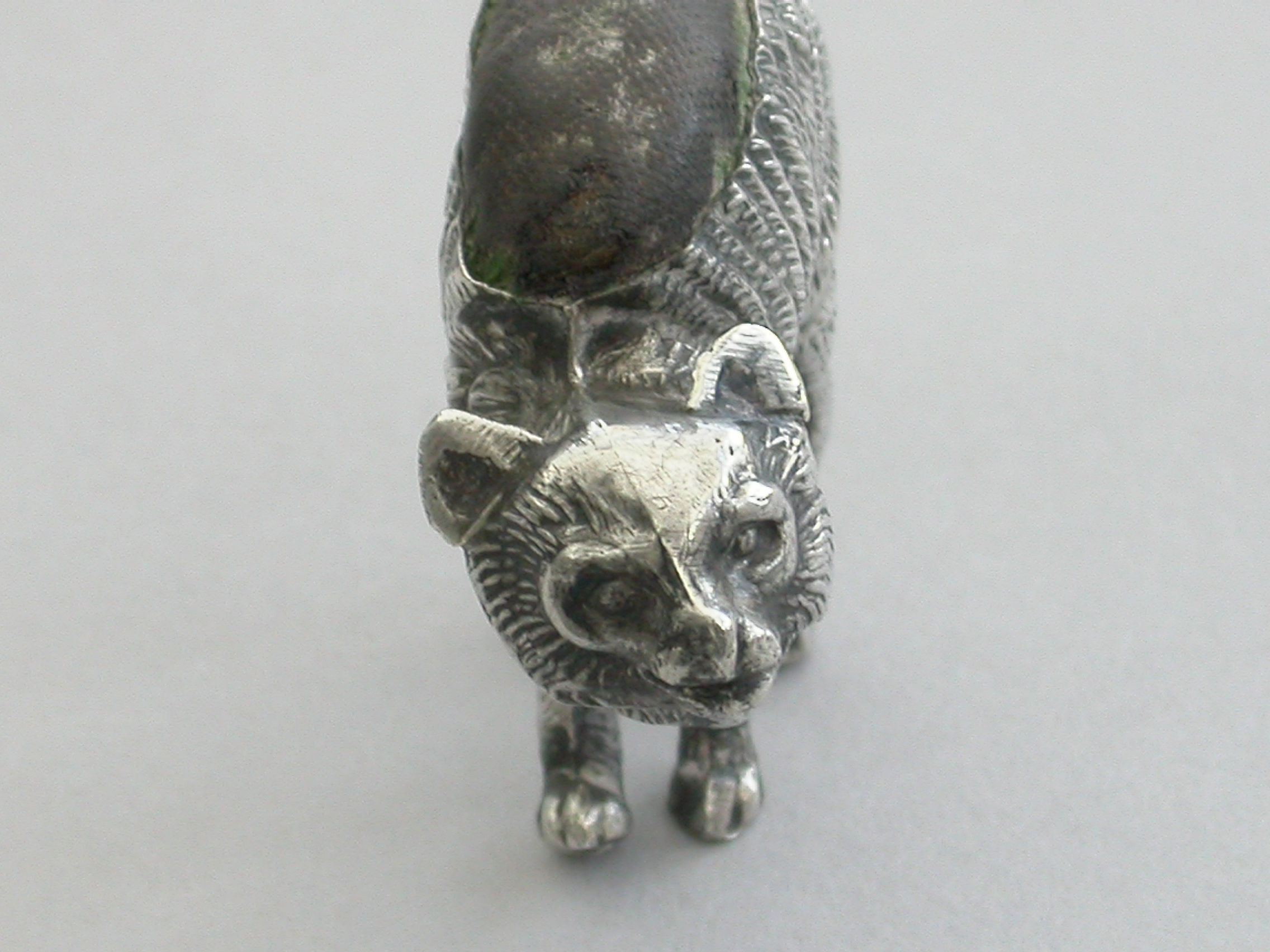 An extremely rare Edwardian novelty silver Pin Cushion made in the form of a startled Cat. Complete with original cushion.
