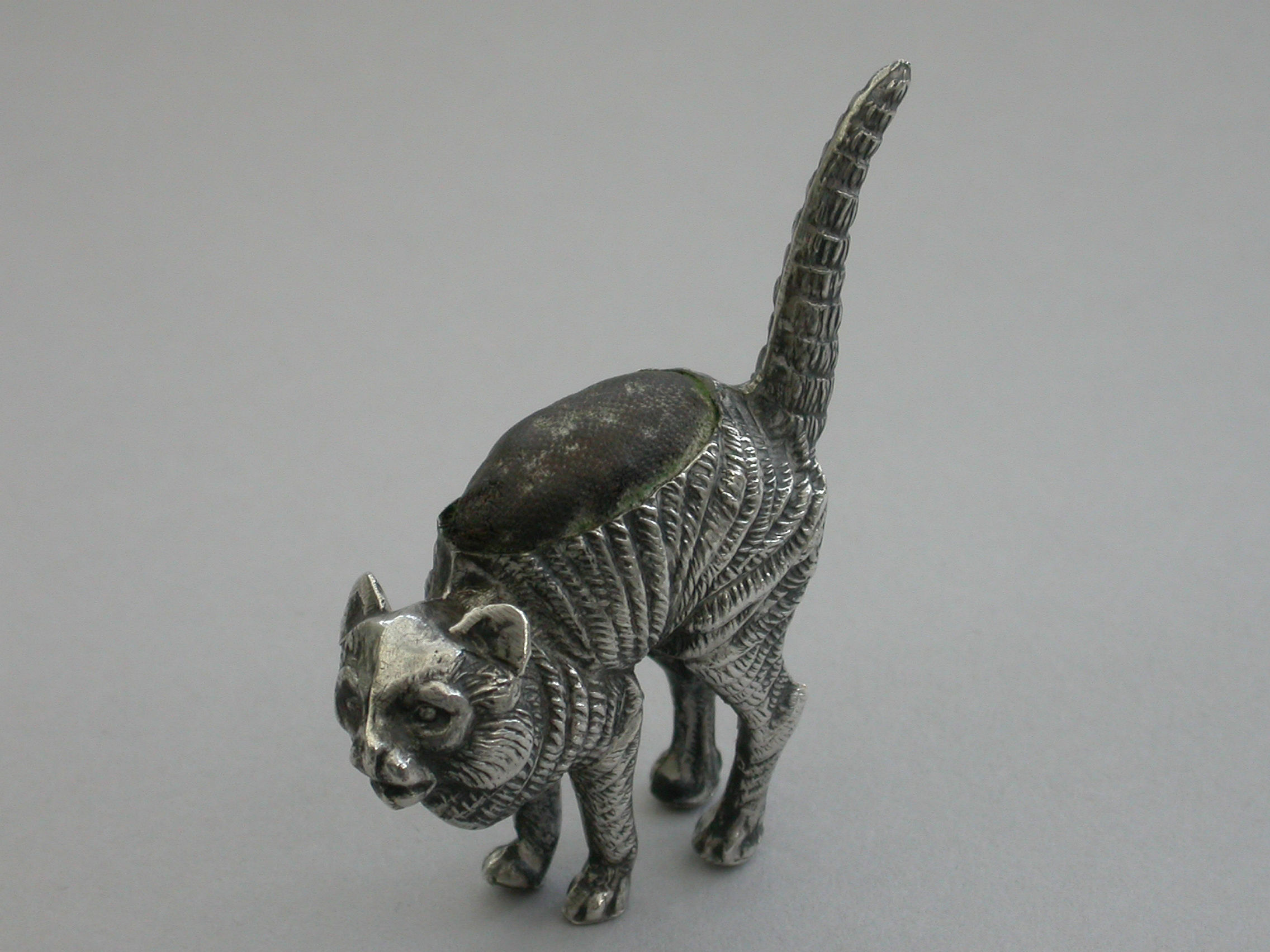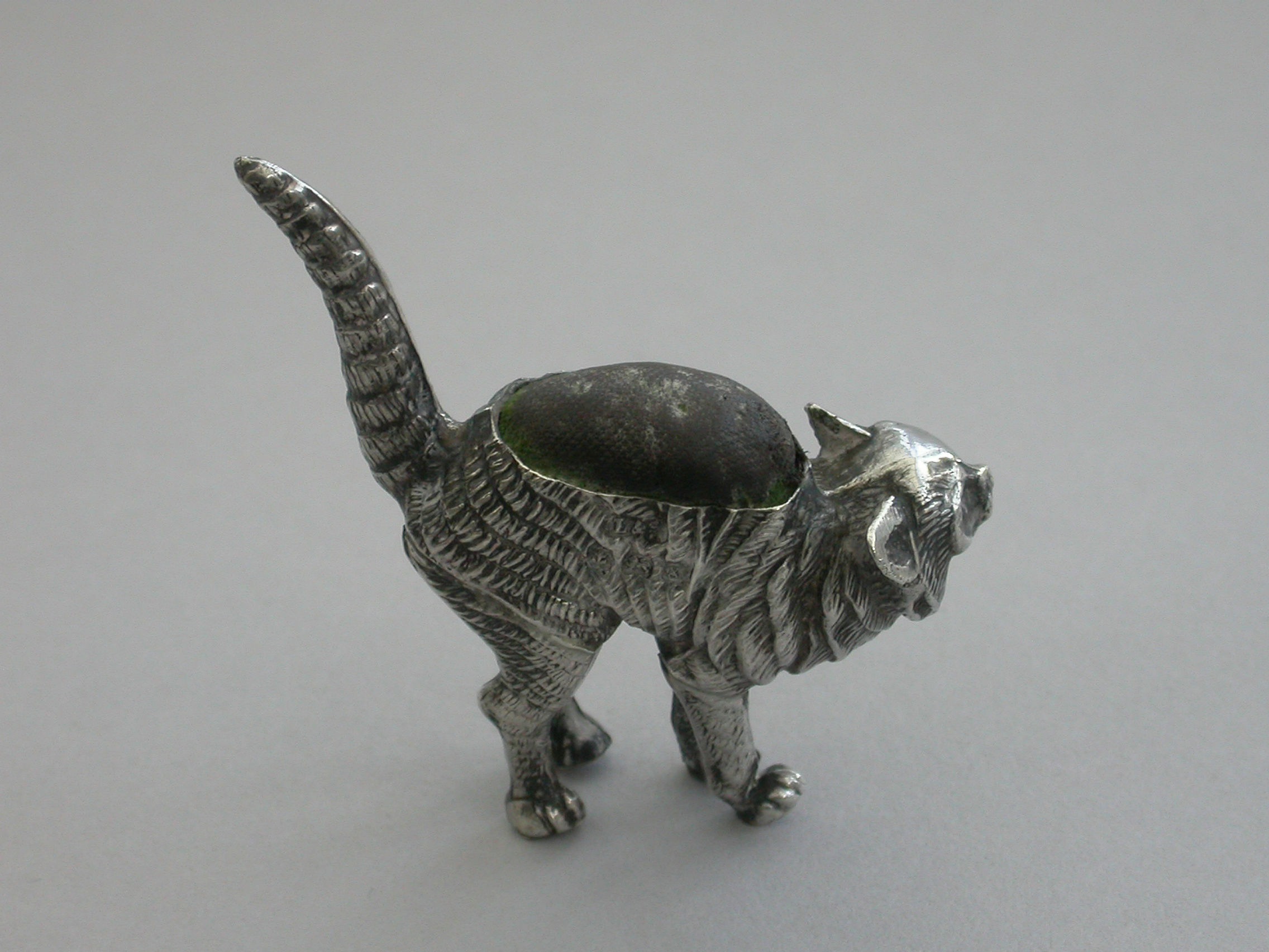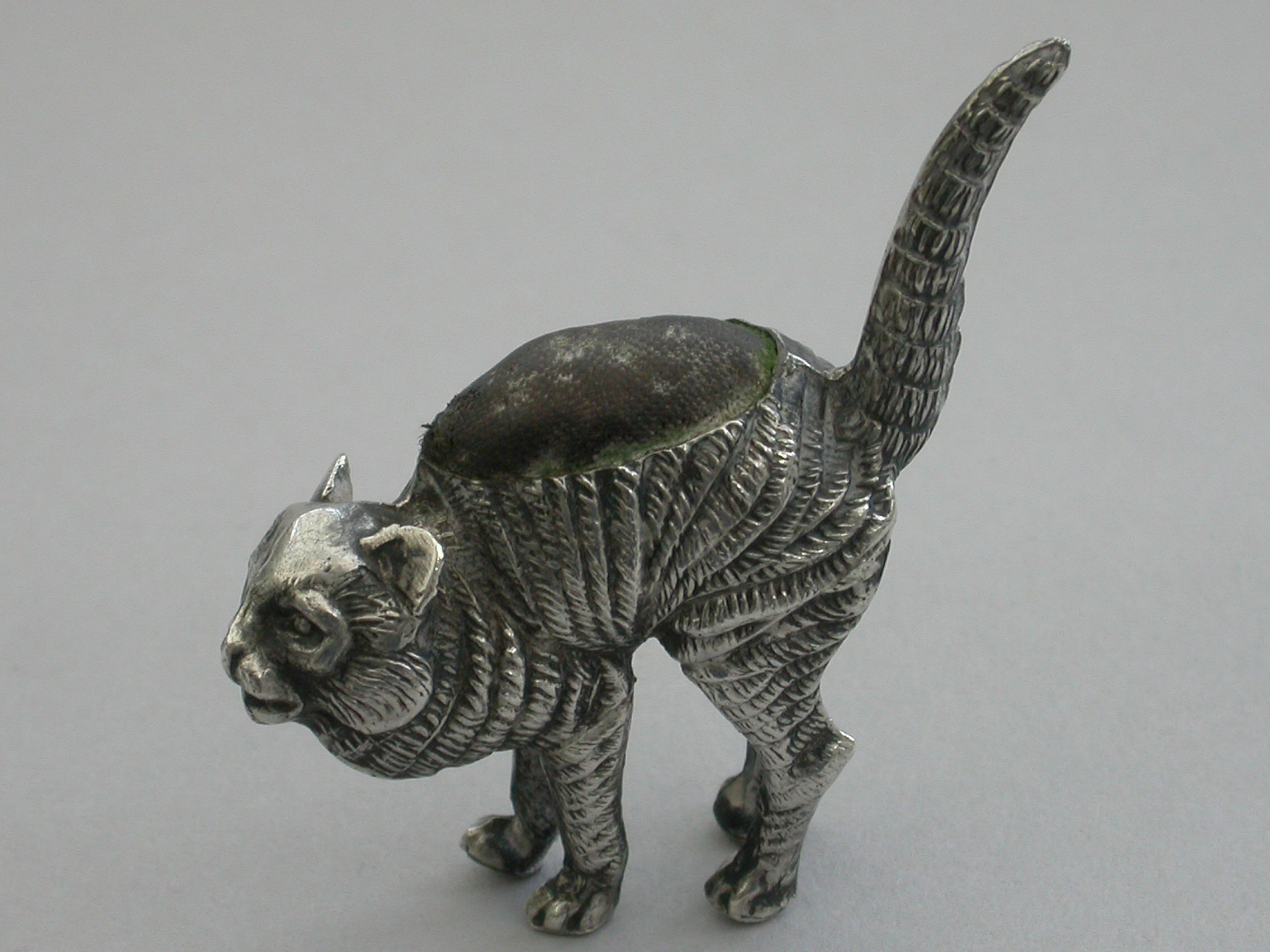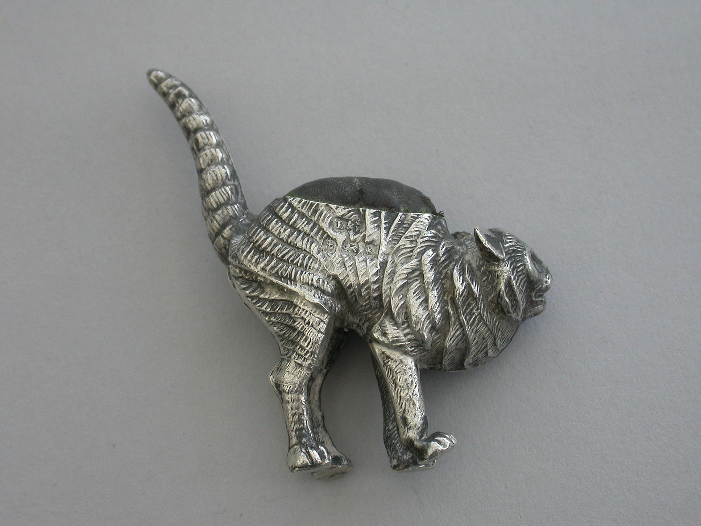 An extremely rare Edwardian novelty silver Pin Cushion made in the form of a startled Cat. Complete with original cushion.