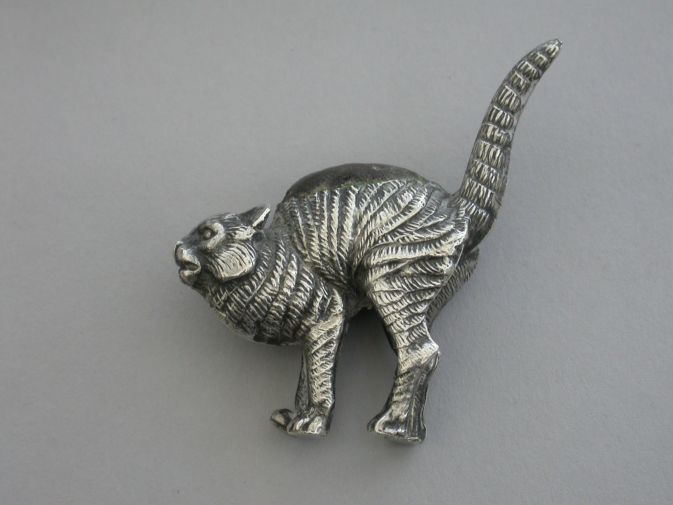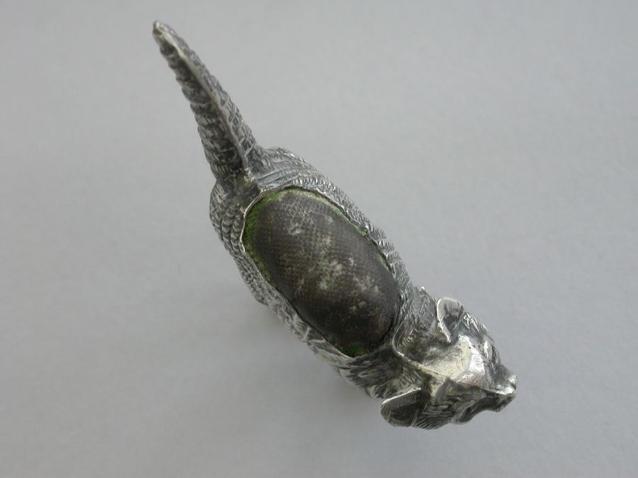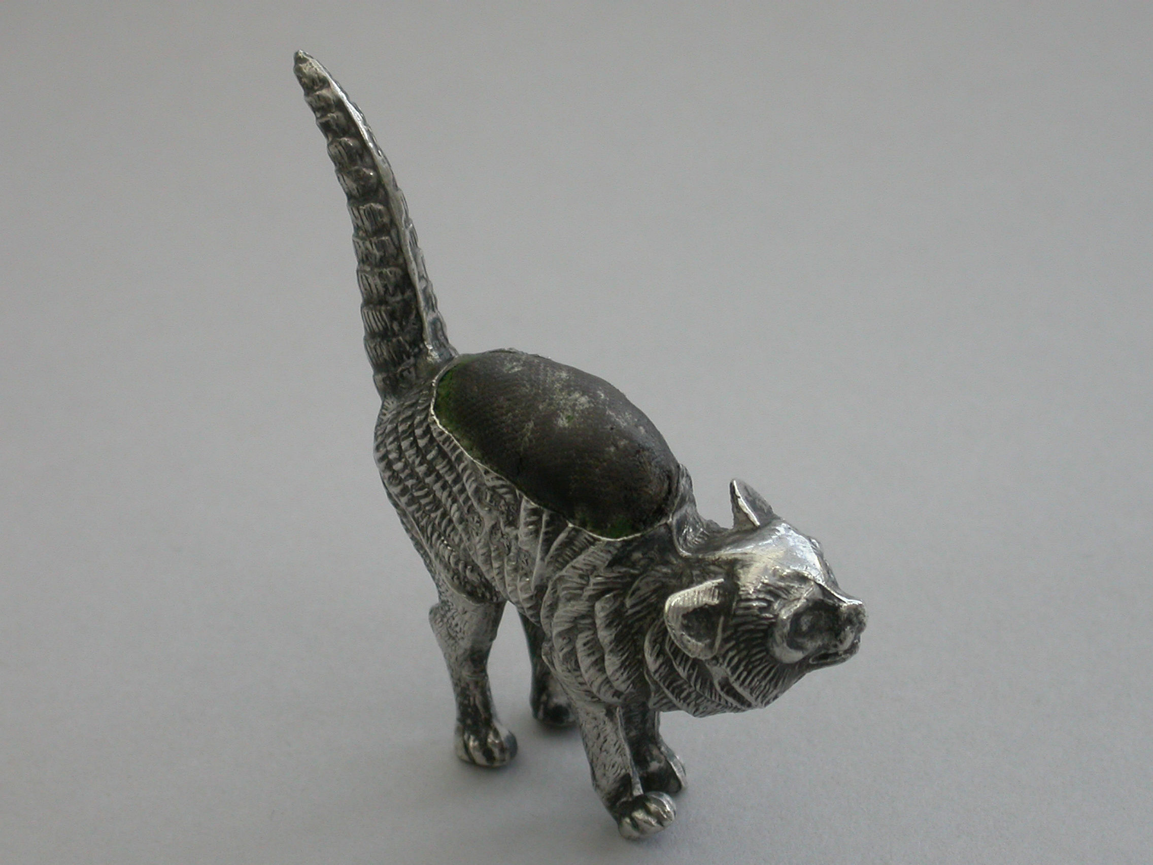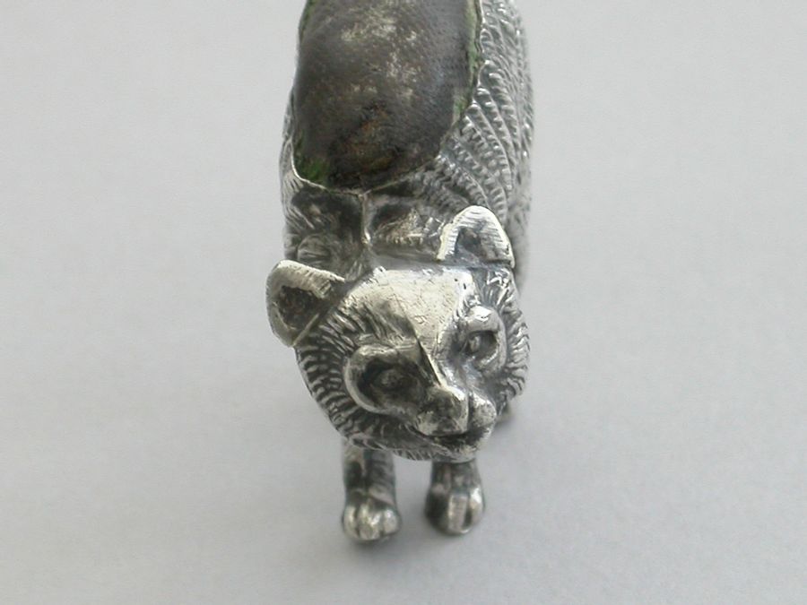 An extremely rare Edwardian novelty silver Pin Cushion made in the form of a startled Cat. Complete with original cushion.