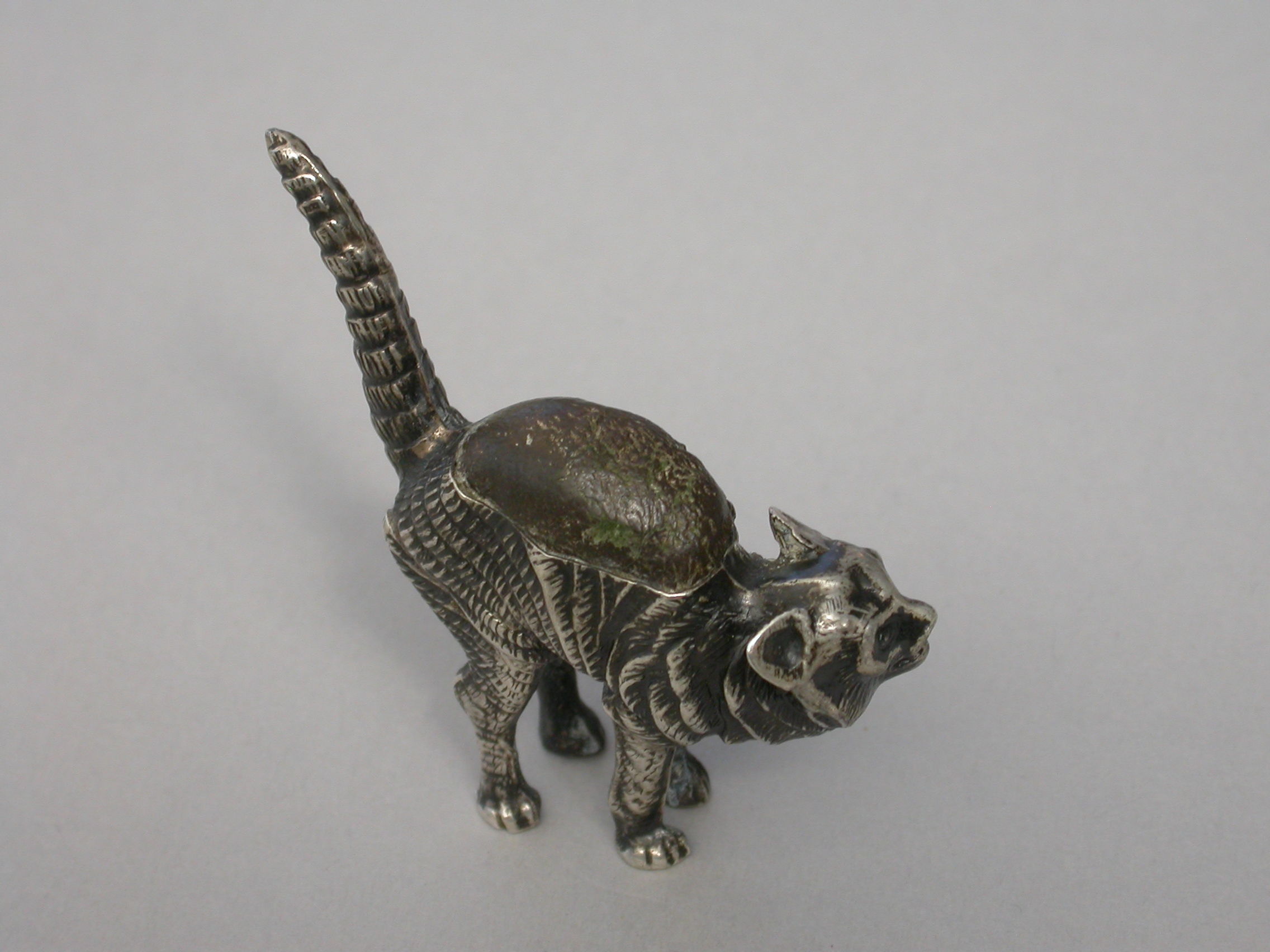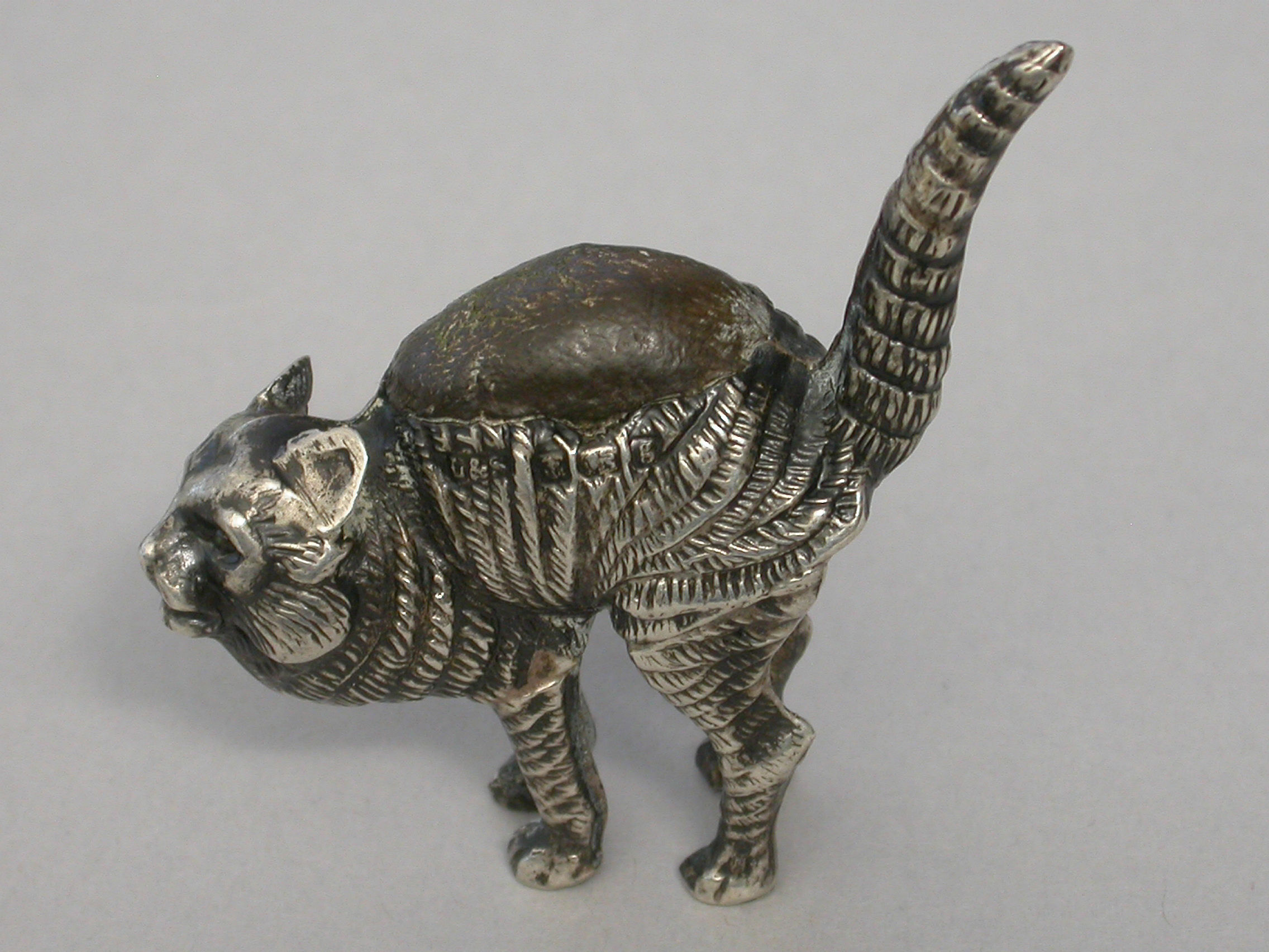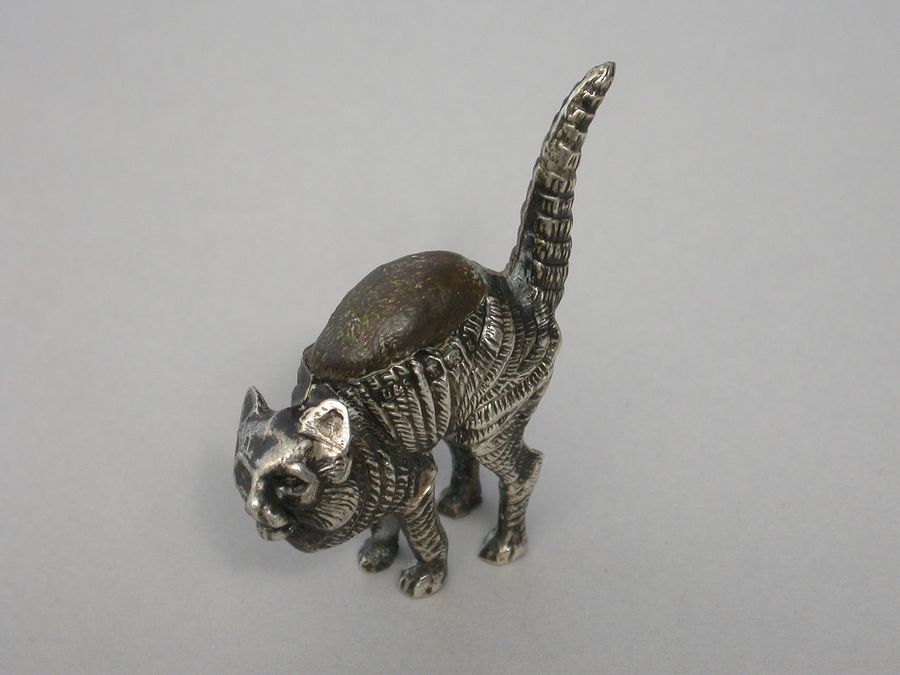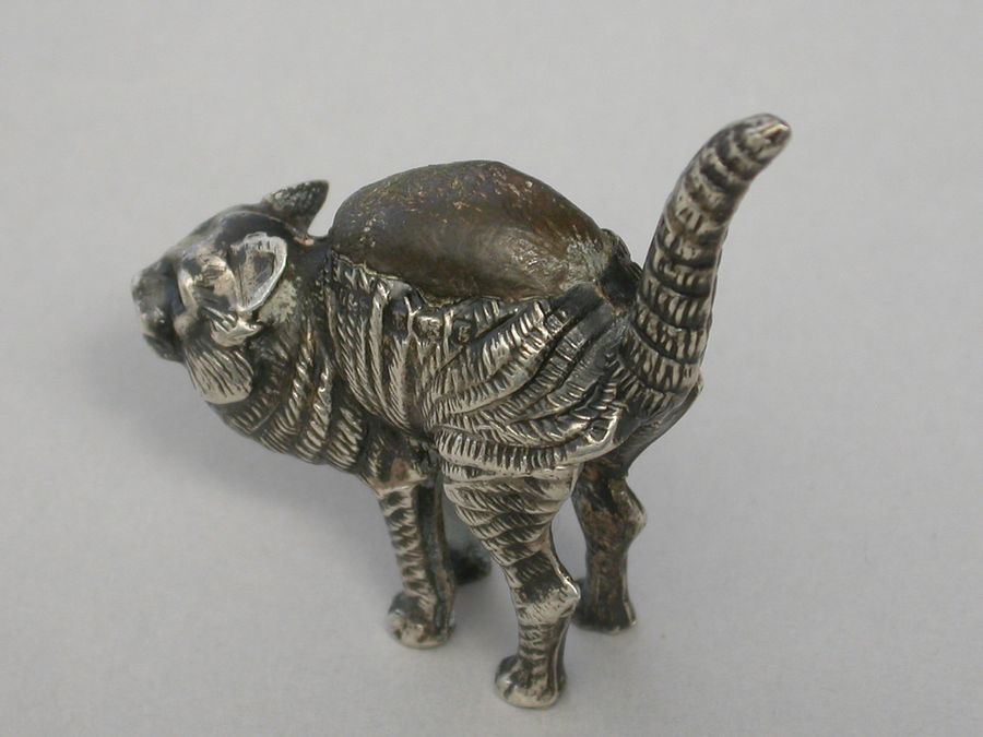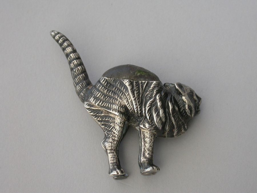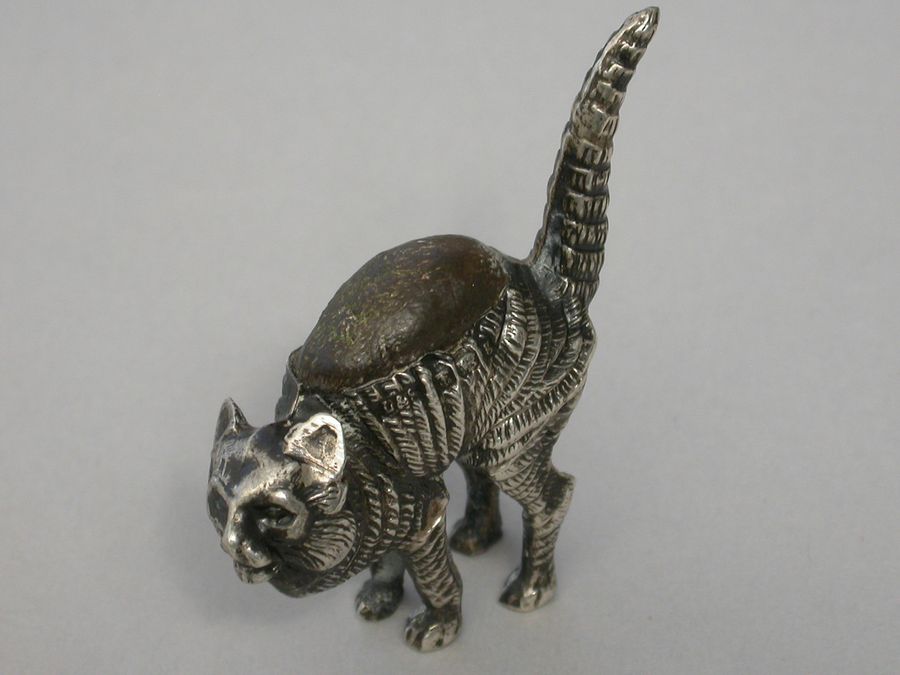 An extremely rare Edwardian novelty silver Pin Cushion made in the form of a startled Cat. Complete with original cushion.