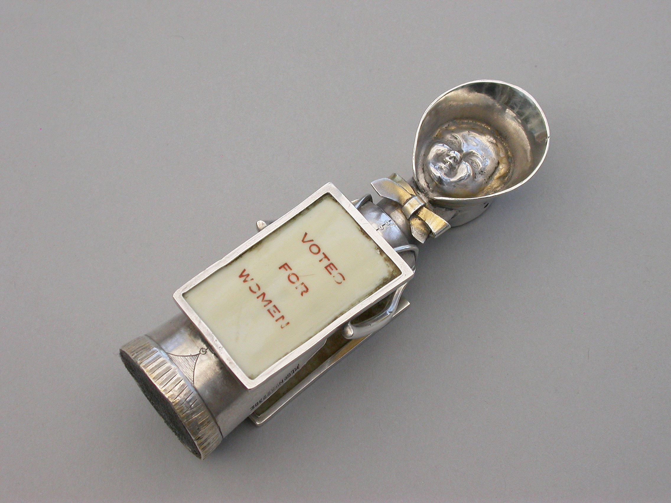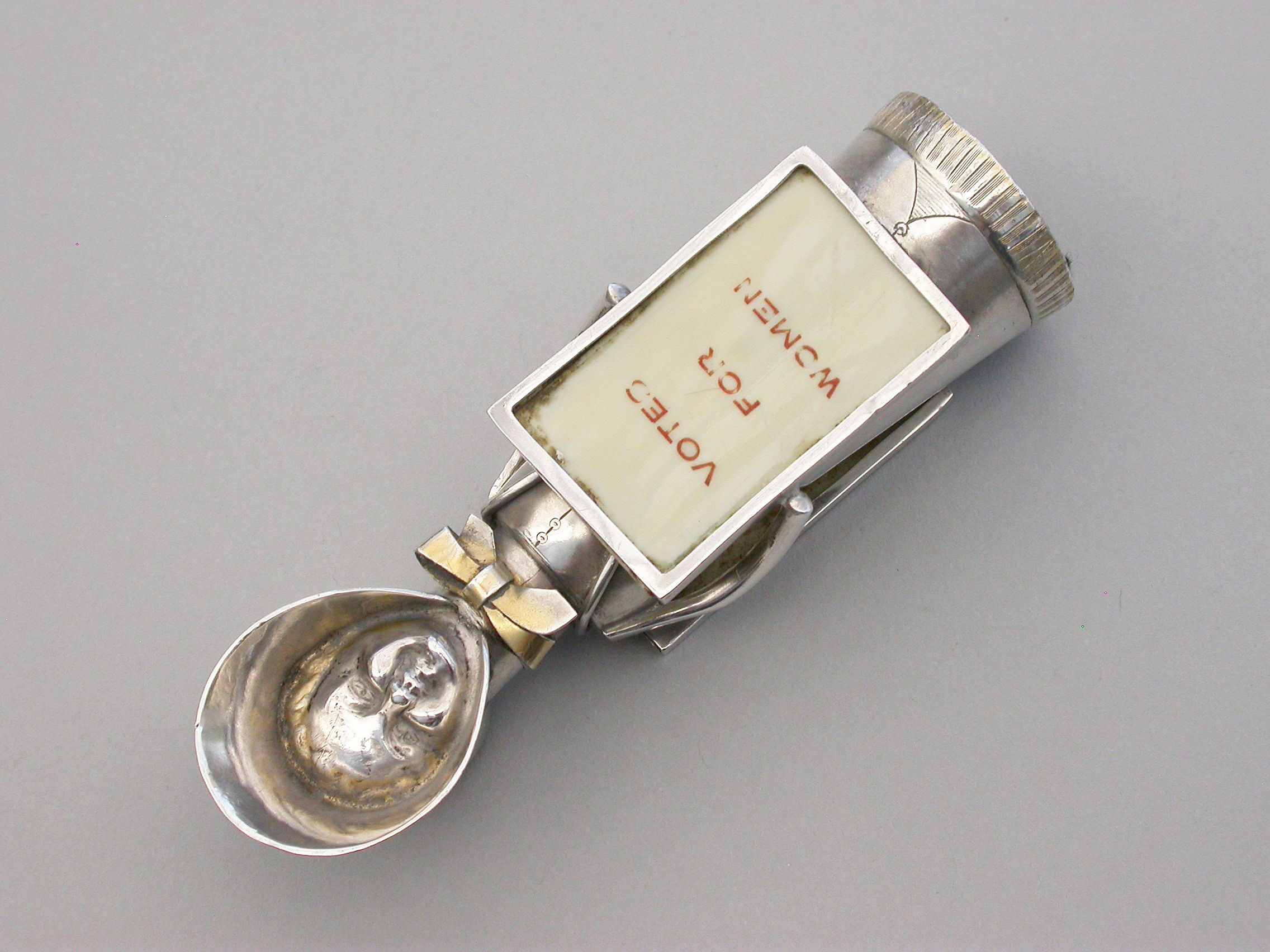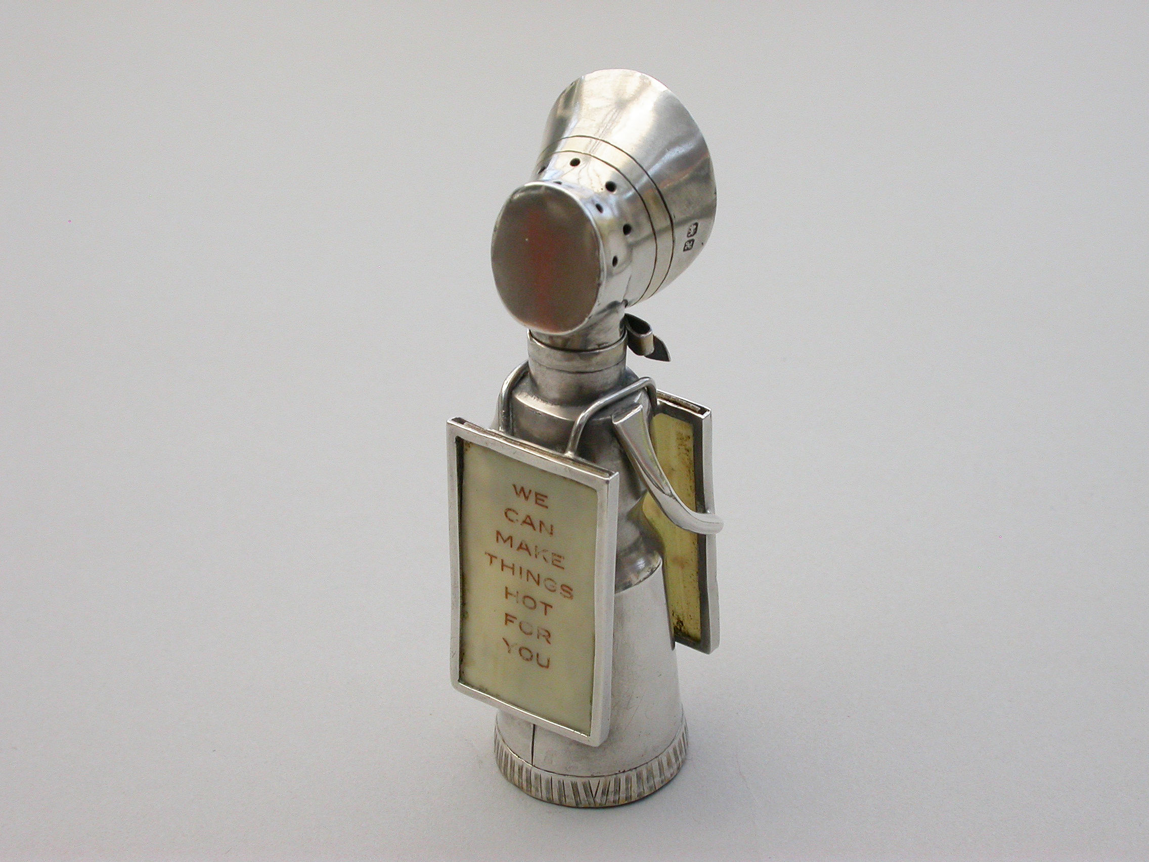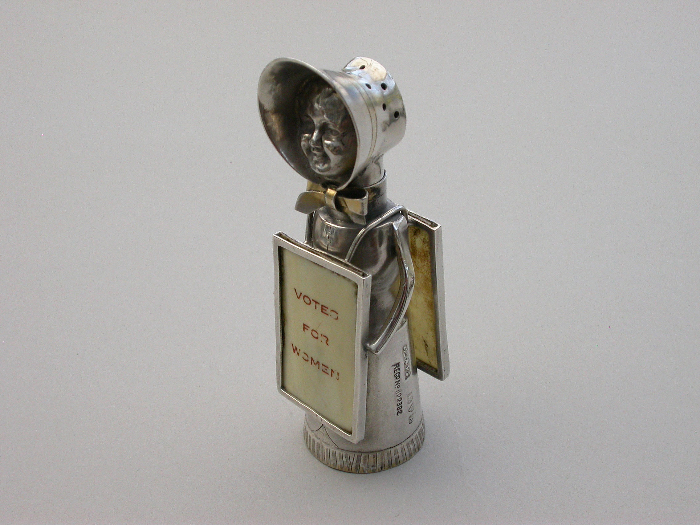 An extremely rare Edwardian novelty silver Pepper made in the form of a Suffragette holding two painted placards with the legends; ""Votes for Women"" and ""We can make things hot for you"". The pull-off lid with pierced bonnet.
