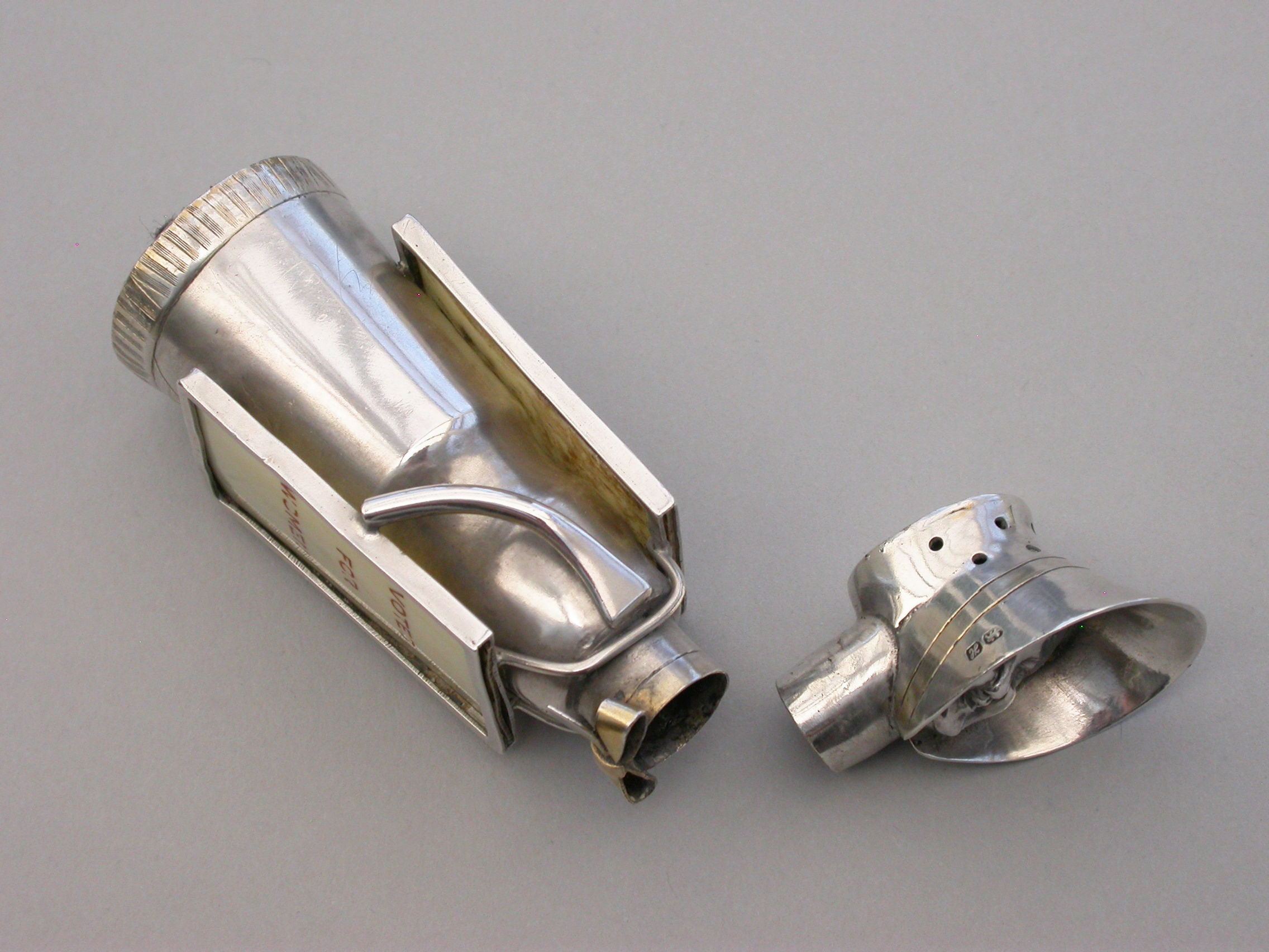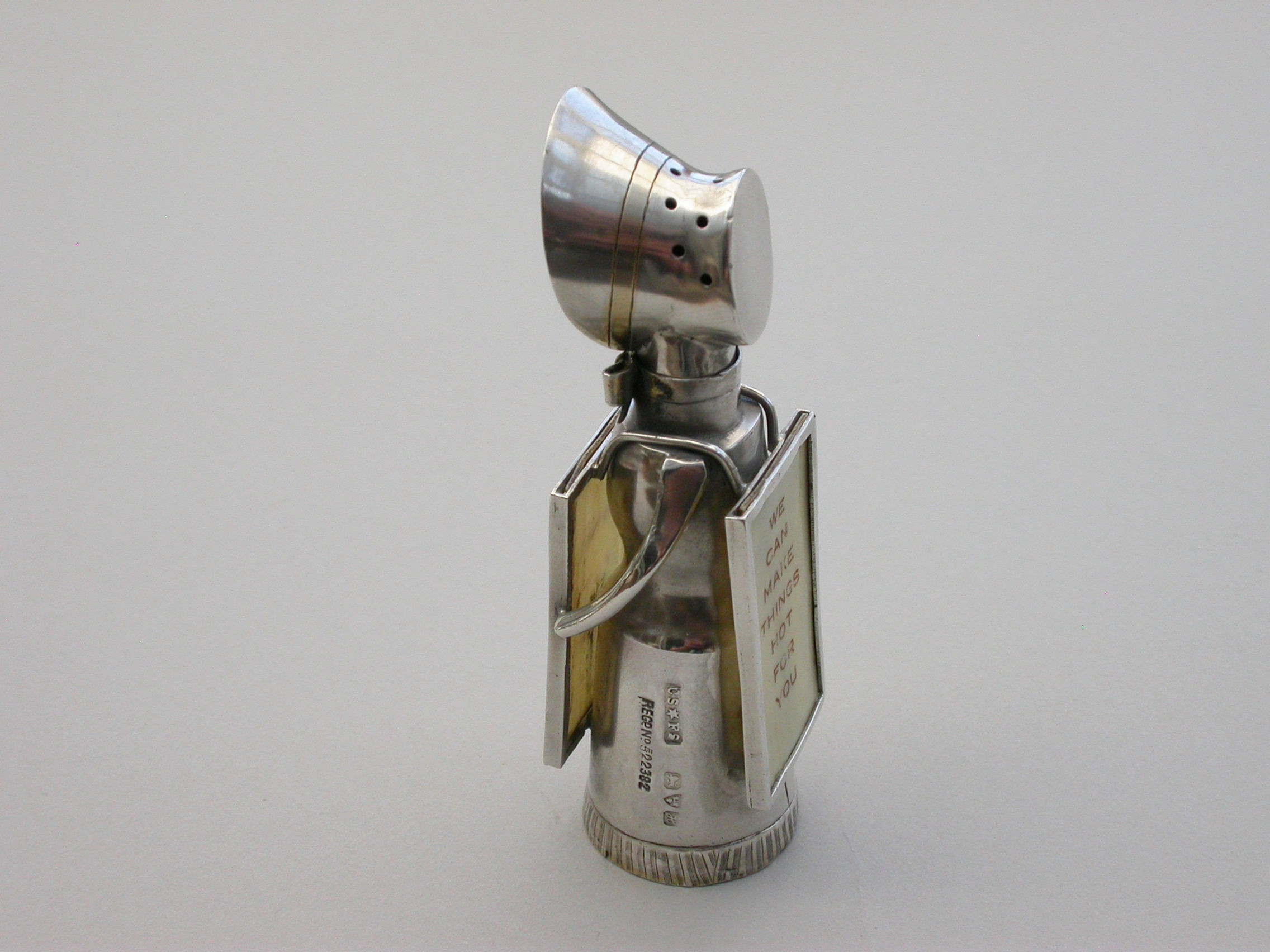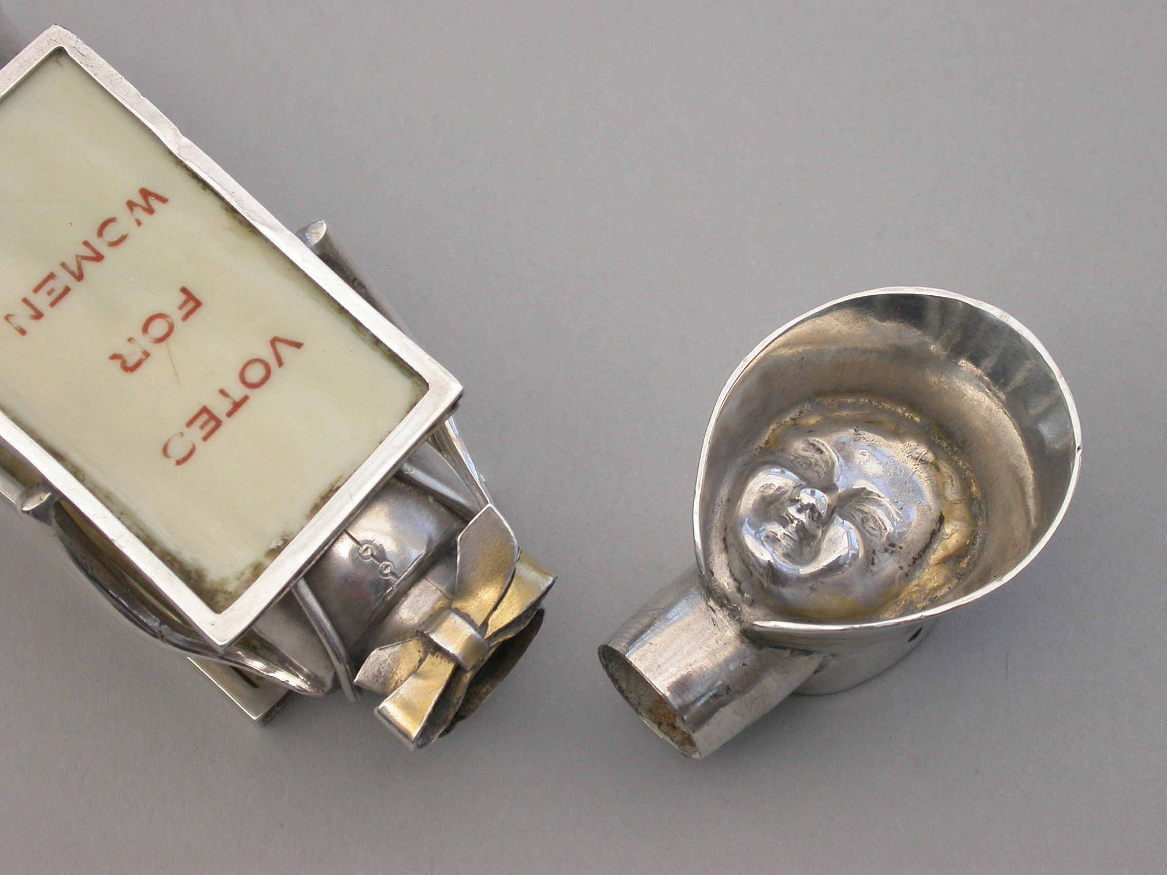 An extremely rare Edwardian novelty silver Pepper made in the form of a Suffragette holding two painted placards with the legends; ""Votes for Women"" and ""We can make things hot for you"". The pull-off lid with pierced bonnet.