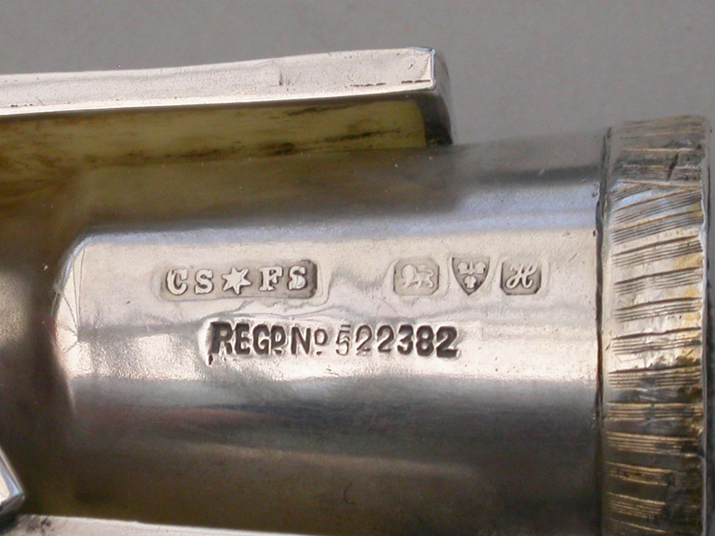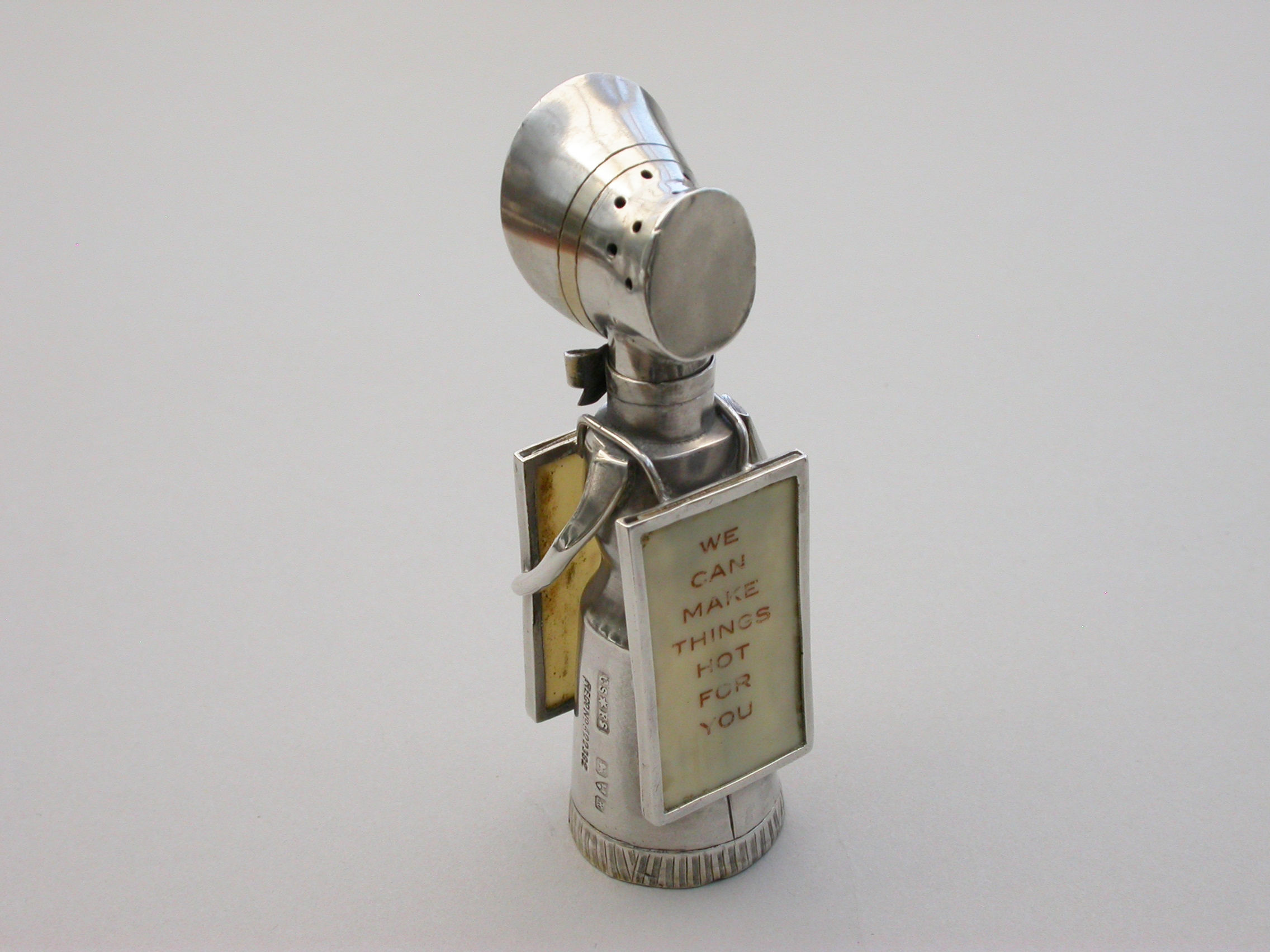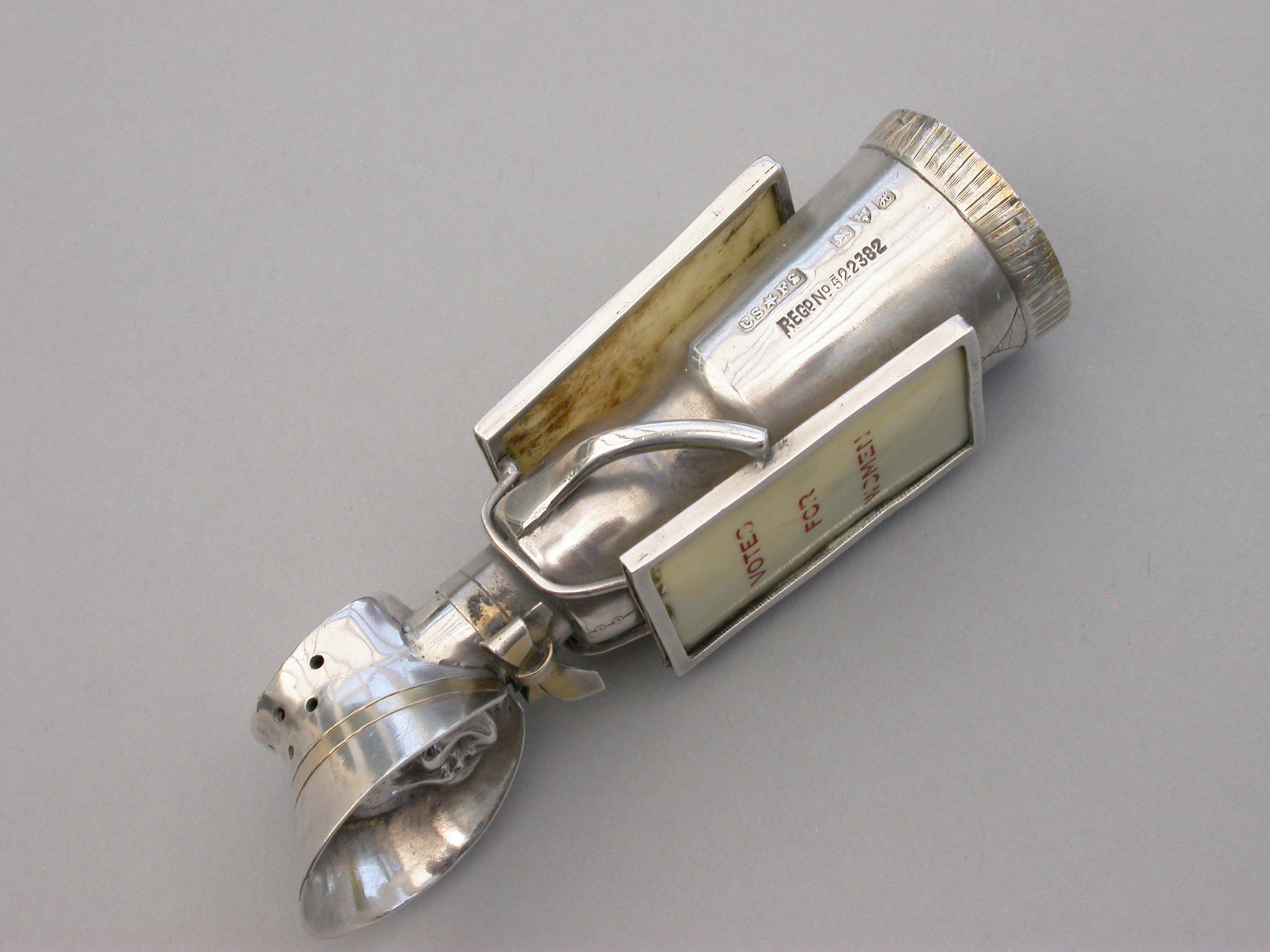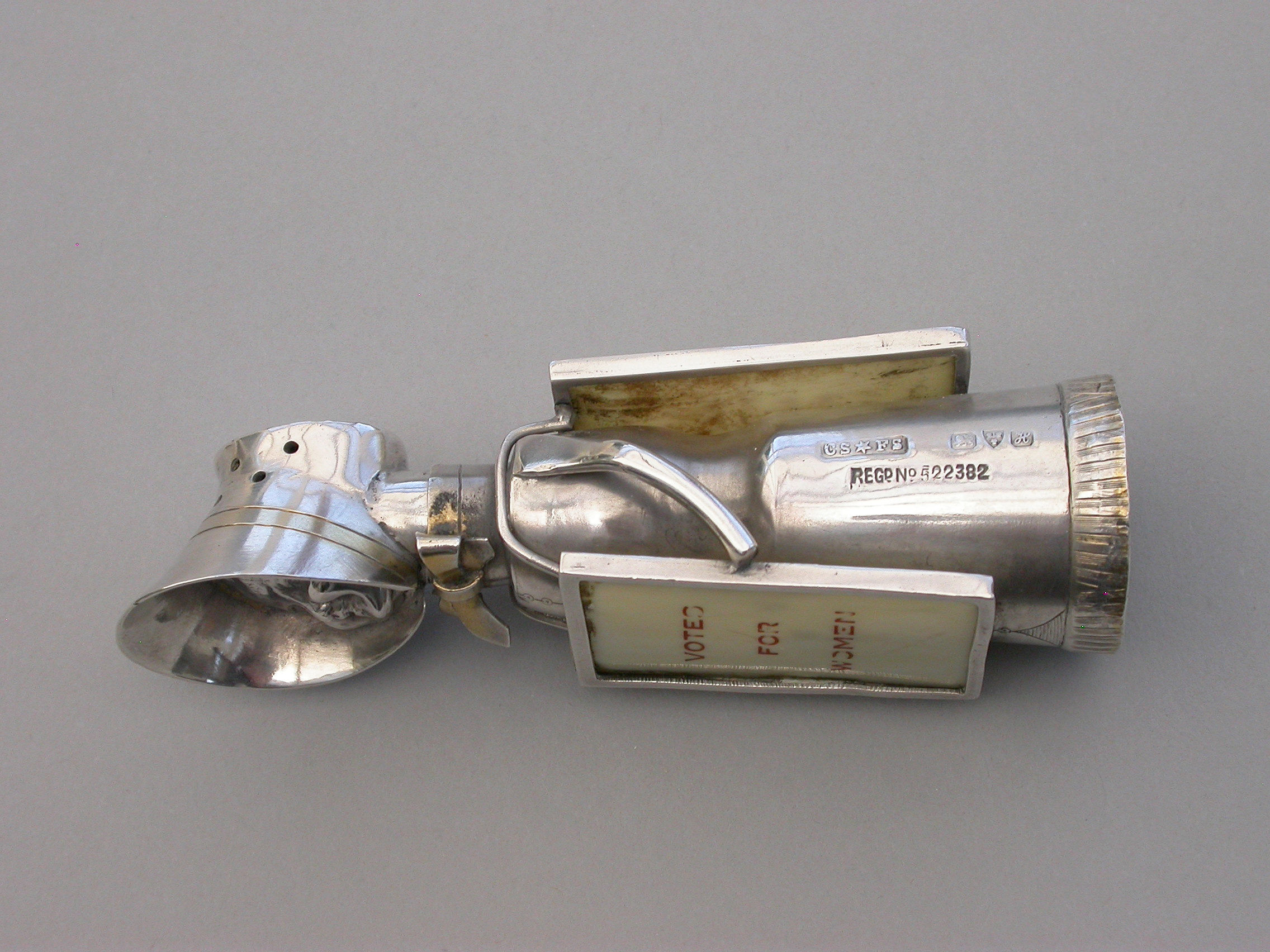 An extremely rare Edwardian novelty silver Pepper made in the form of a Suffragette holding two painted placards with the legends; ""Votes for Women"" and ""We can make things hot for you"". The pull-off lid with pierced bonnet.