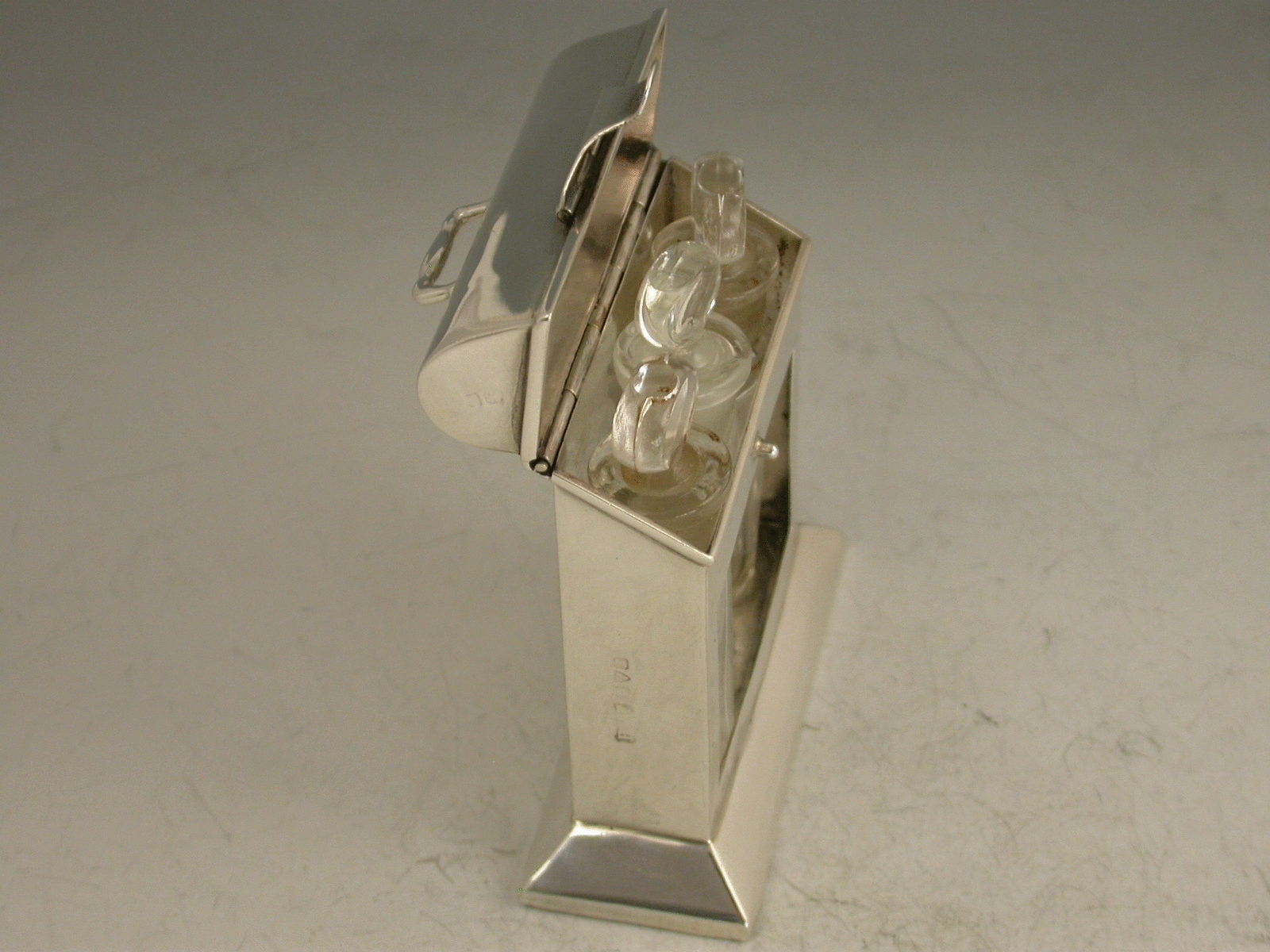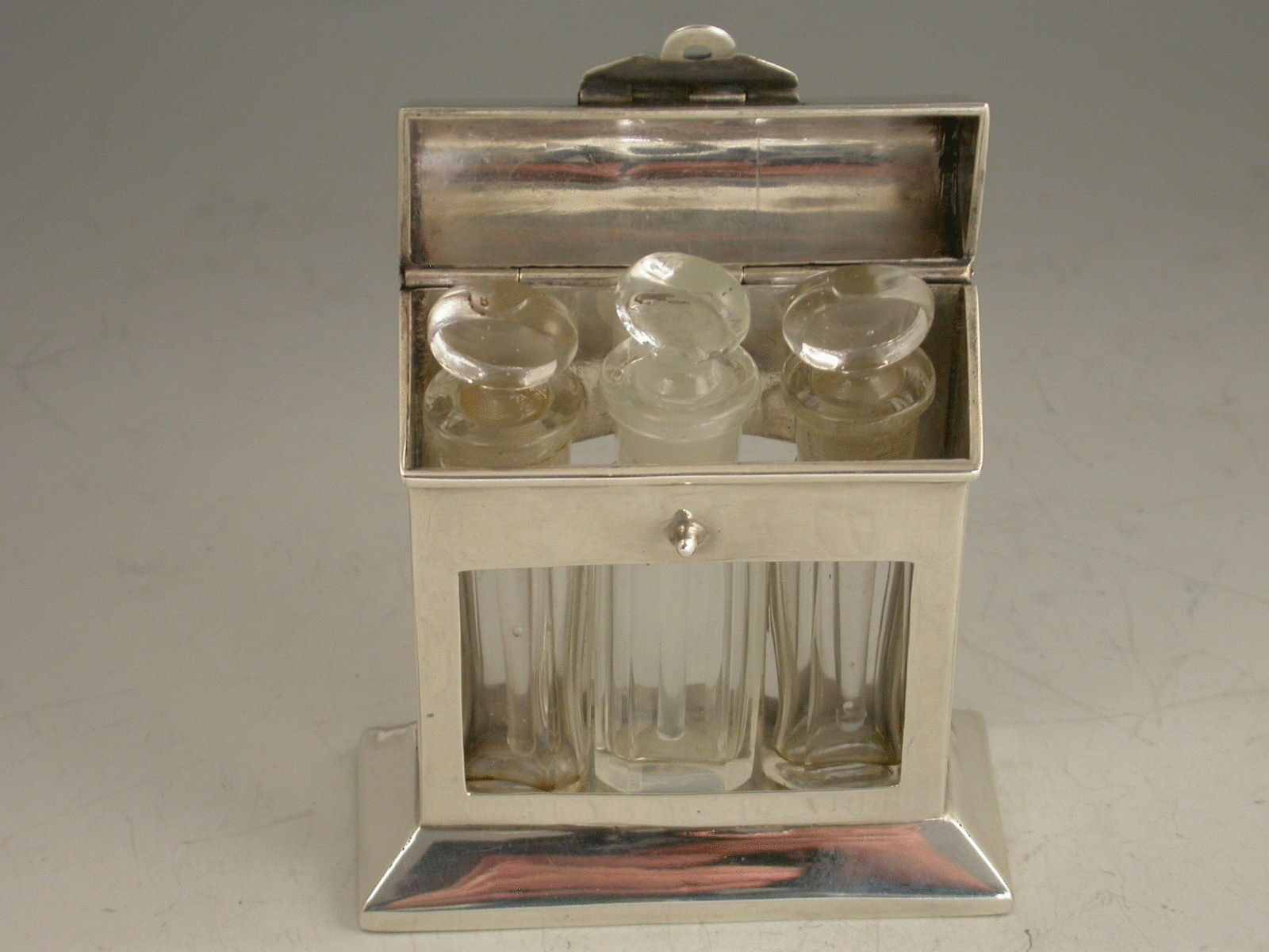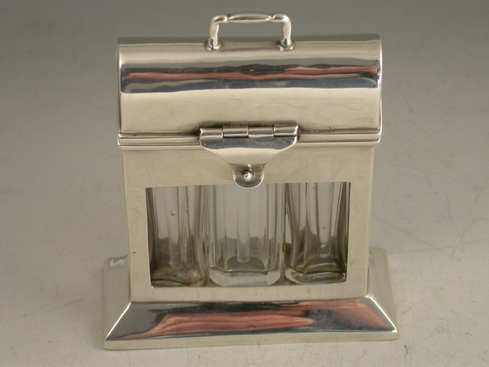 An unusual Edwardian novelty silver Scent Bottle Case in the form of a wooden Tantalus, on a beveled oblong base with hinged domed cover, containing three clear glass scent phials.