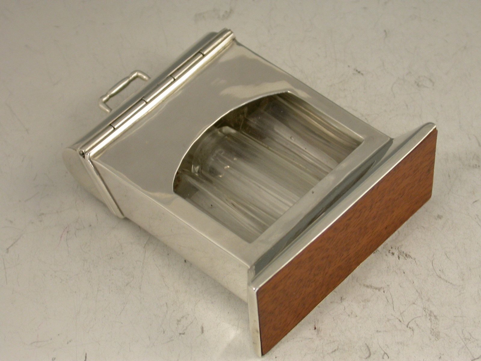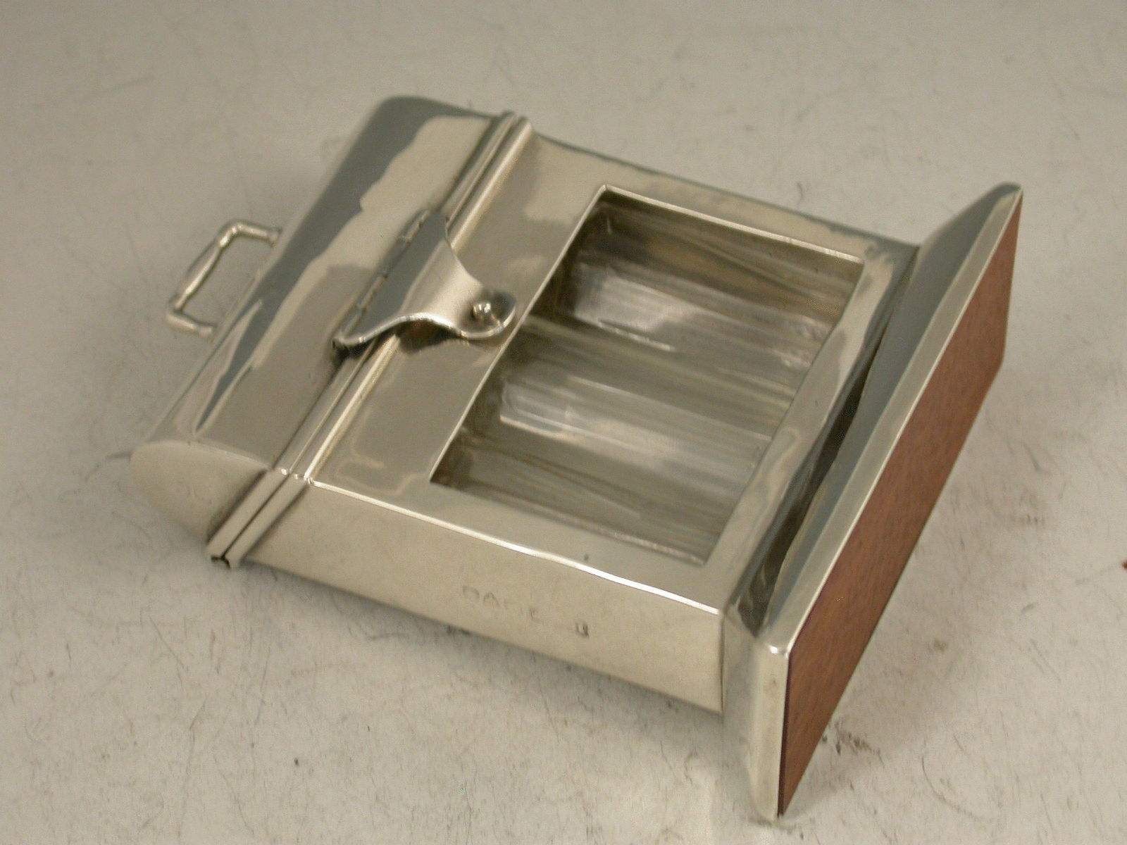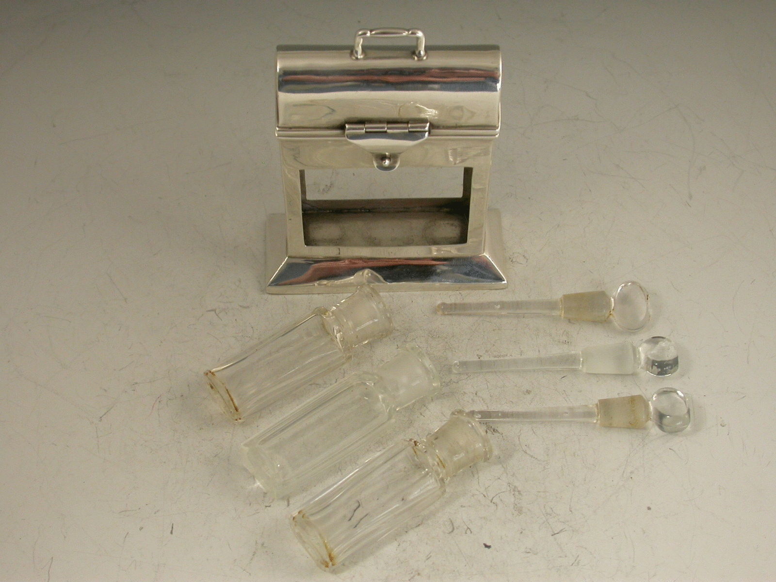An unusual Edwardian novelty silver Scent Bottle Case in the form of a wooden Tantalus, on a beveled oblong base with hinged domed cover, containing three clear glass scent phials.