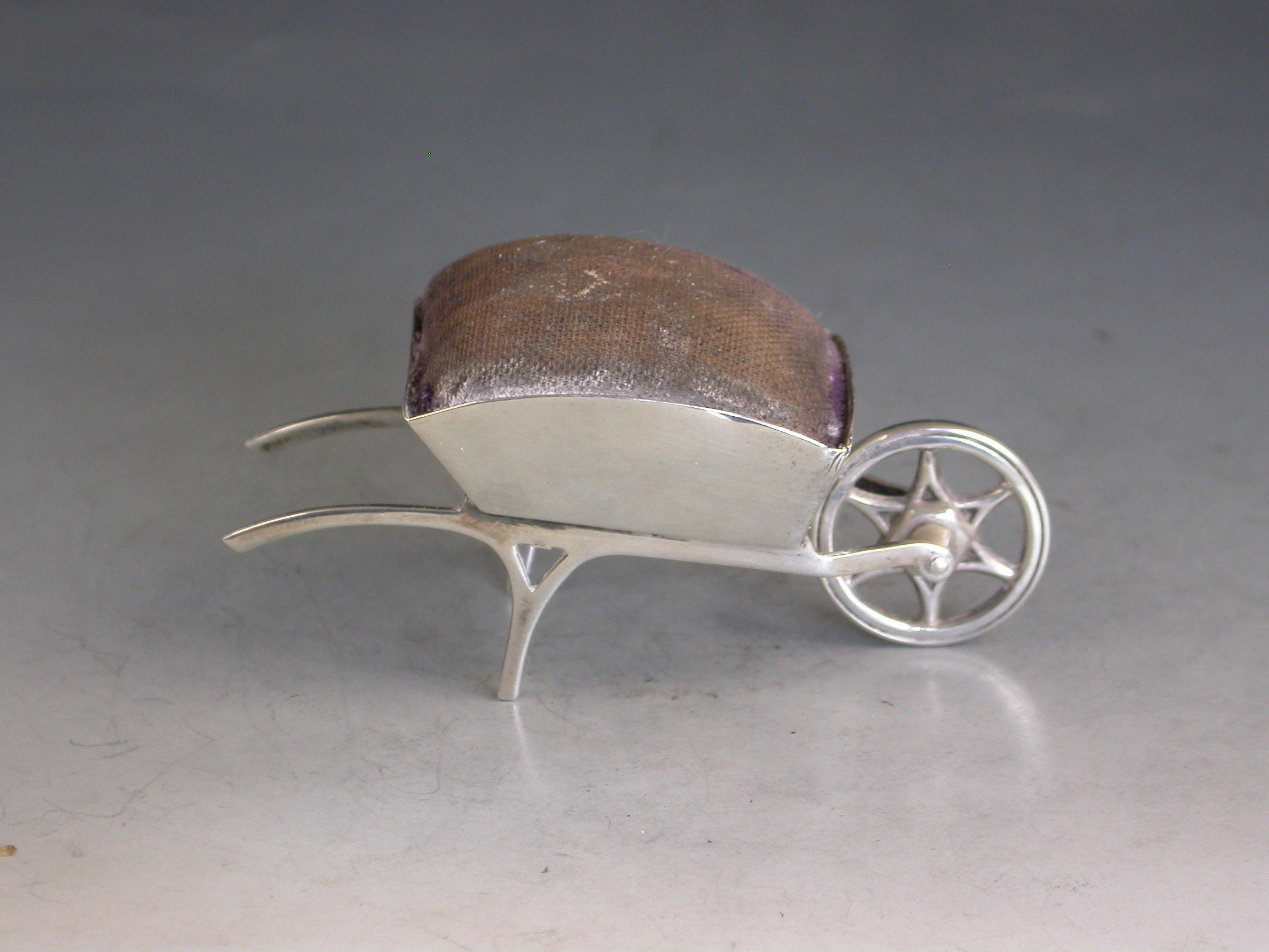 A good Edwardian novelty silver Pin cushion made in the form of a Wheel Barrow, complete with original blue velvet cushion.
