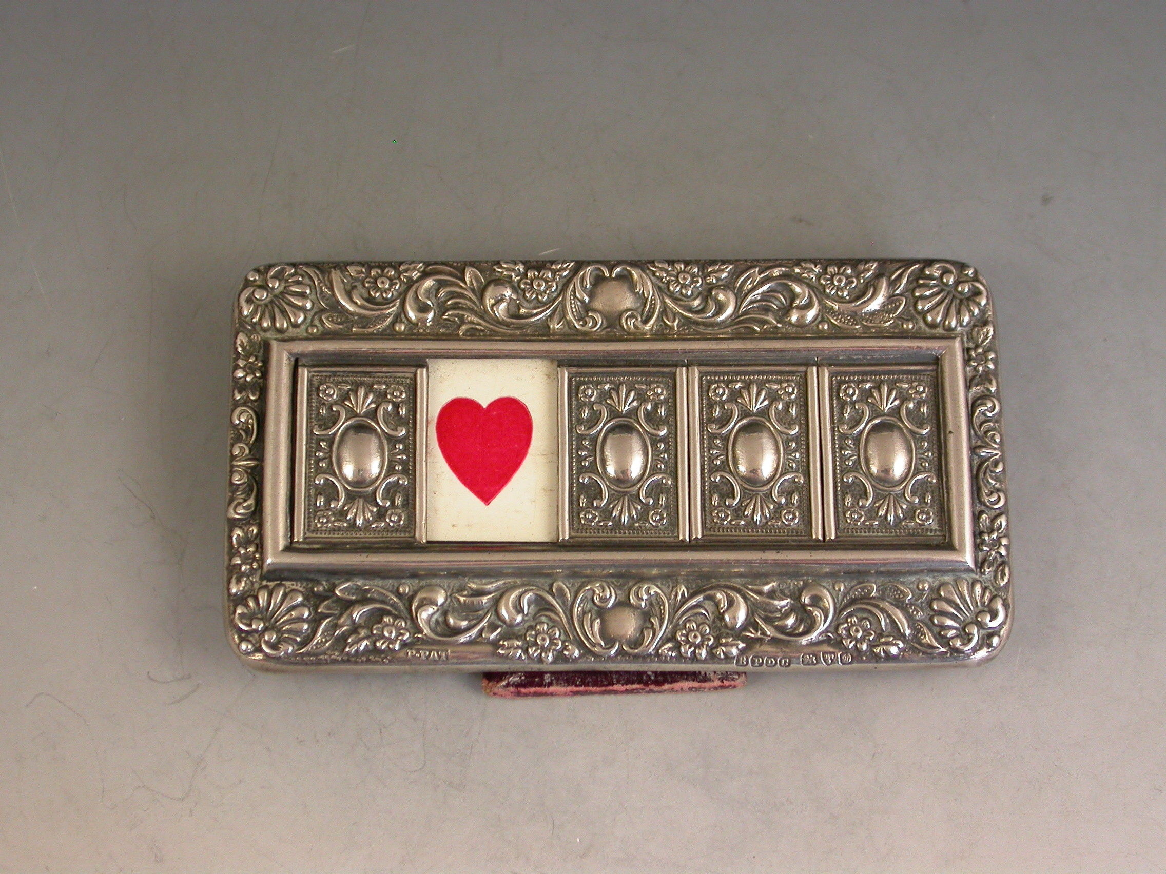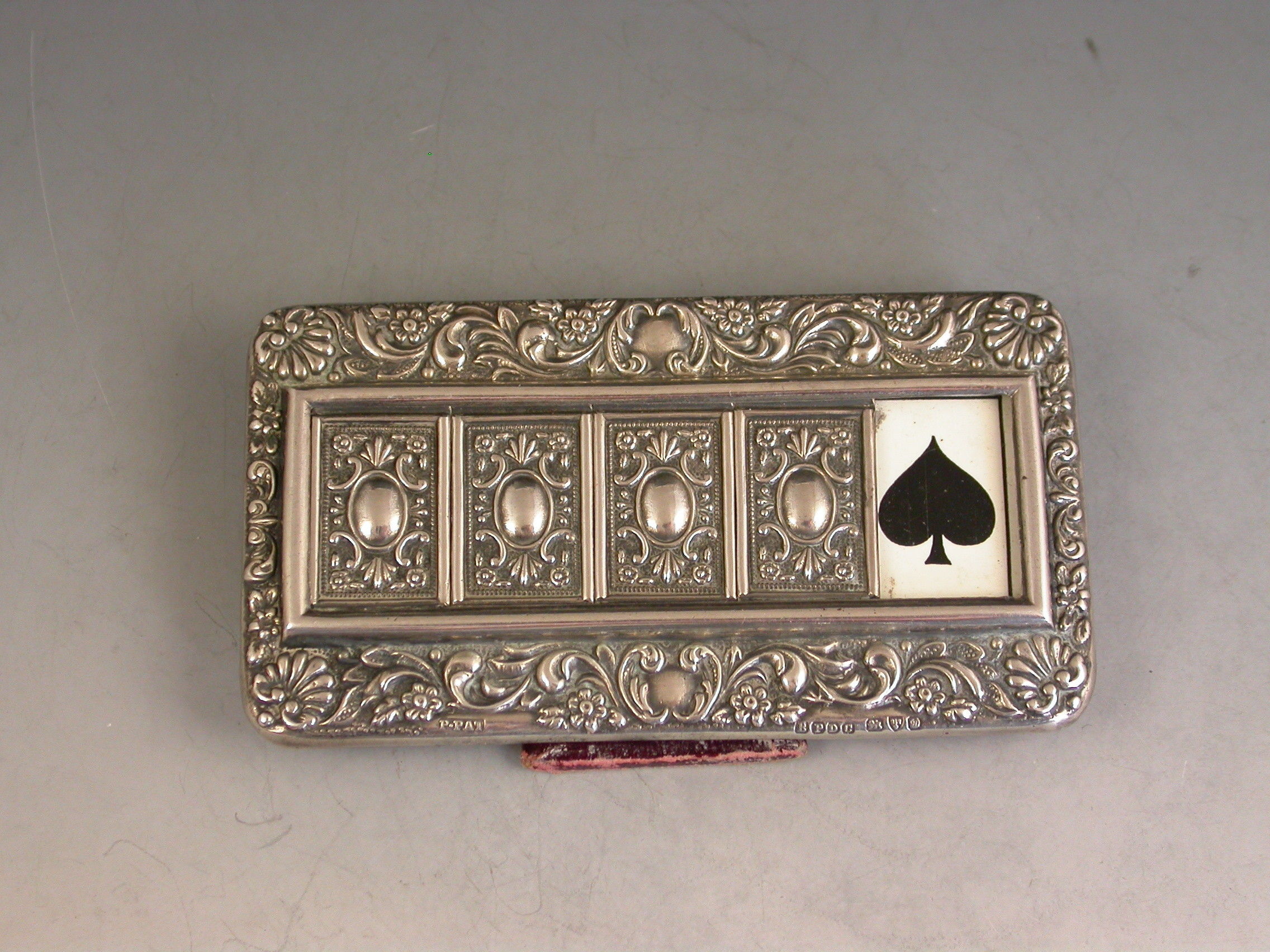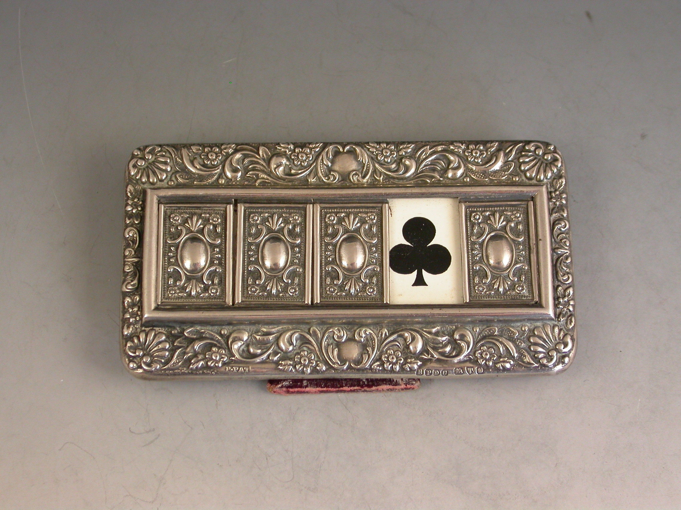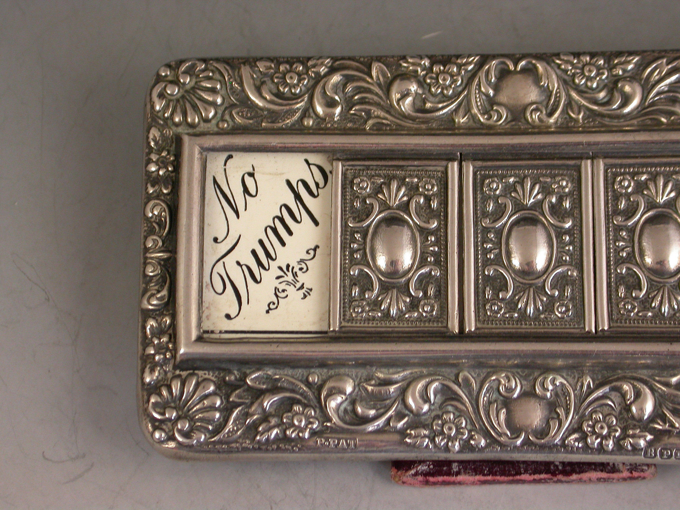 A good Edwardian Patented silver mounted Trumps Marker with red leather easel type back and stand, the silver frame with flower head, shell and scroll decoration, four sliding panels opening to reveal the trumps or no trumps painted on a celluloid backing.