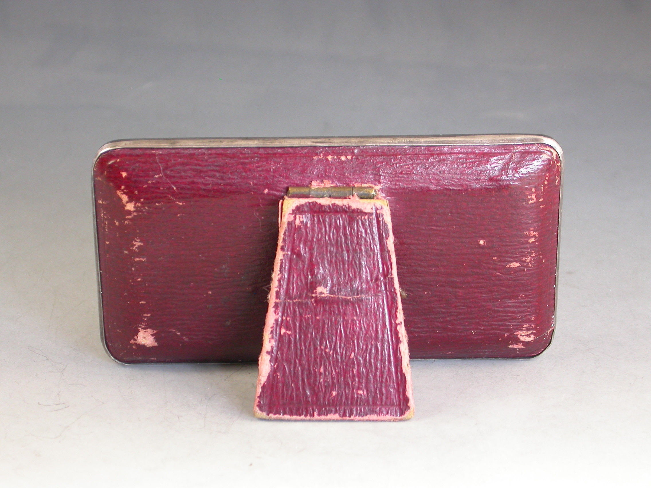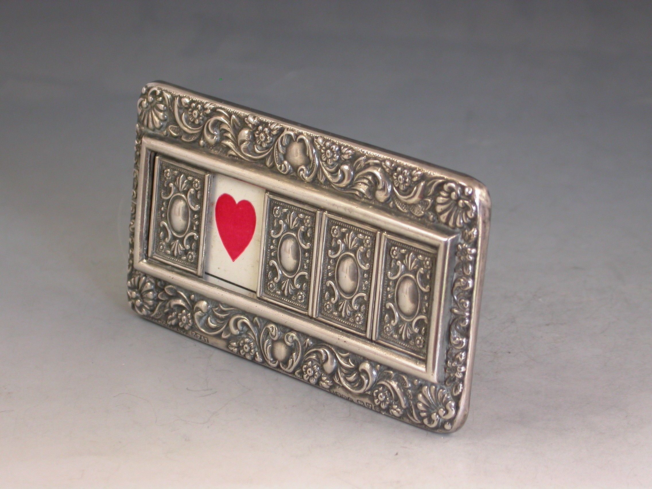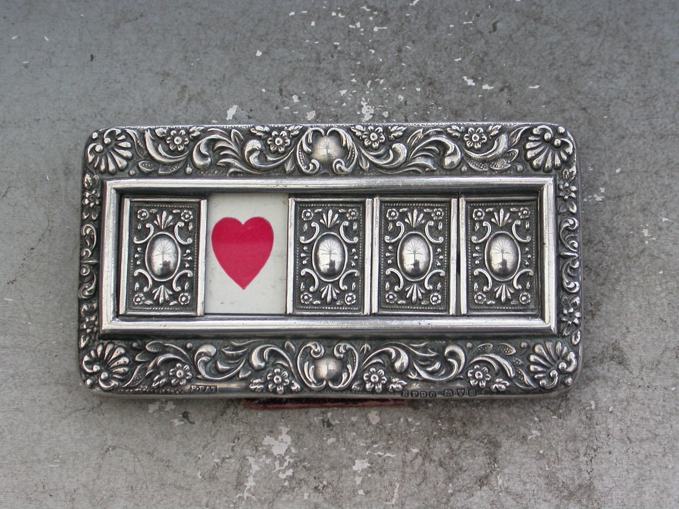 A good Edwardian Patented silver mounted Trumps Marker with red leather easel type back and stand, the silver frame with flower head, shell and scroll decoration, four sliding panels opening to reveal the trumps or no trumps painted on a celluloid backing.