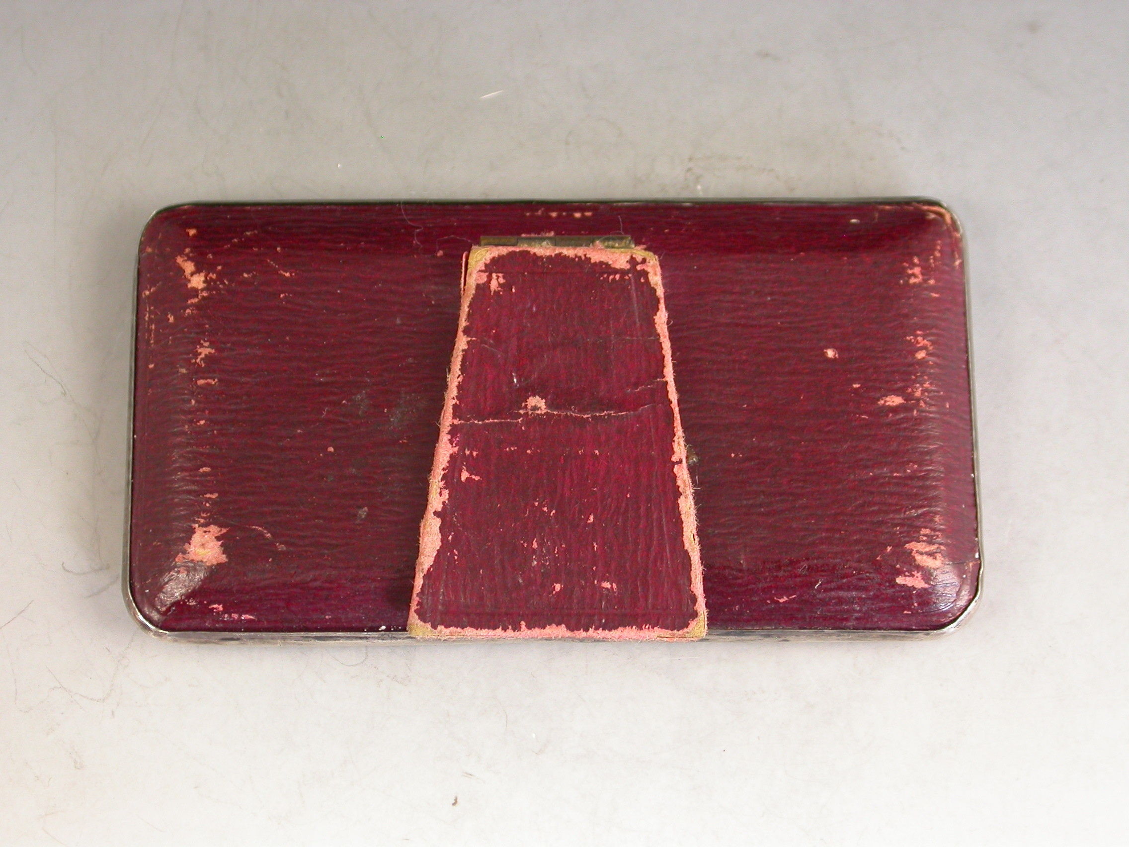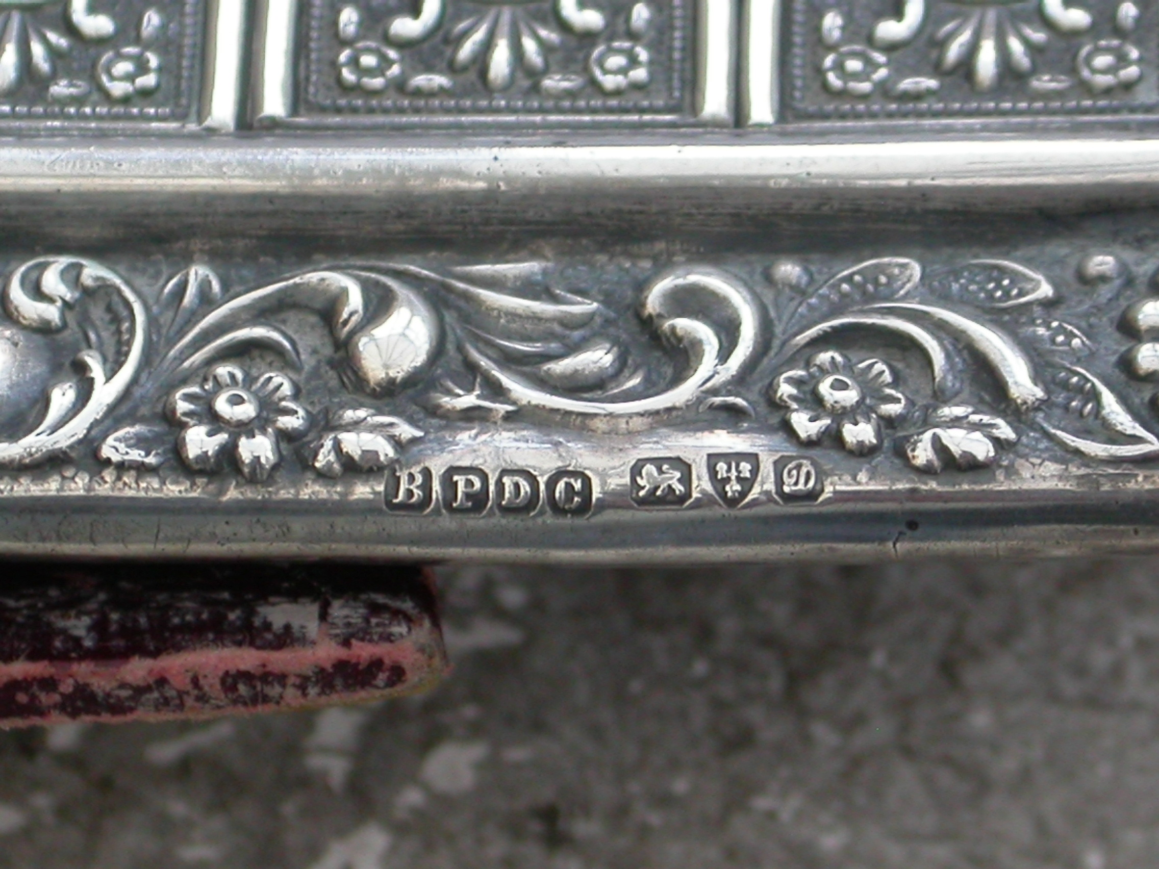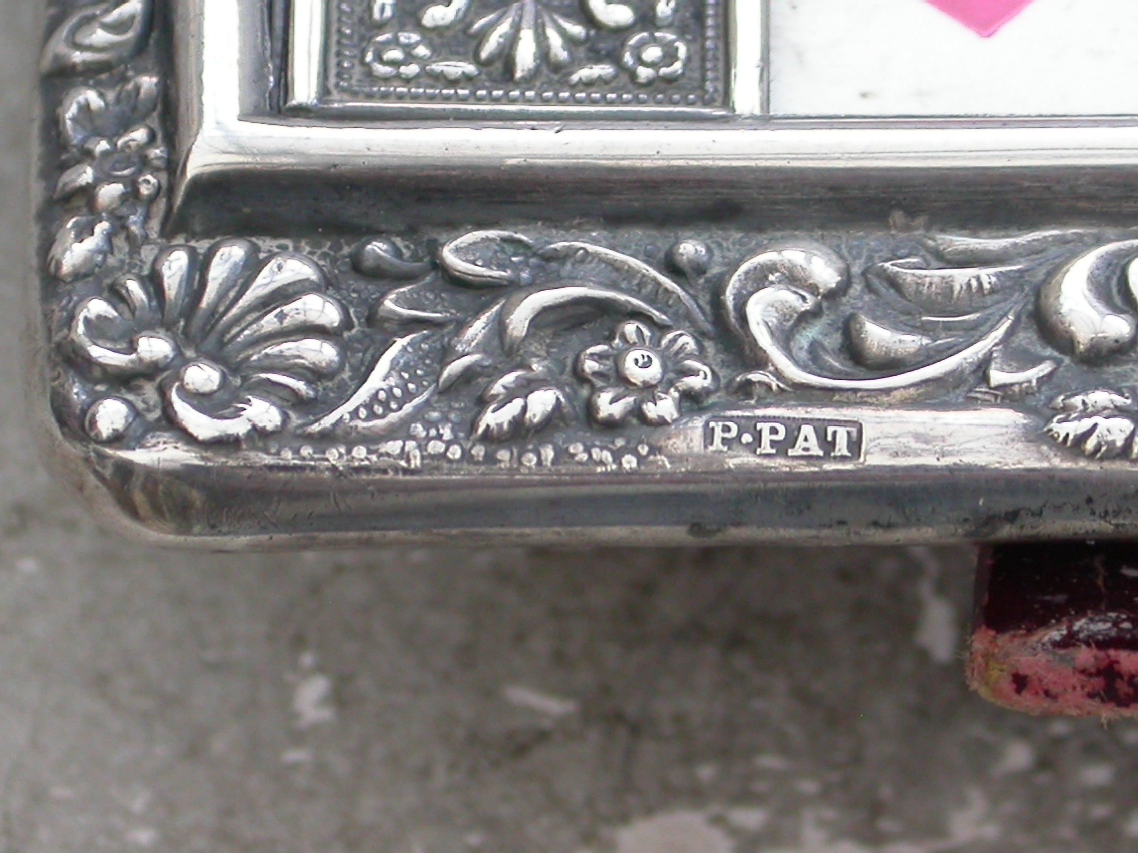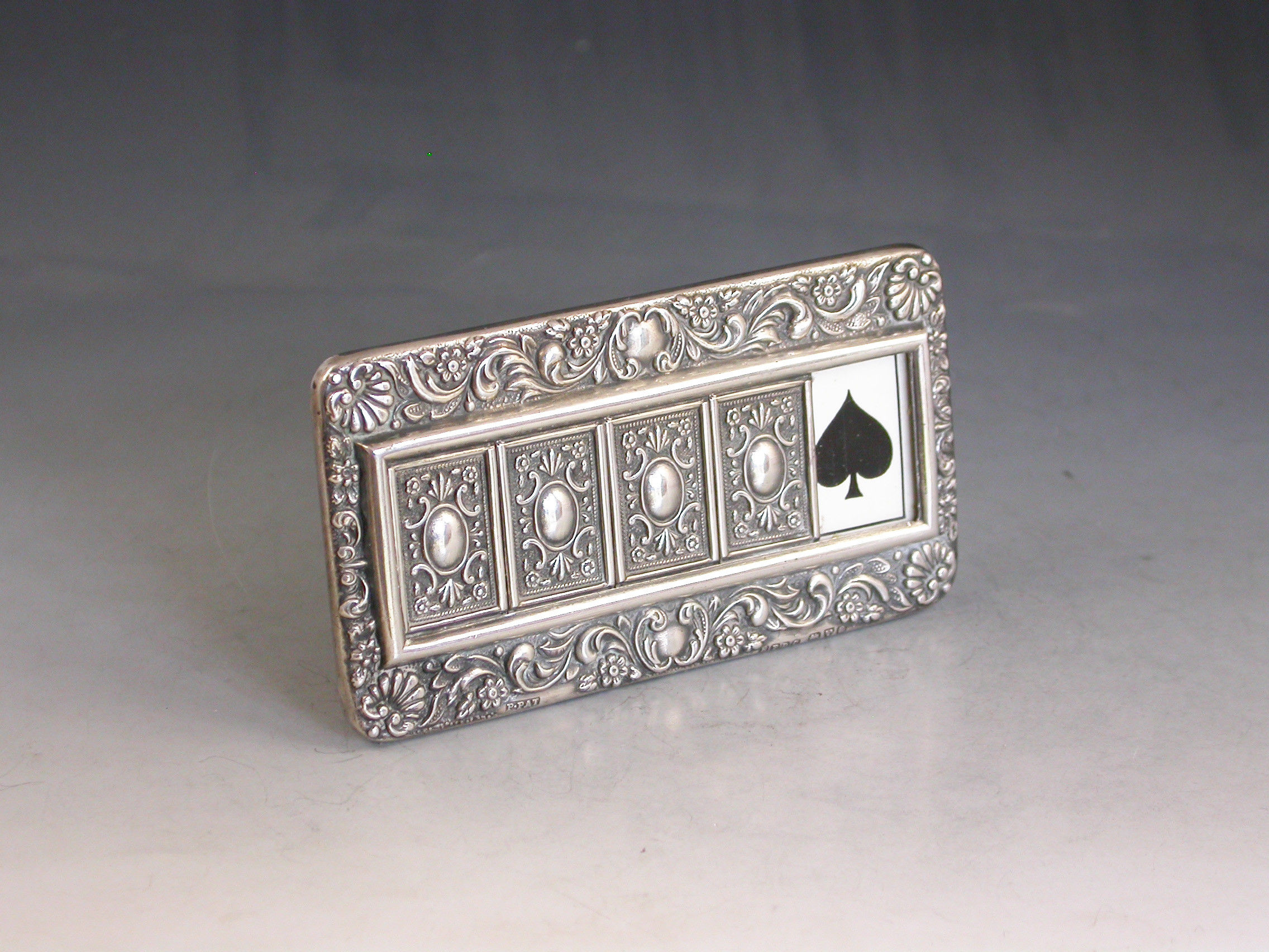 A good Edwardian Patented silver mounted Trumps Marker with red leather easel type back and stand, the silver frame with flower head, shell and scroll decoration, four sliding panels opening to reveal the trumps or no trumps painted on a celluloid backing.