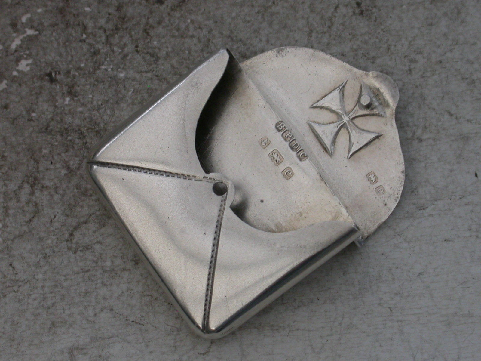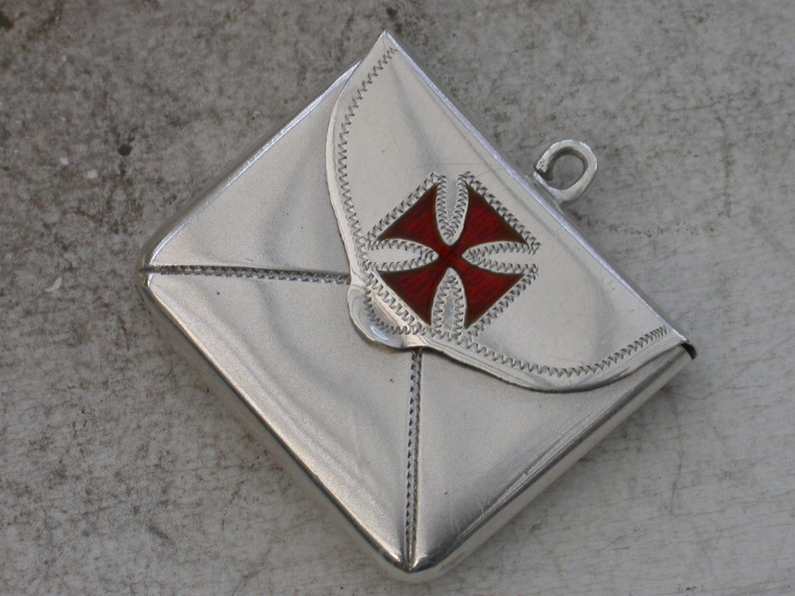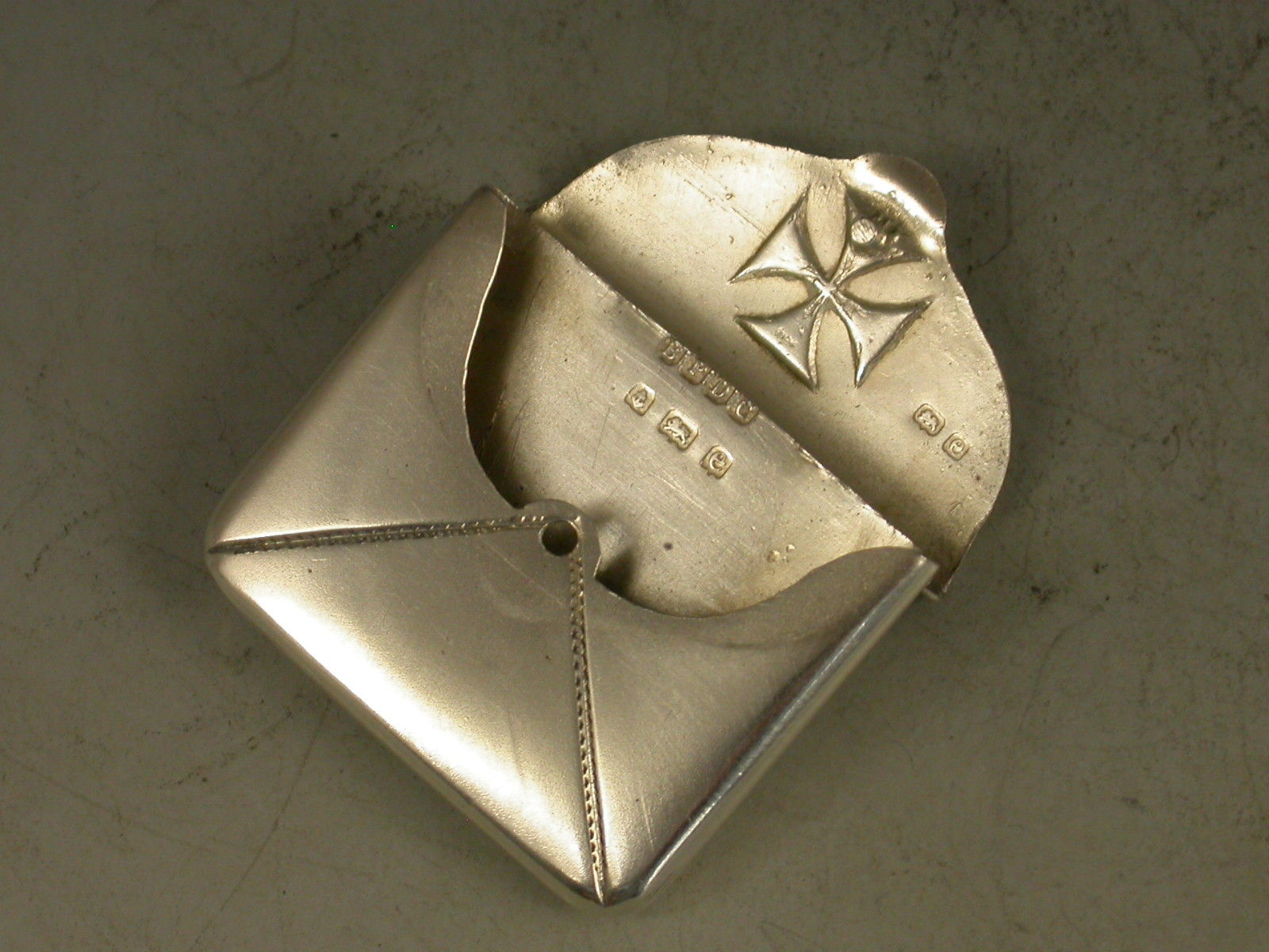 A rare Edwardian novelty silver Stamp Case of envelope form, the hinged lid with red enamelled Cross Pattee (Probably to represent the German Empire 1871 - 1918).