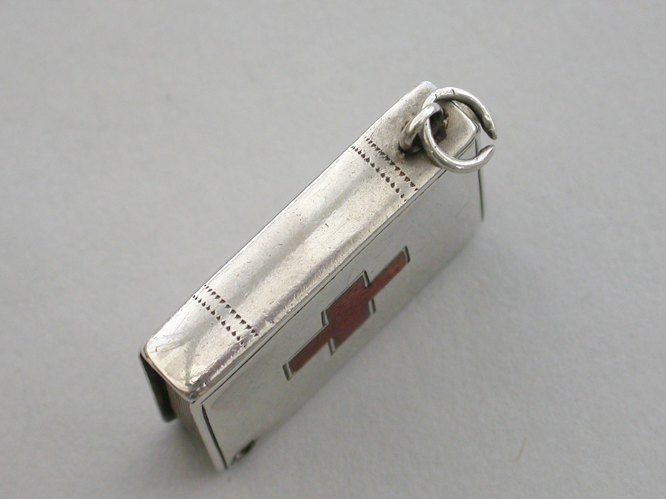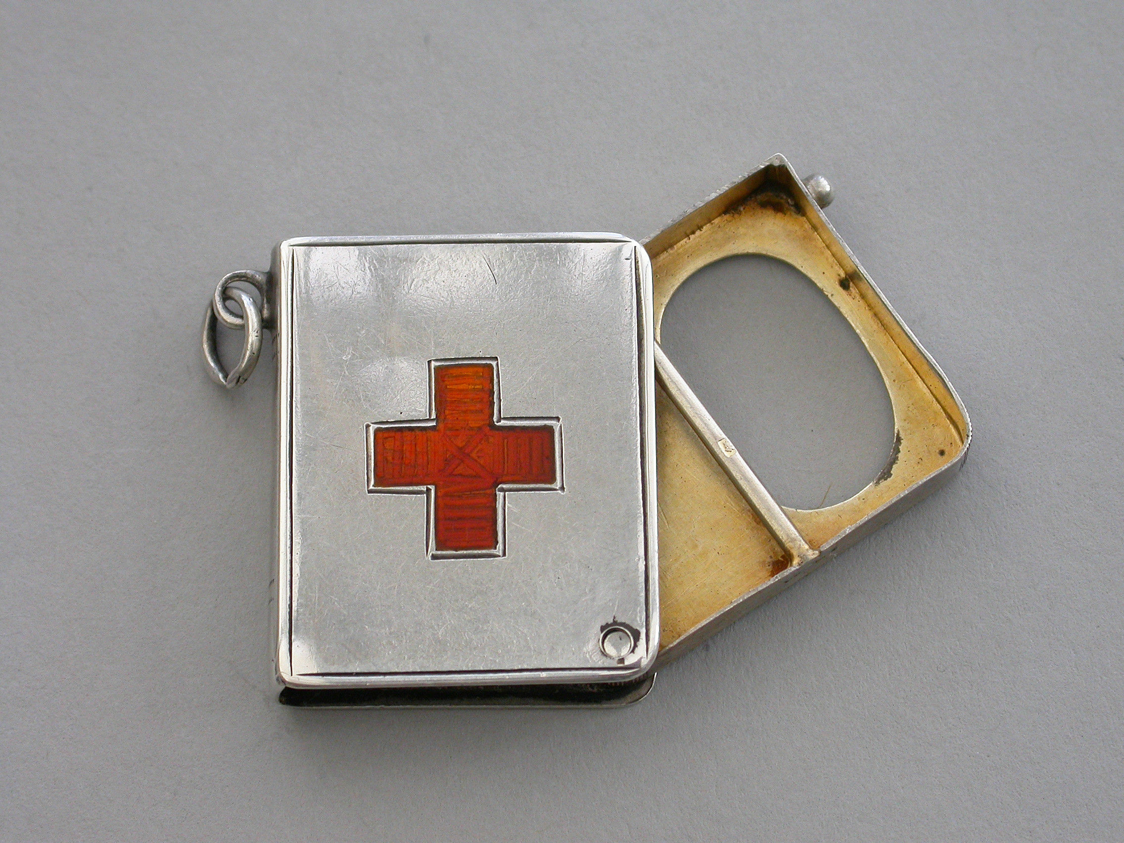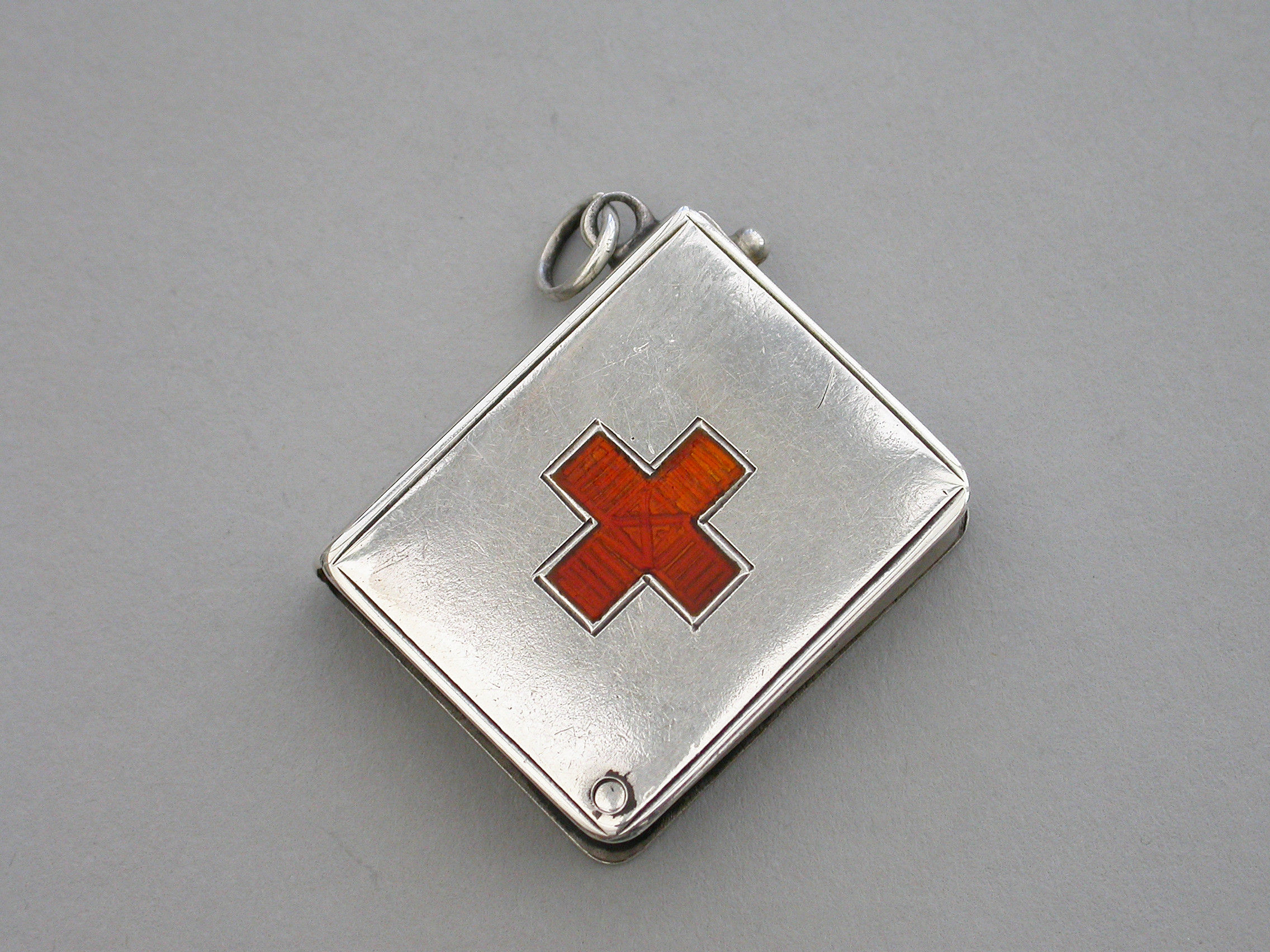 A rare Edwardian silver Stamp Case of book form, the silver gilt interior compartment swivelling open on a retaining pin to one corner, the cover inset with an enamel Red Cross. Attached suspension ring.