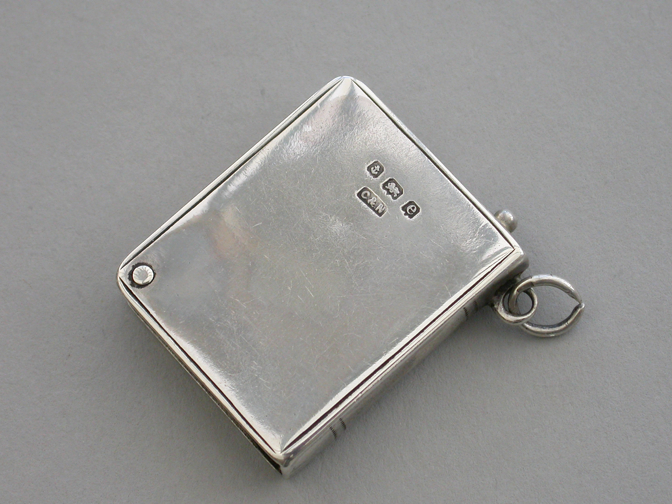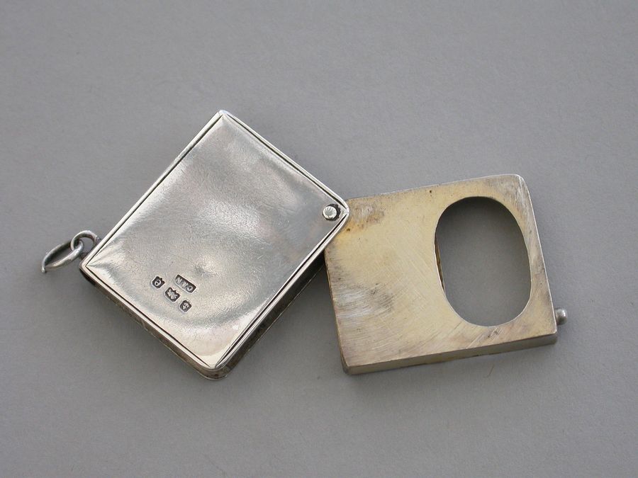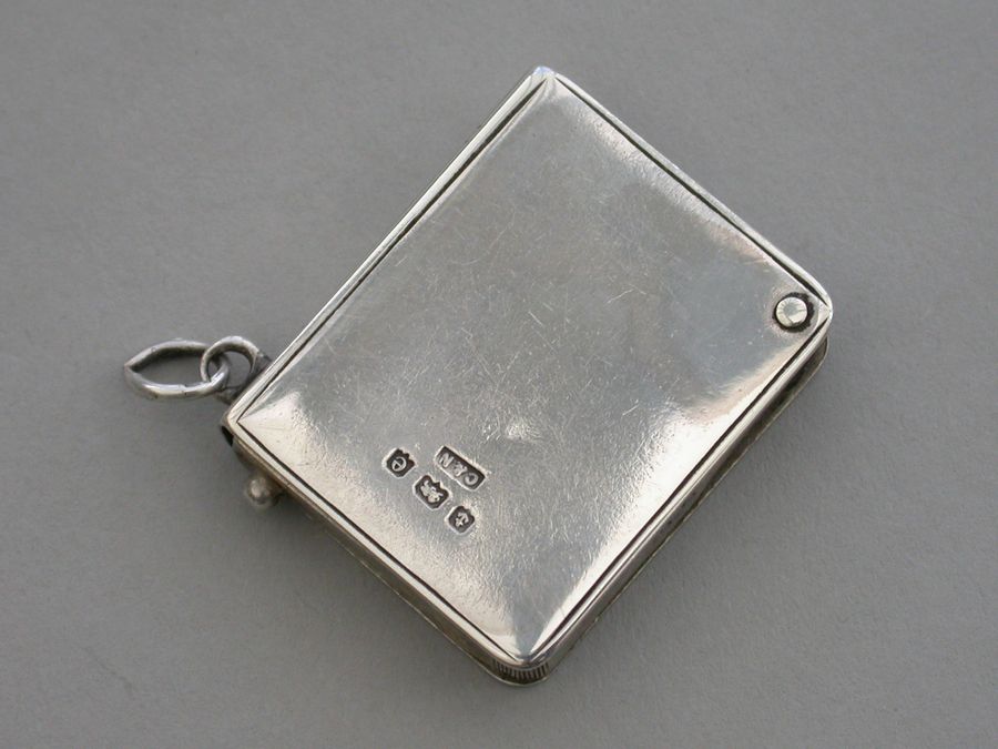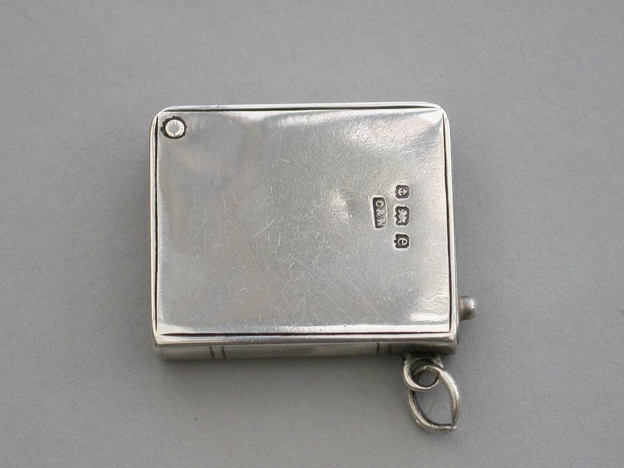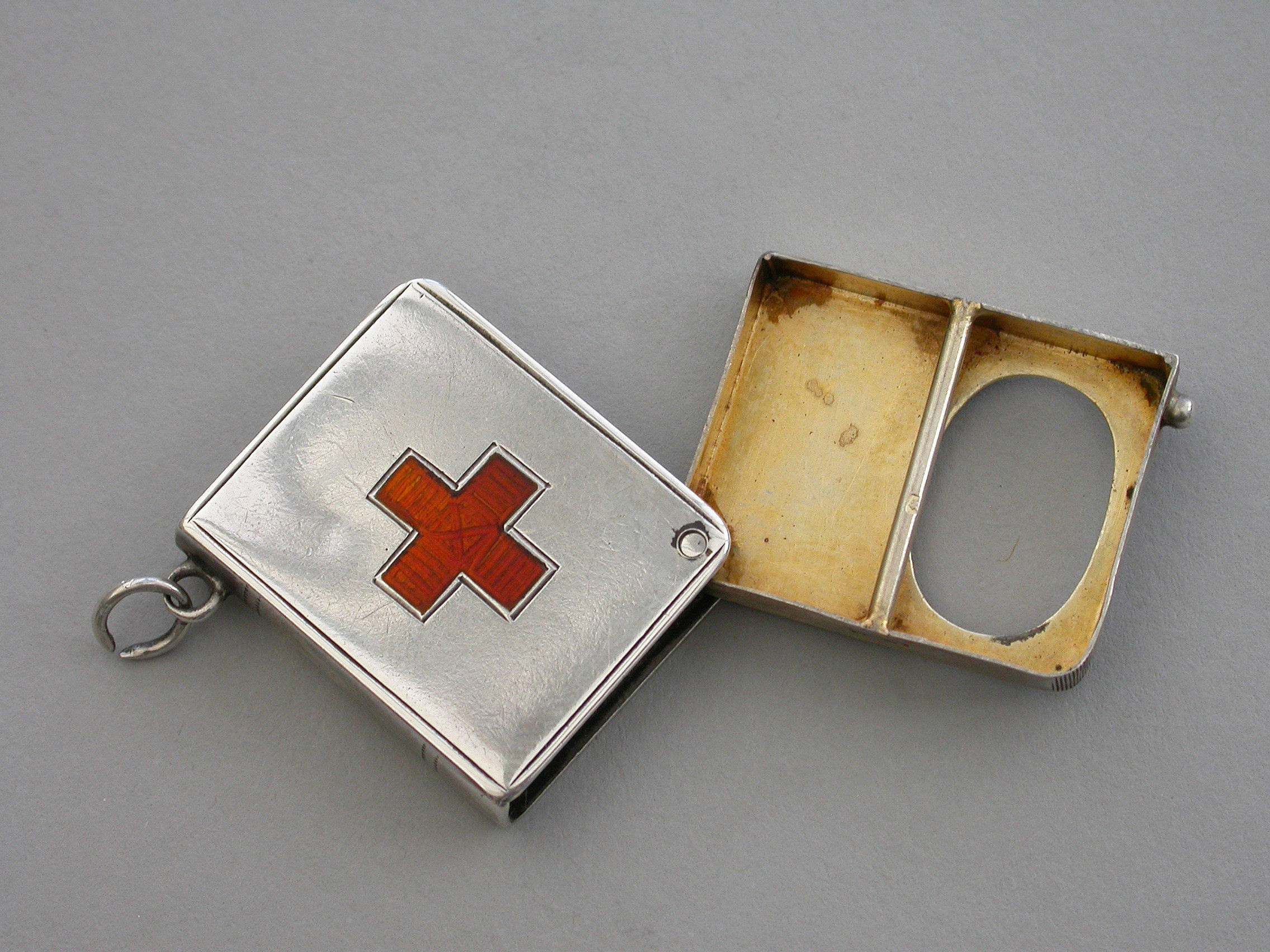 A rare Edwardian silver Stamp Case of book form, the silver gilt interior compartment swivelling open on a retaining pin to one corner, the cover inset with an enamel Red Cross. Attached suspension ring.