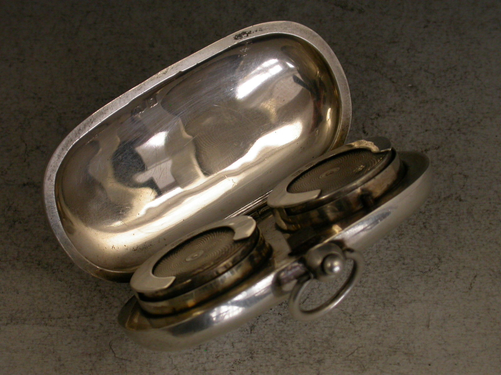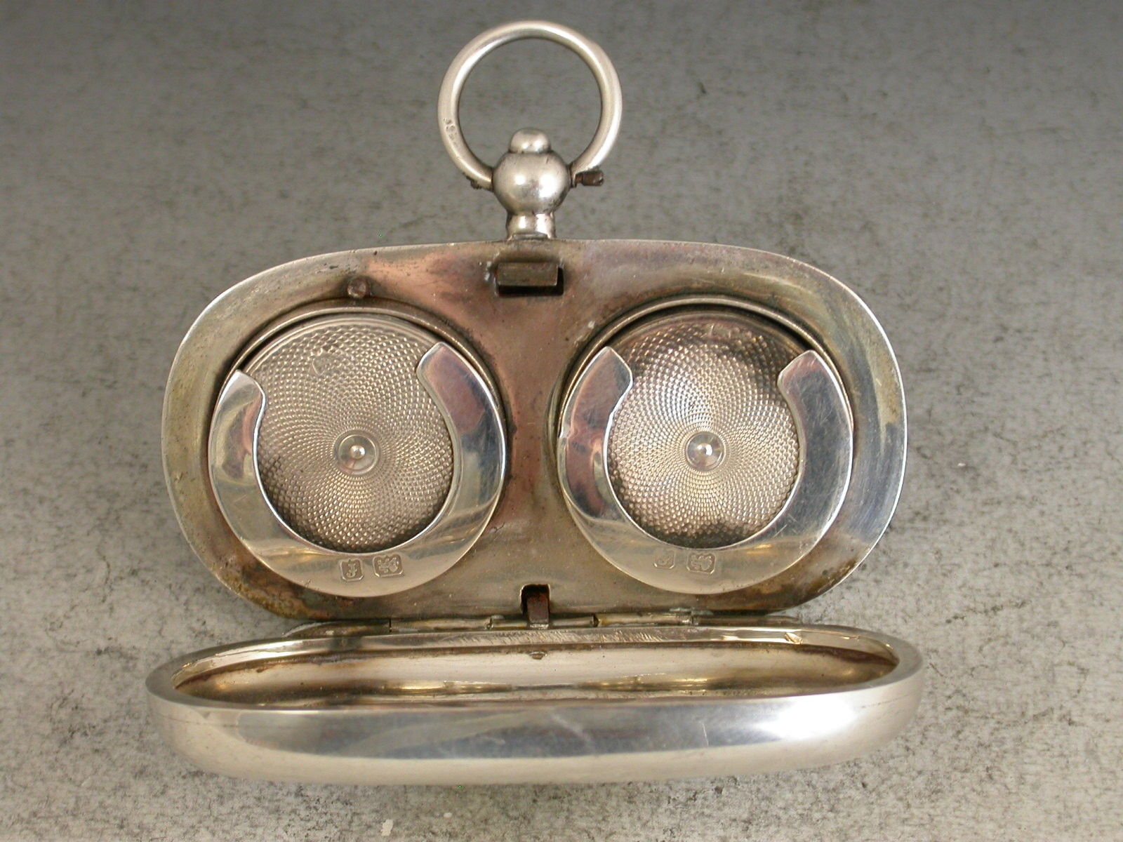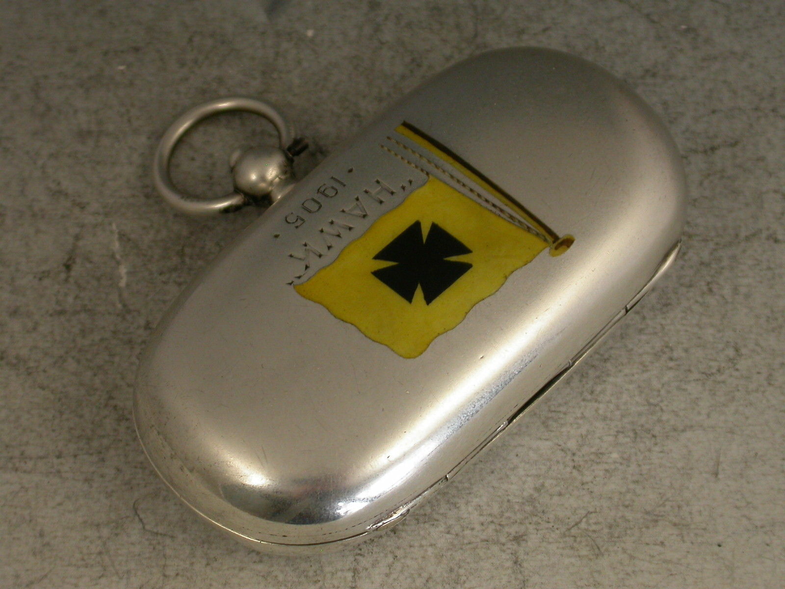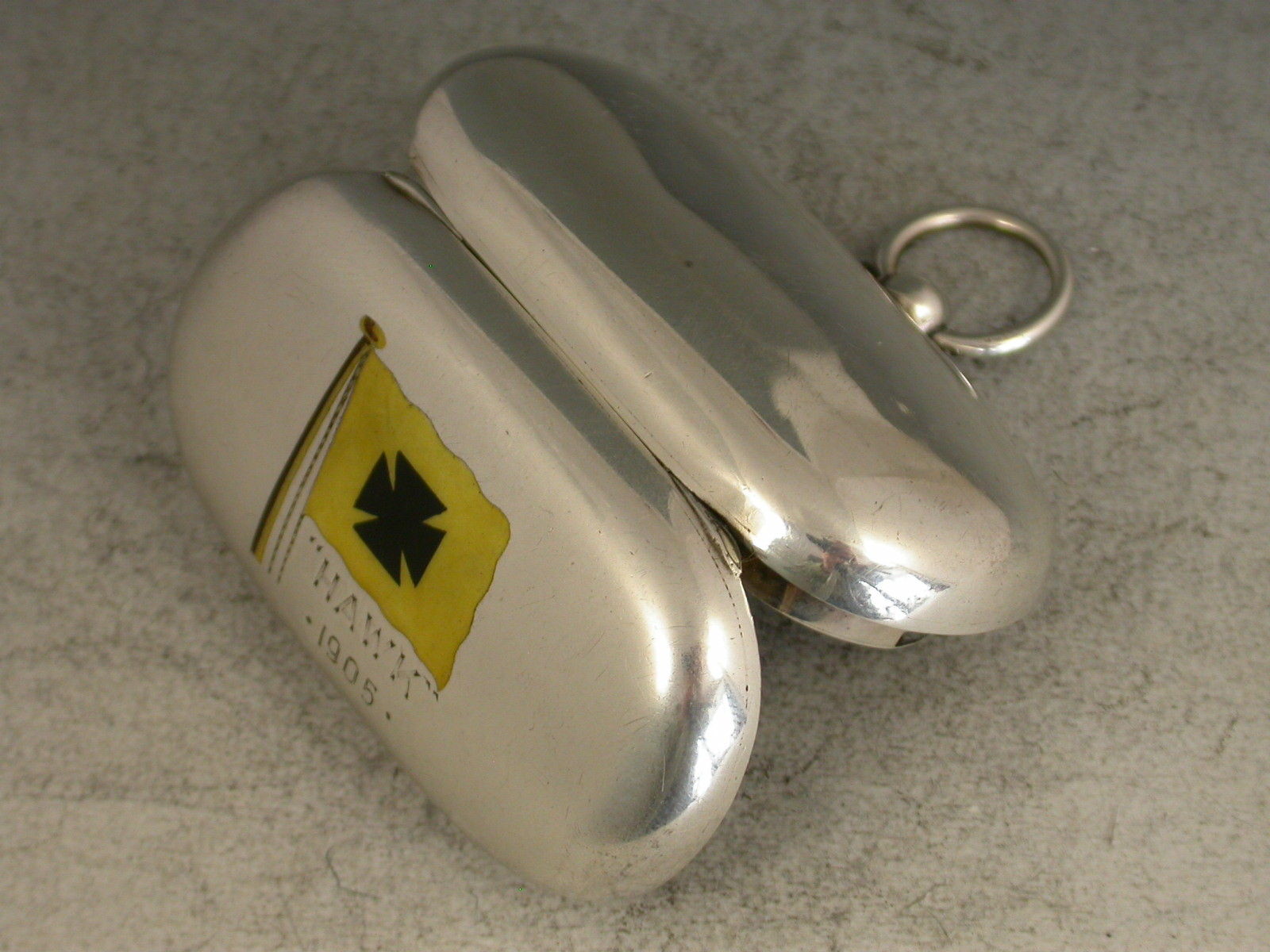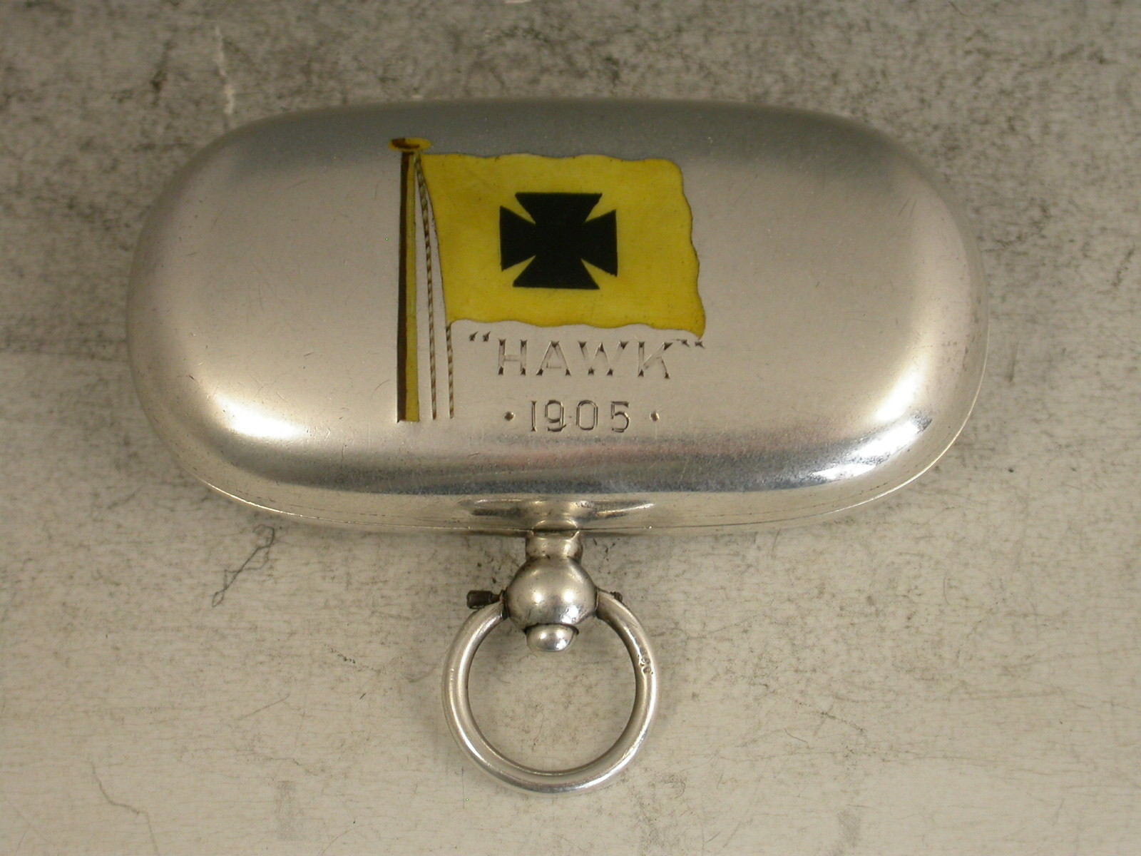 A good Edwardian silver and enamel double Sovereign Case of rounded rectangular form with attached suspension ring and sprung push button opening mechanism, the lid enamelled with a yellow flag with black Maltese Cross for HMS Hawk 1905.