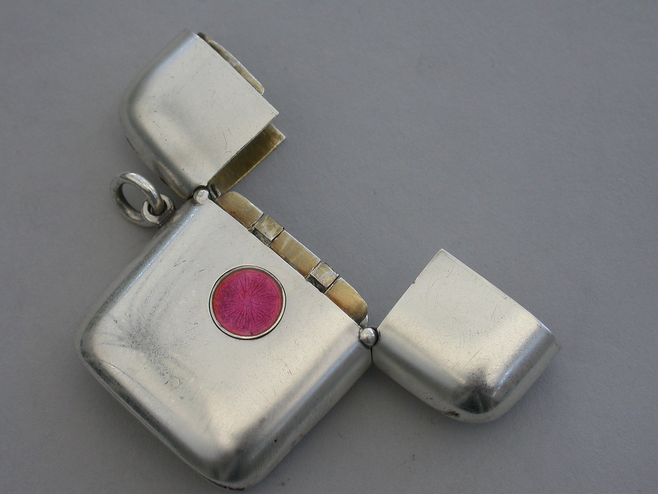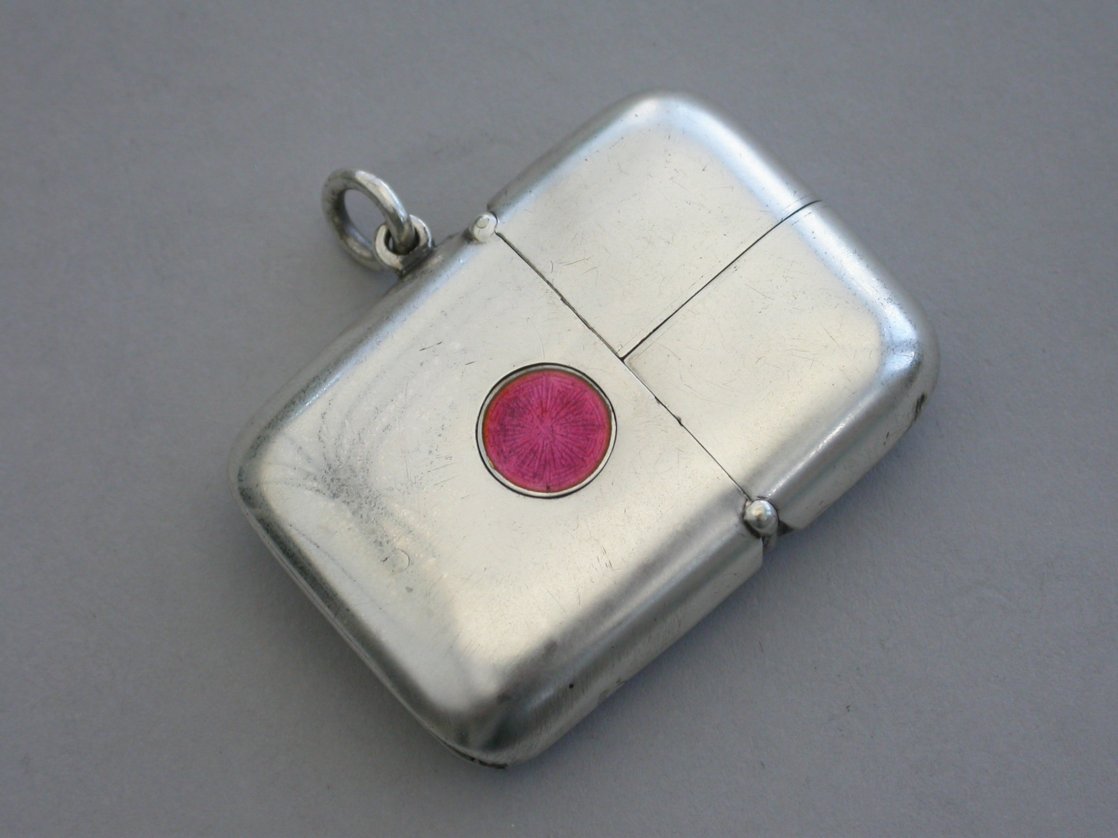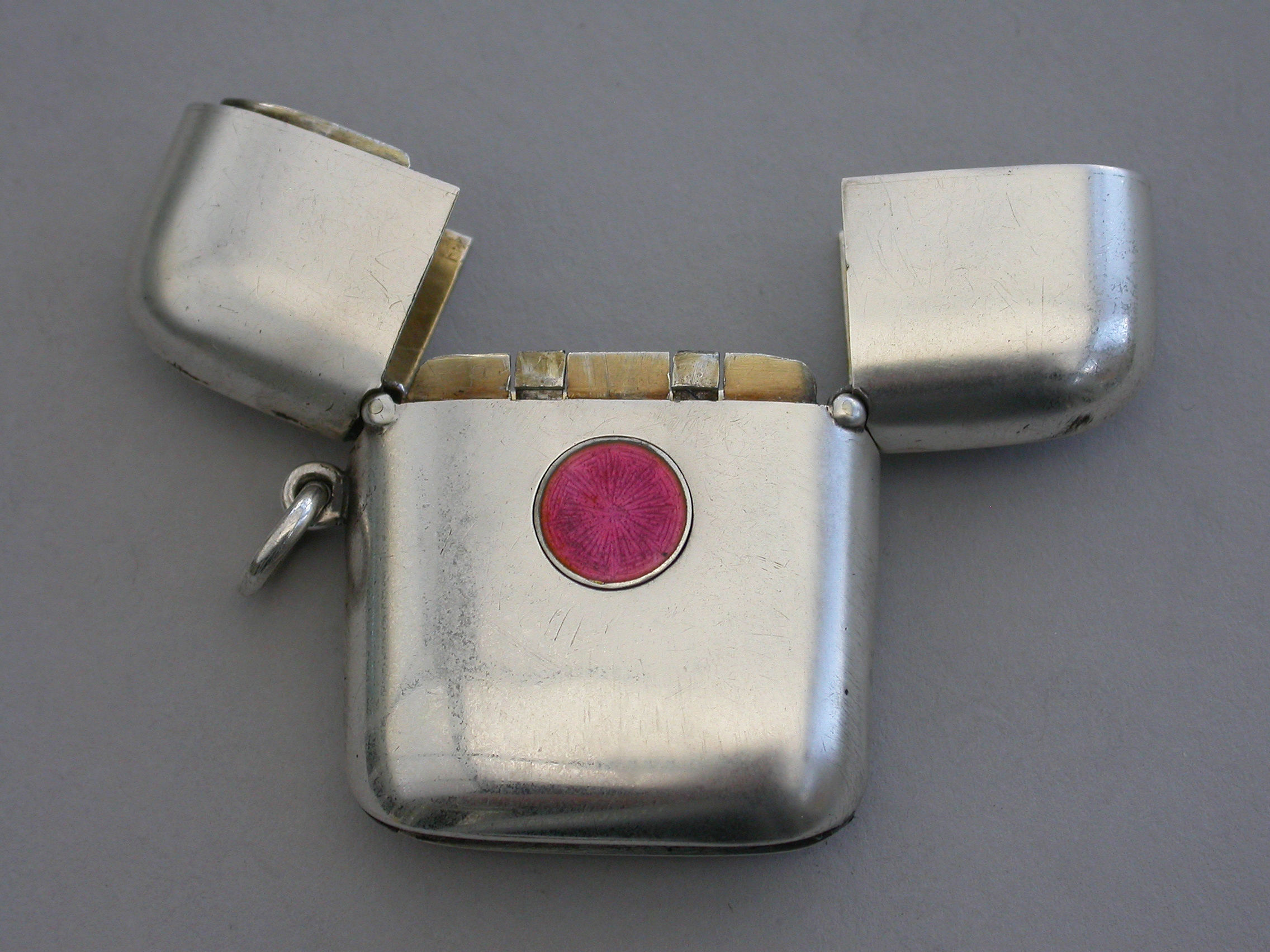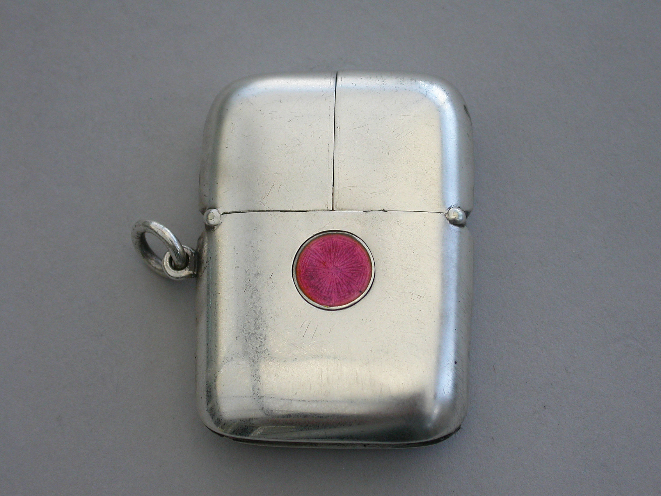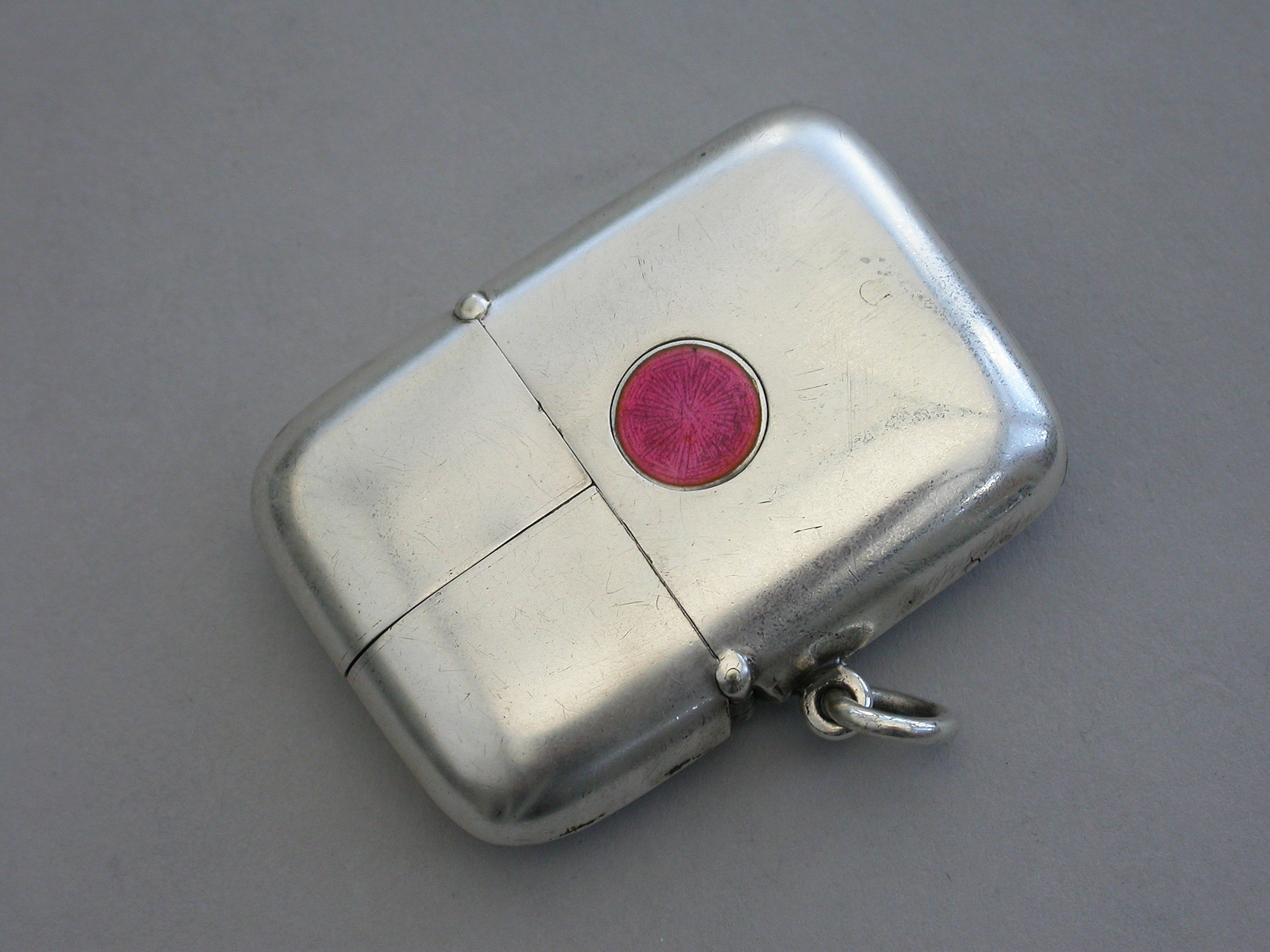 A rare and unusual Edwardian silver Vesta Case of rounded rectangular form with attached suspension ring, the sprung double opening cantilever action lids operated by a pink enamel button to the front of the case. The reverse engraved with initials - H A P. Silver gilt interior.