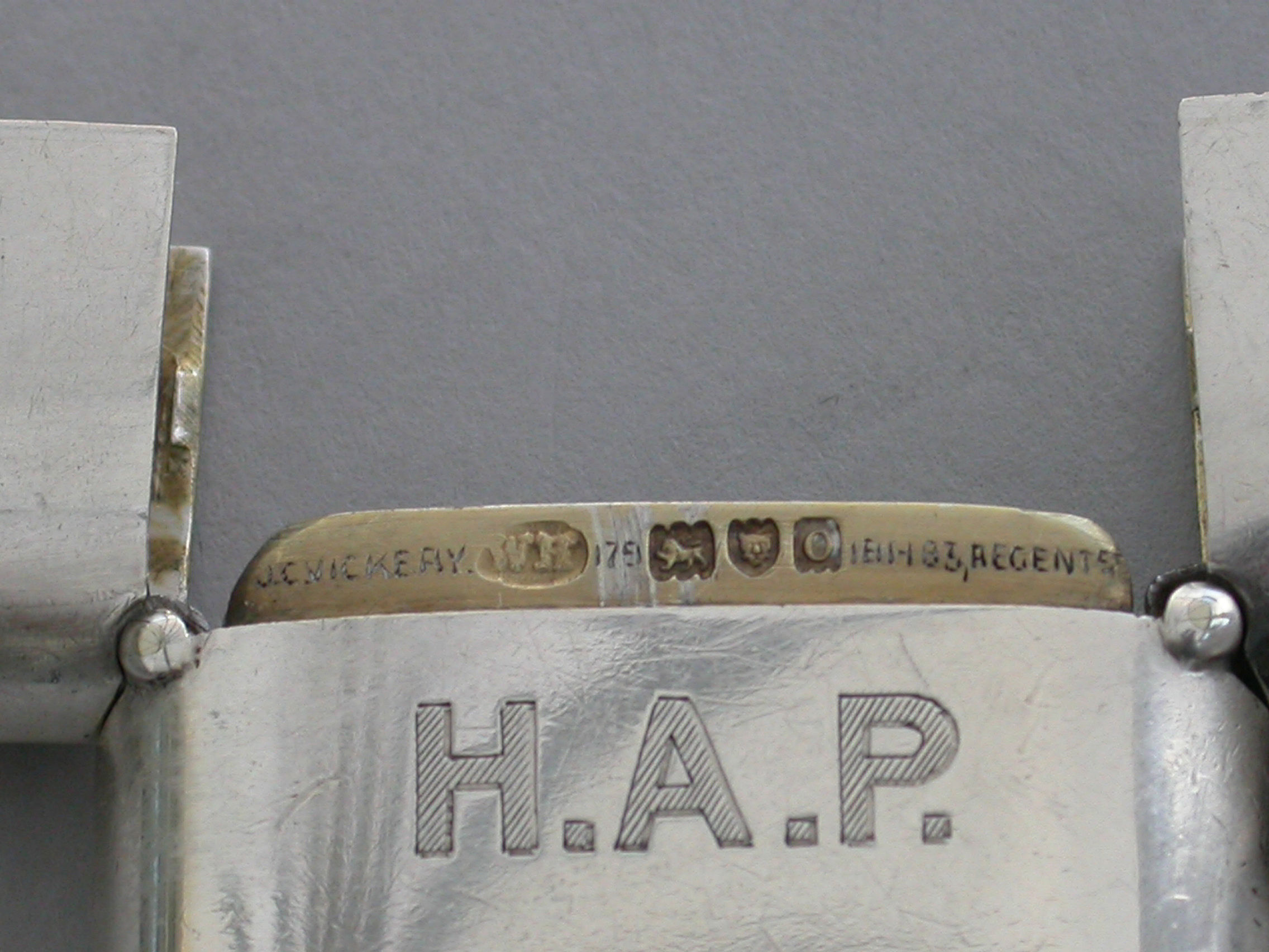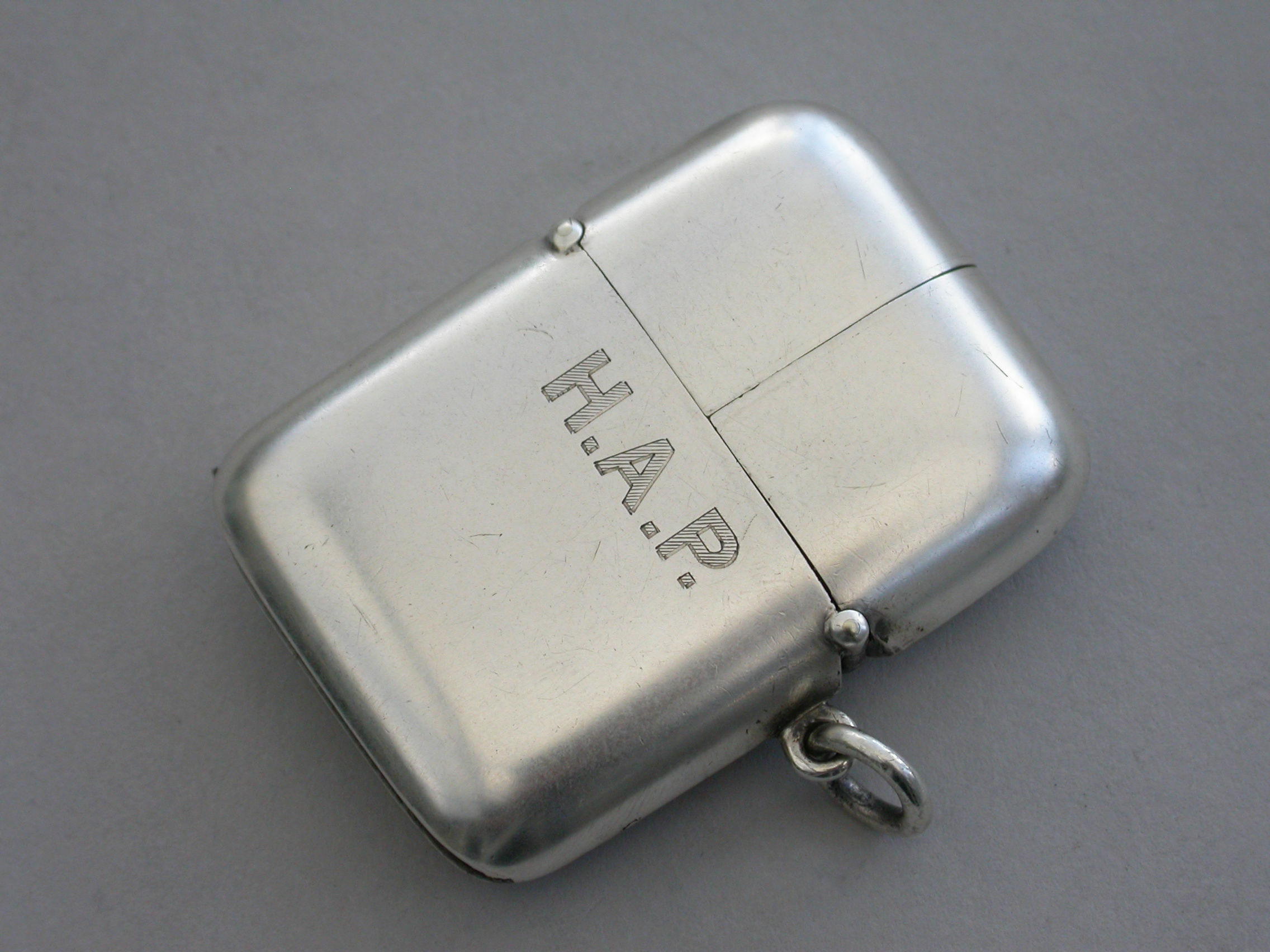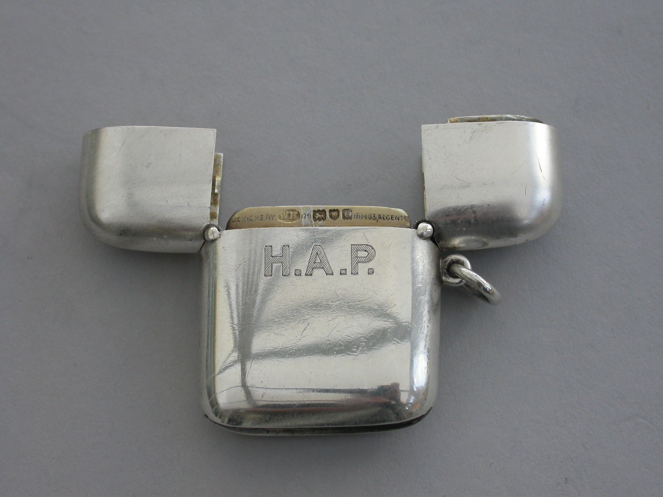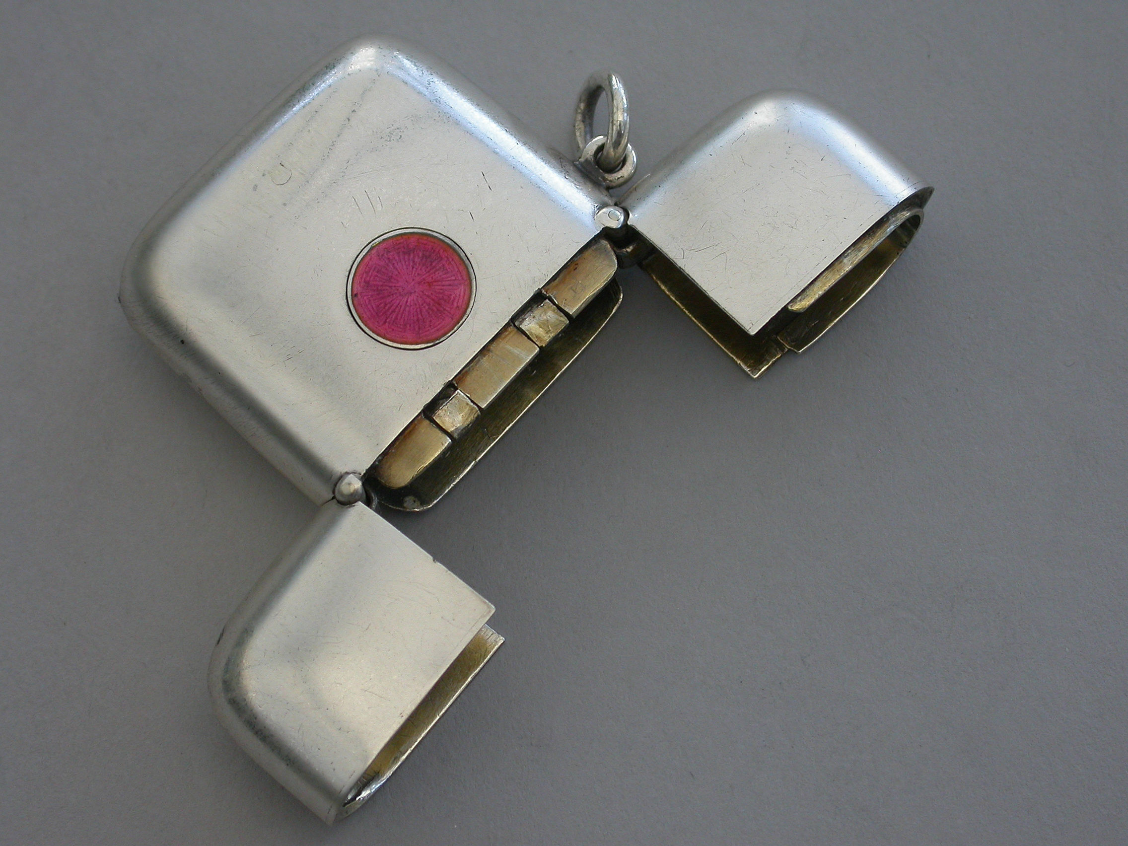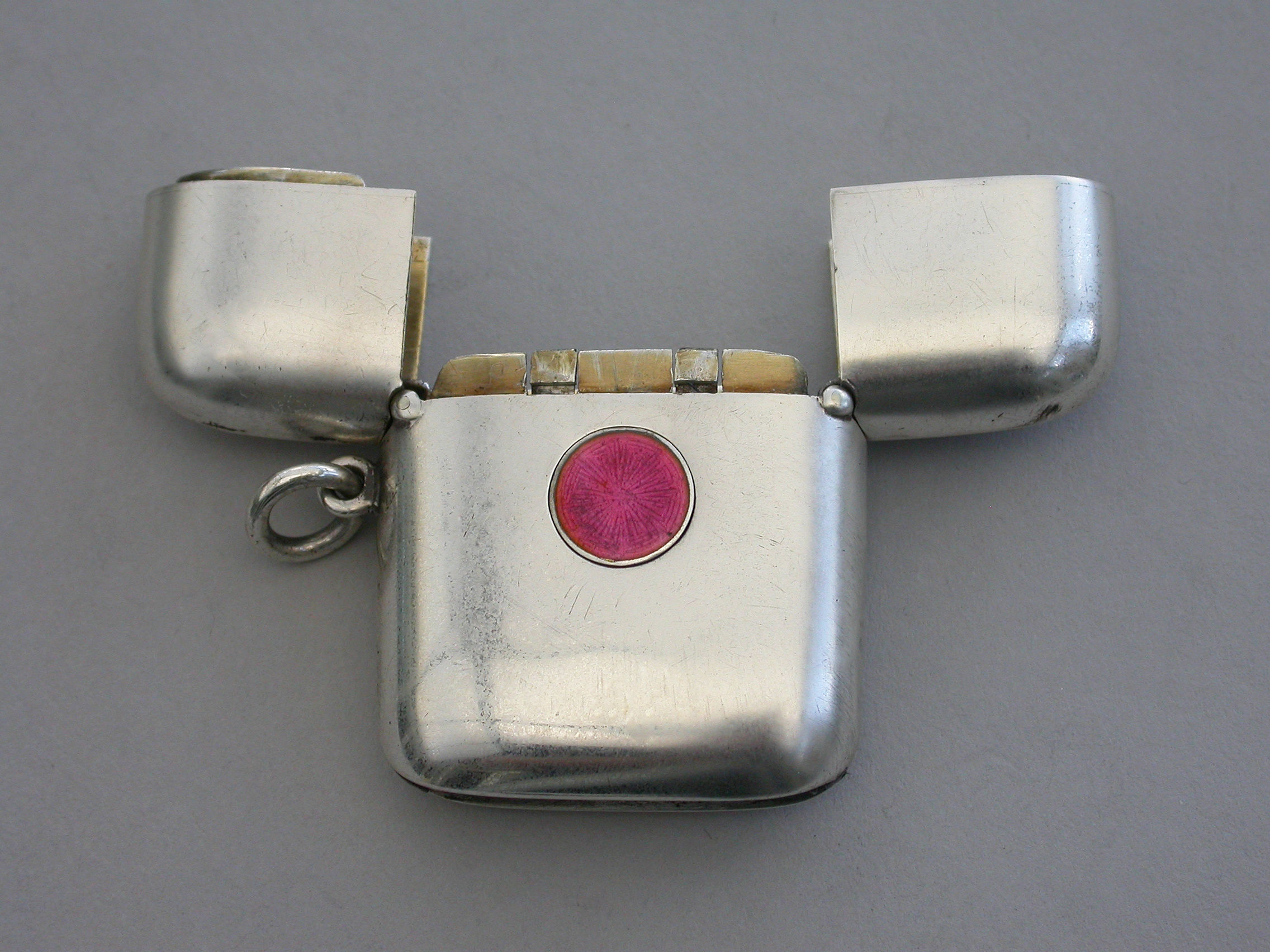 A rare and unusual Edwardian silver Vesta Case of rounded rectangular form with attached suspension ring, the sprung double opening cantilever action lids operated by a pink enamel button to the front of the case. The reverse engraved with initials - H A P. Silver gilt interior.