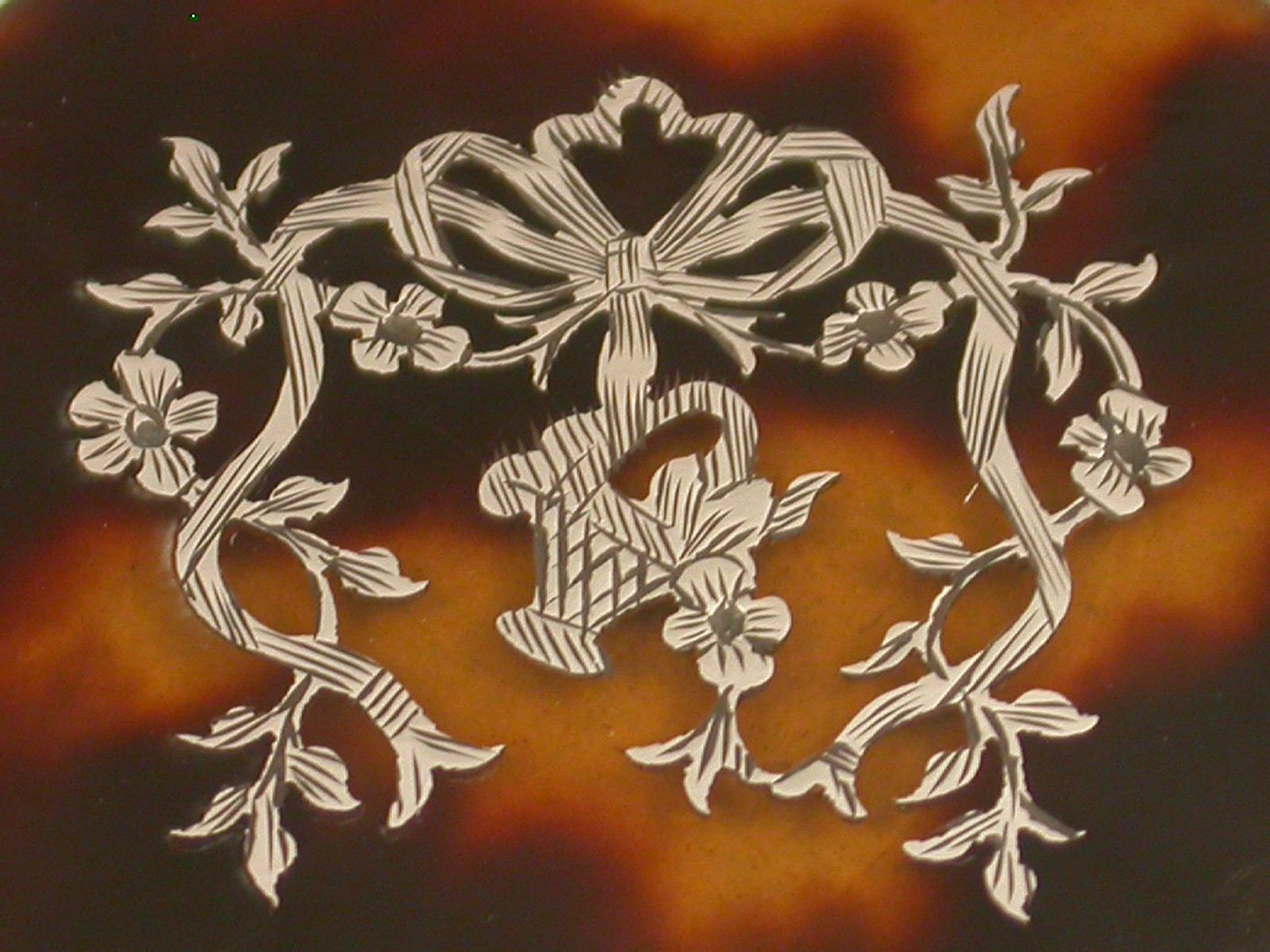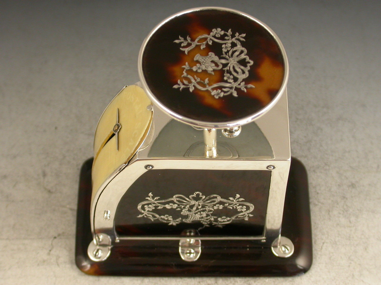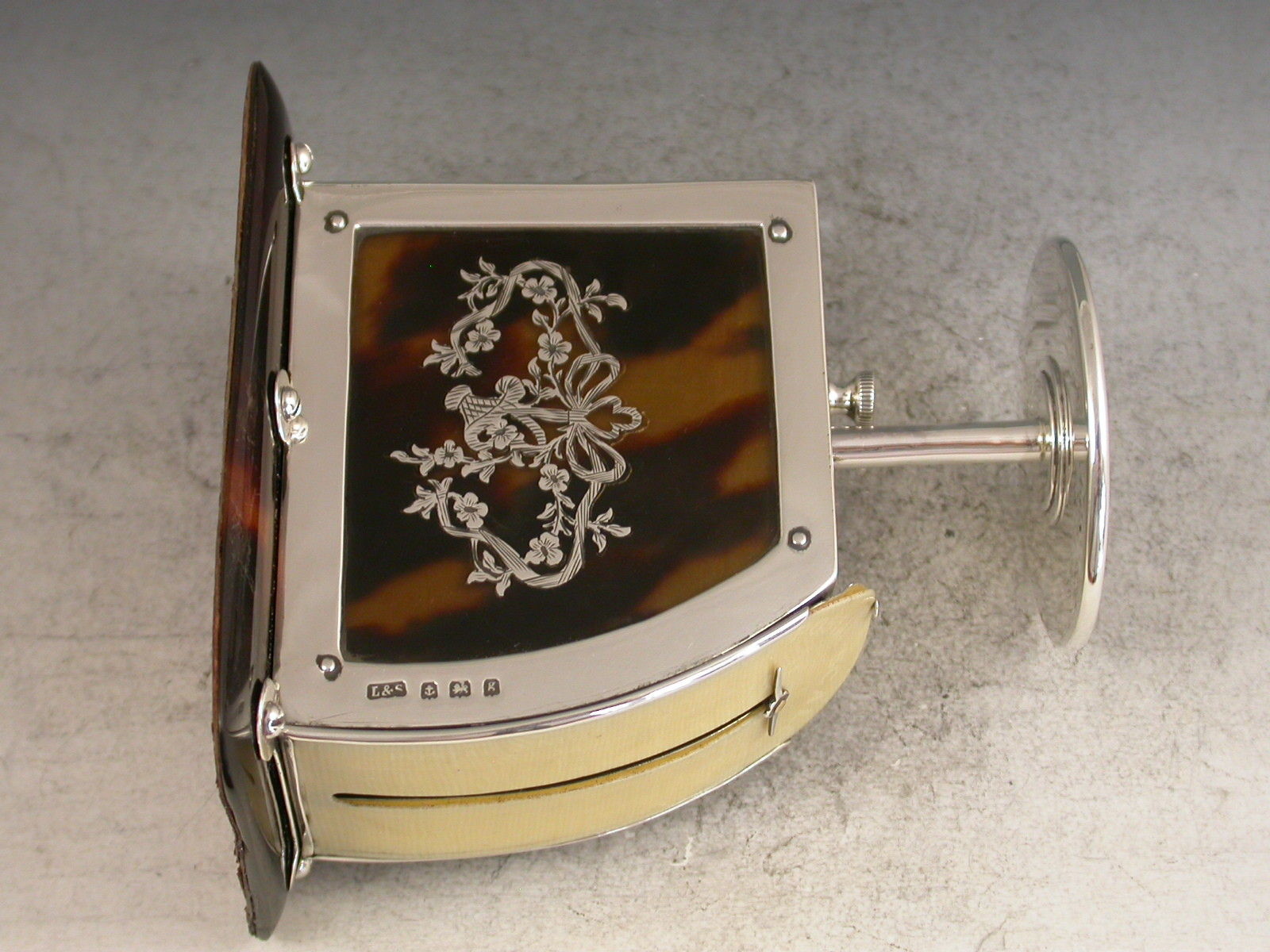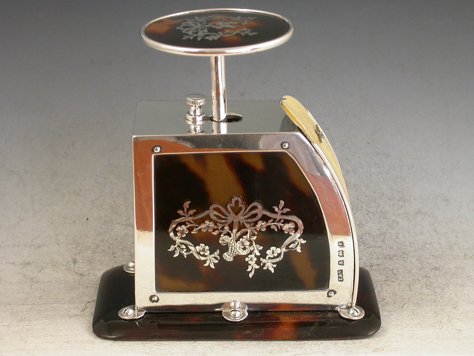 A very fine quality and unusual Edwardian silver bow front Postal Scale with removable celluloid scale, the tortoiseshell sides and letter pan finely decorated with inlaid silver pique work depicting flowers and ribbons, all on a rounded rectangular tortoiseshell base.