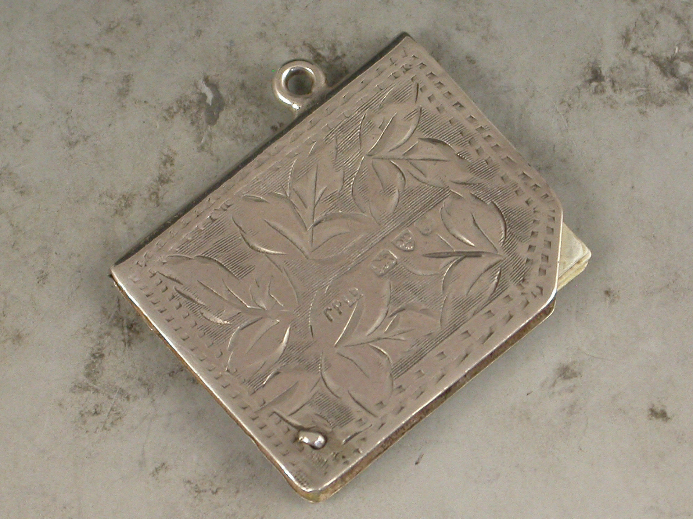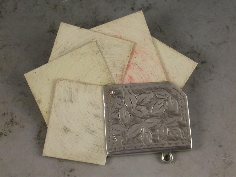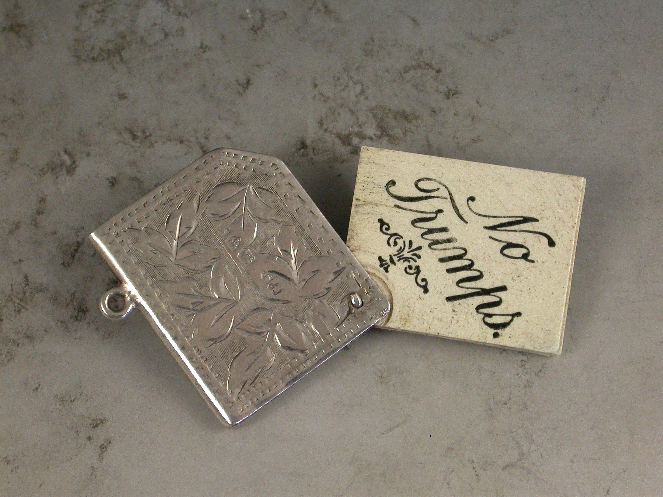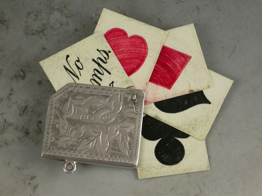 A good Edwardian silver Trumps Marker of book form with engraved foliate decoration and attached suspension ring, five swing-out ivory like pages painted with the four suits and no trumps.