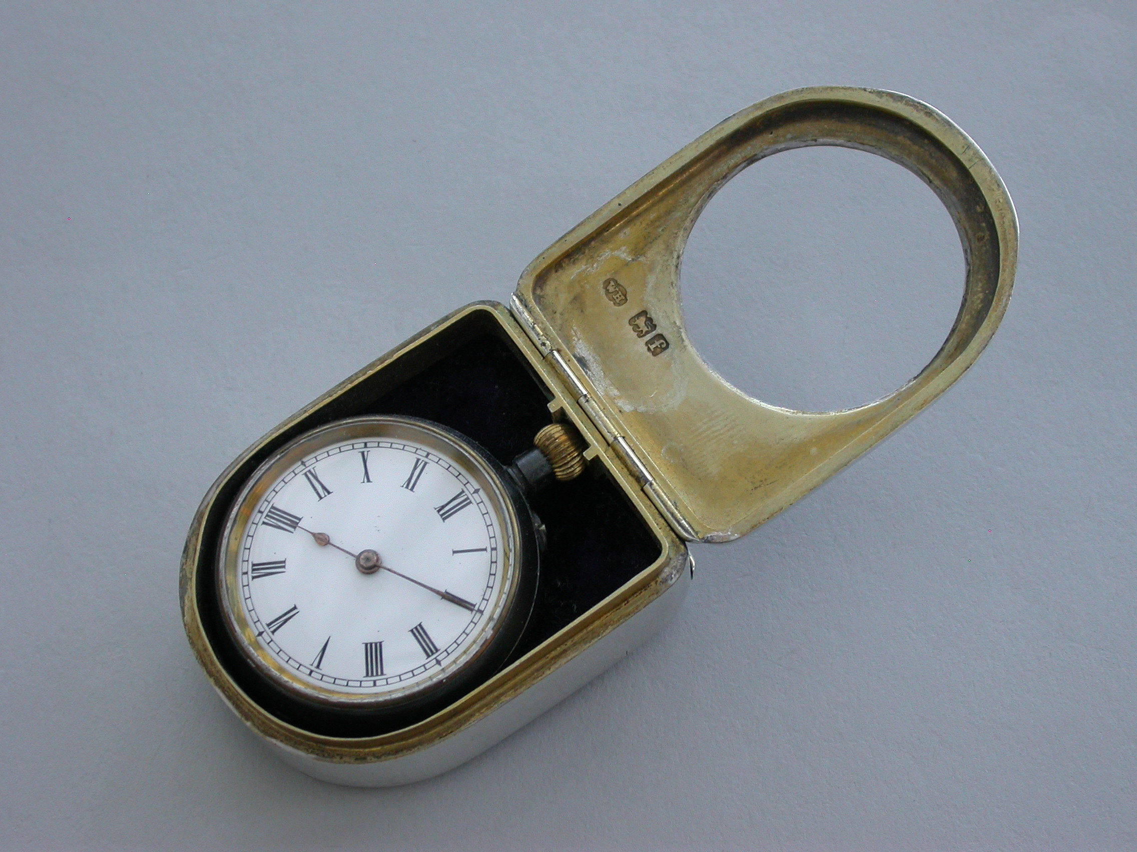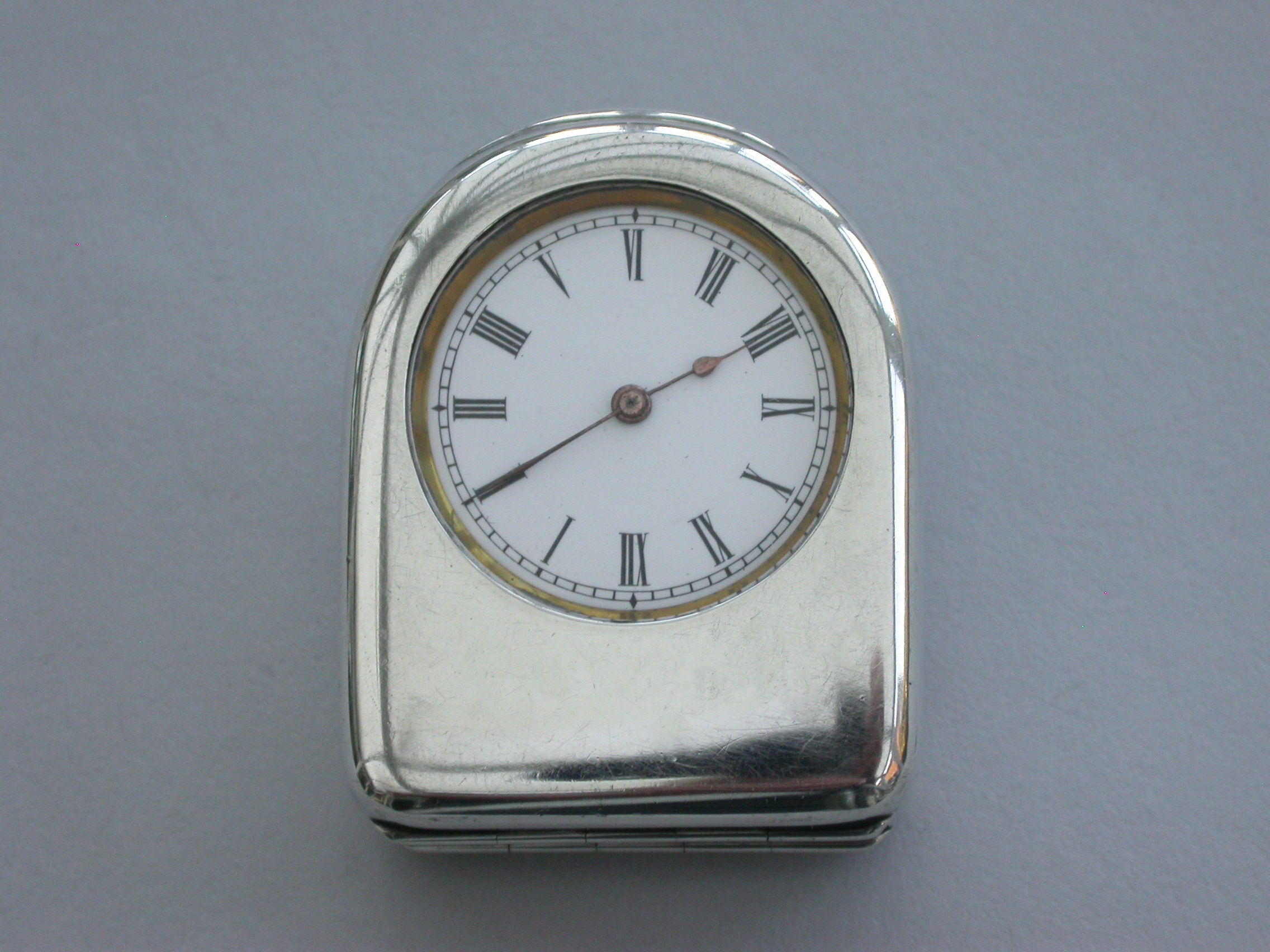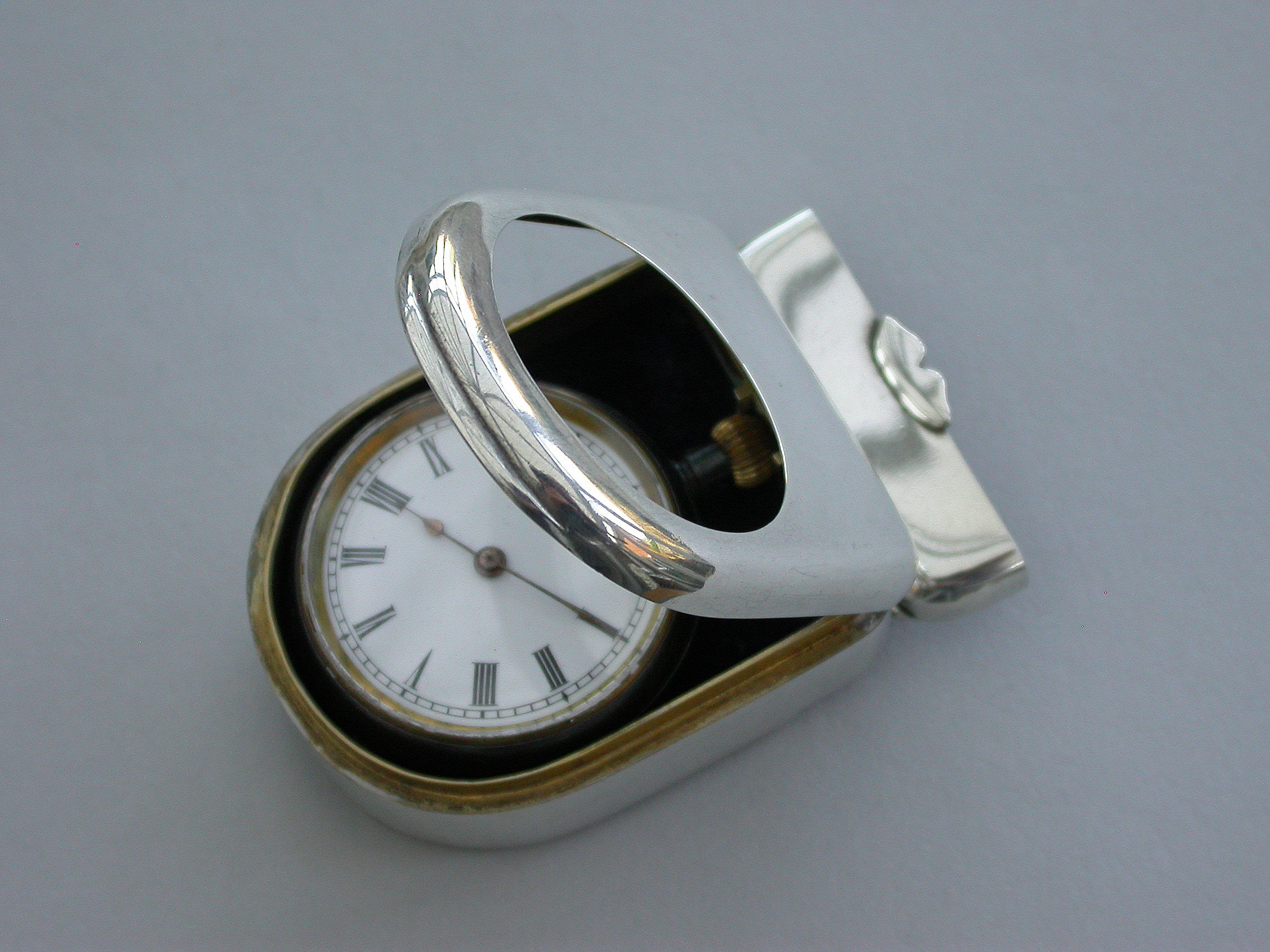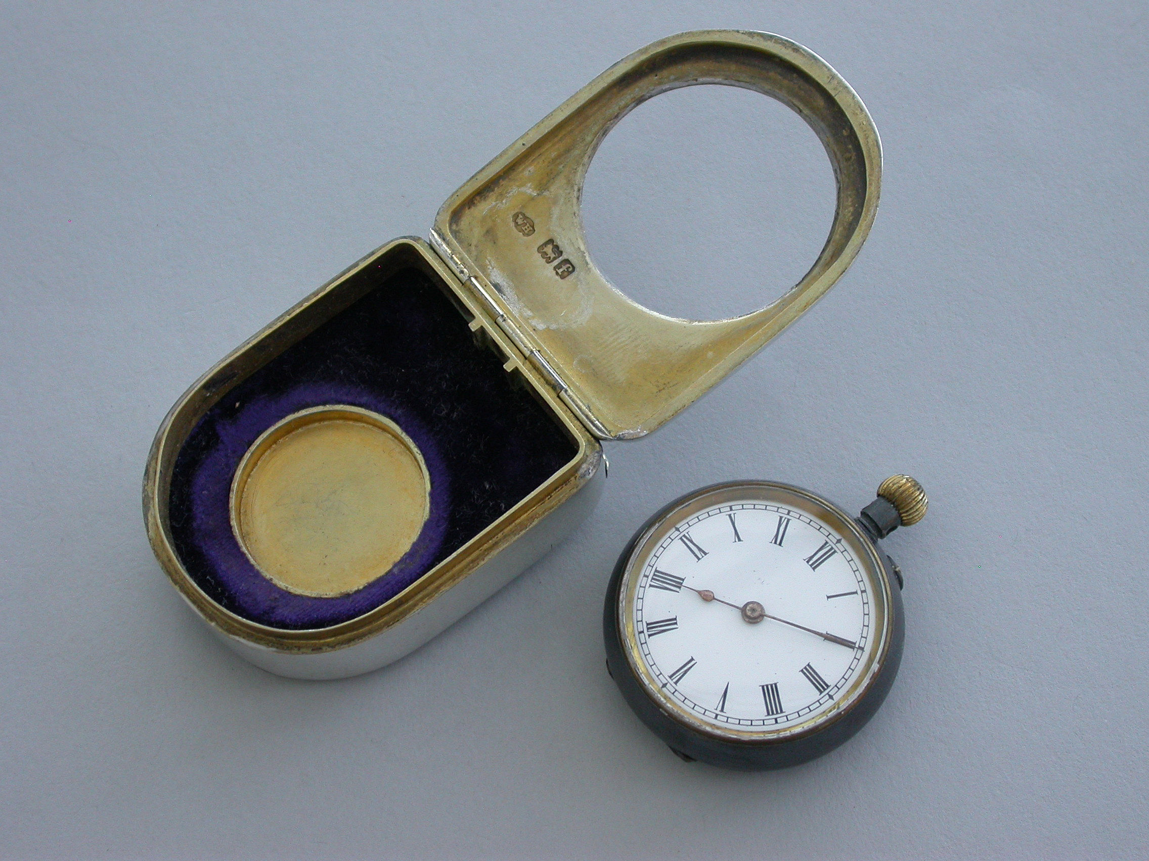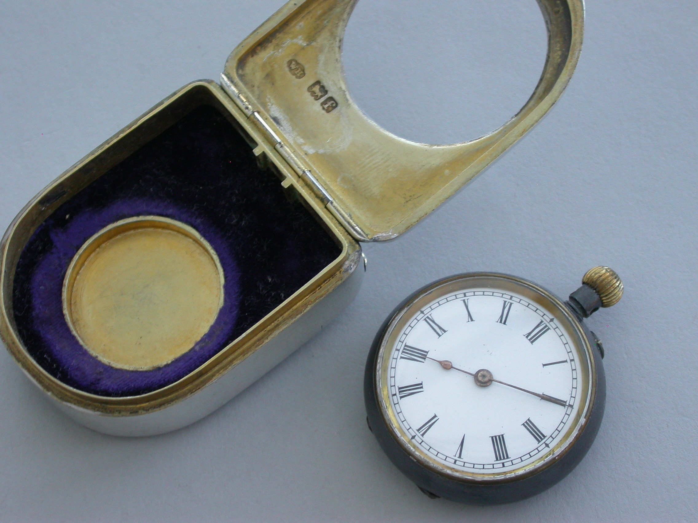 A fine quality Edwardian silver combination Vesta Case and Pocket Watch Holder of domed rounded rectangular form, with hinged lids and silver gilt interior lined with blue velvet. Complete with contemporary gun metal pocket watch.