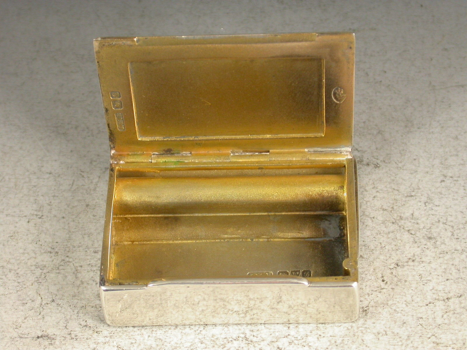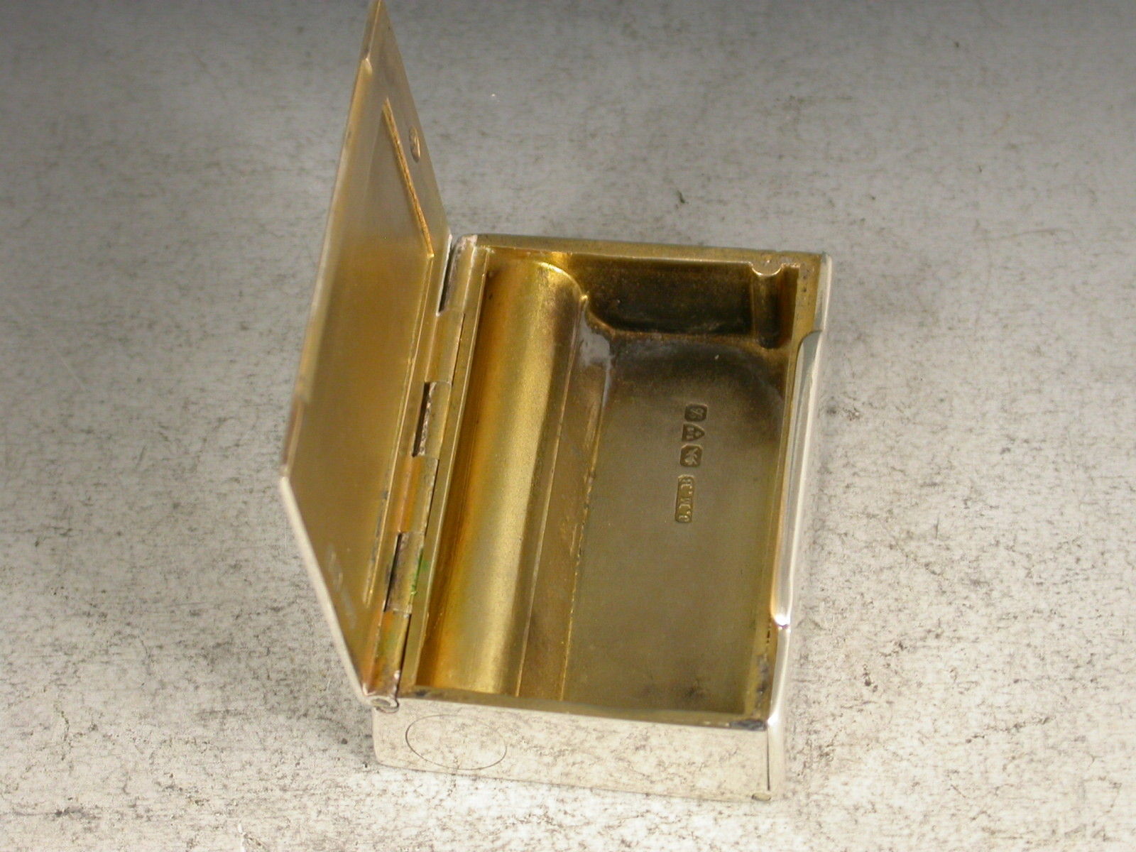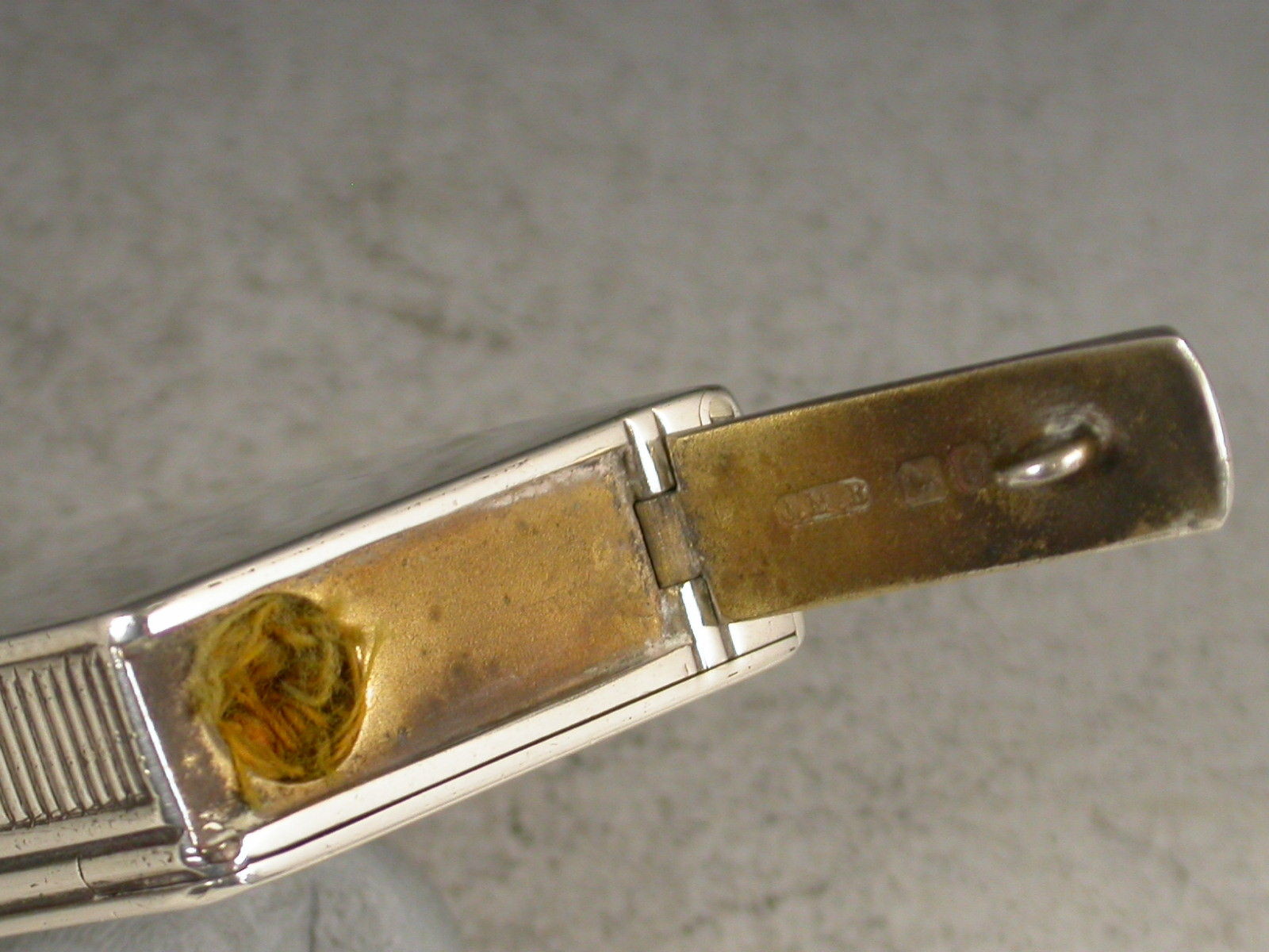 An unusual and nice quality Edwardian plain silver Vesta Case combined with a wick or slow match holder. The Vesta compartment with sprung lid held in place by the hinged side cover, a third hinged lid with attached loop that would have been fixed to the internal wick held within a tubular compartment. Silver gilt interiors.