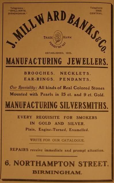 John Millward Banks registered marks at the London, Birmingham and Chester assay offices. His company's works were at 6 & 7, Northampton Street, Birmingham and their London showrooms situated at 12, 14, Beak Street, Regent Street.