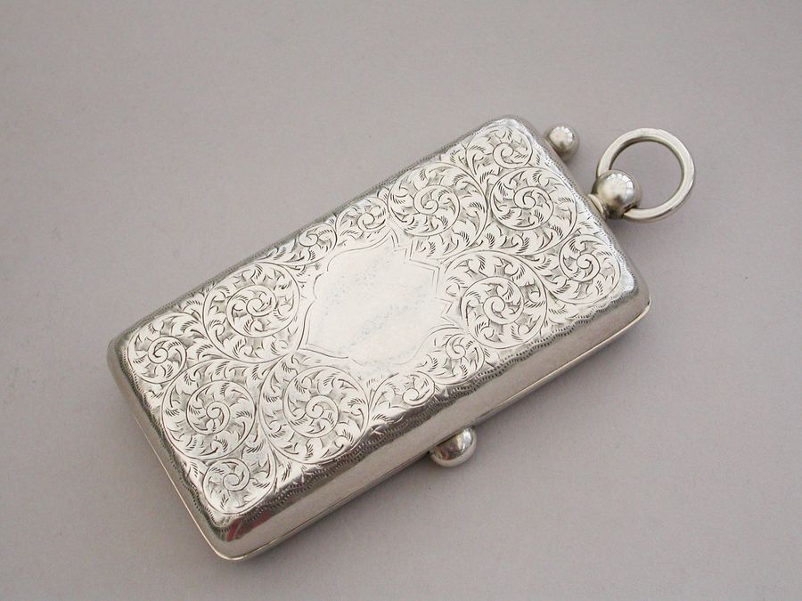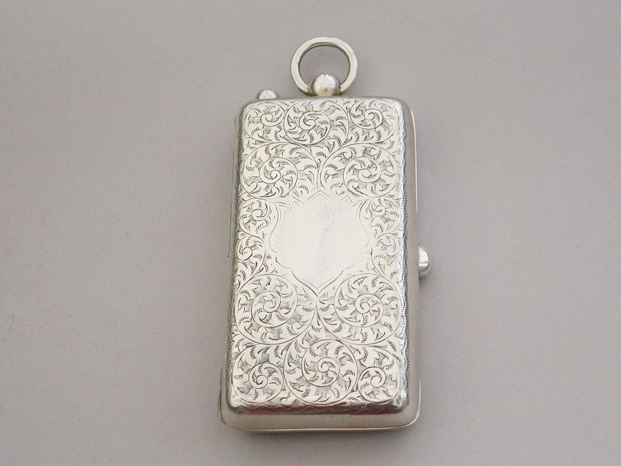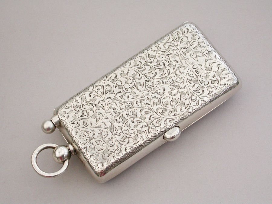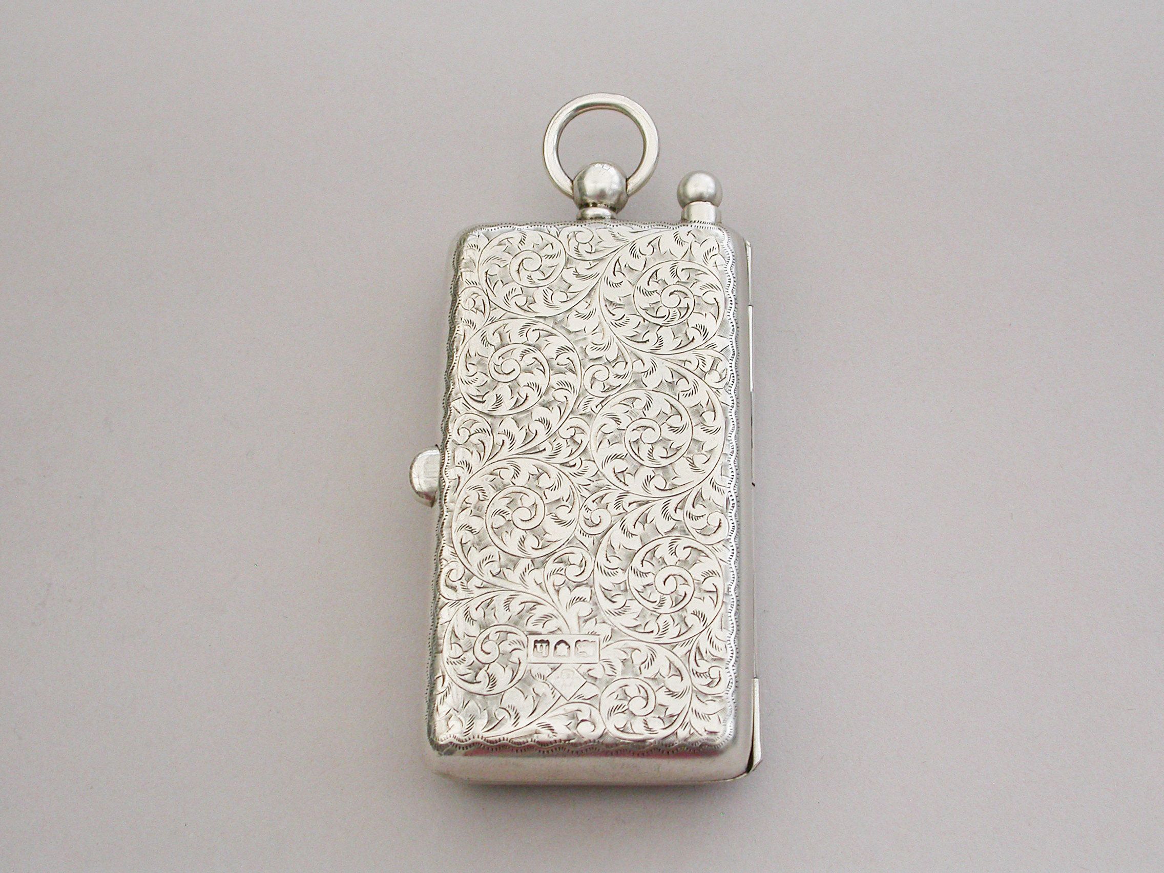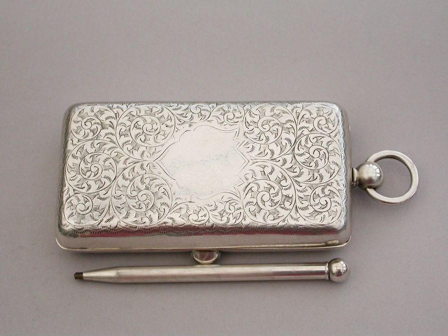 A good quality Edwardian Silver Combined Sovereign Case, Stamp Holder, Propelling Pencil and Note Case, of rounded rectangular form with foliate scroll engraved decoration and a vacant shield shaped cartouche, attached suspension ring and integral silver propelling pencil, a sprung push-button opening mechanism to the interior with full and half sovereign holders, a sprung stamp compartment and two clips to the lid to hold a note pad.