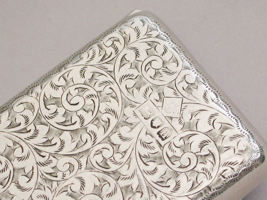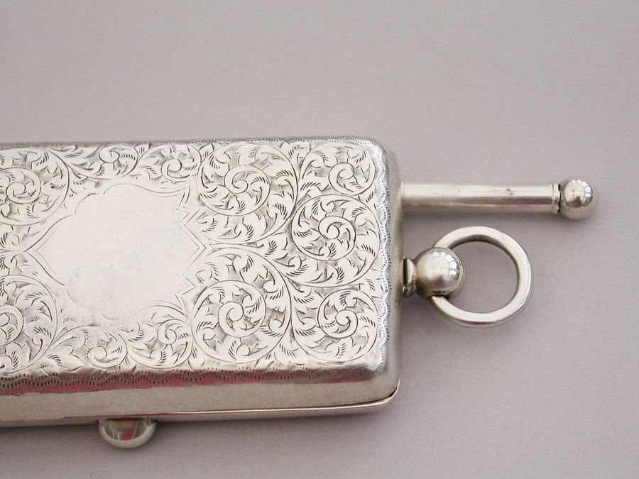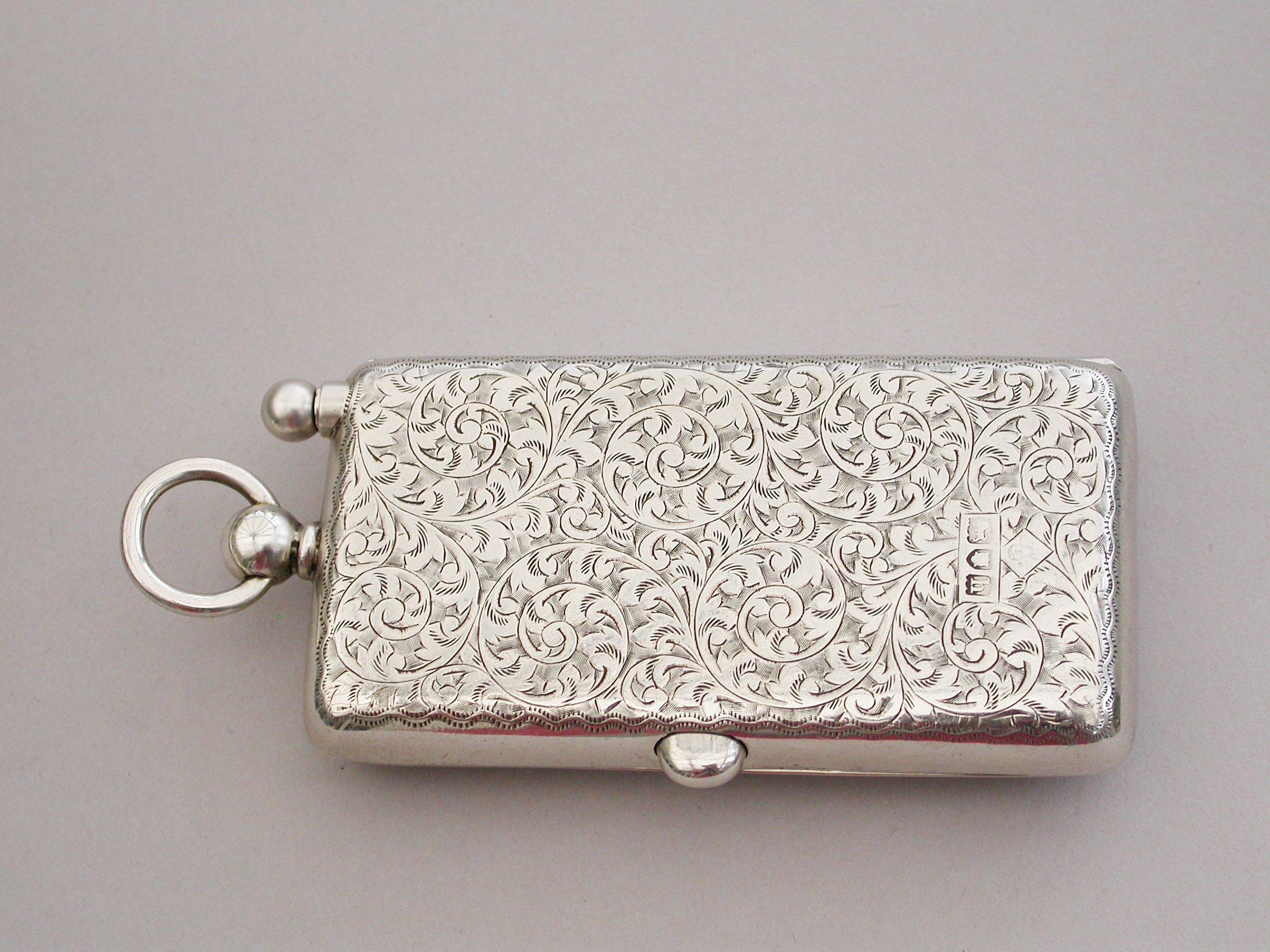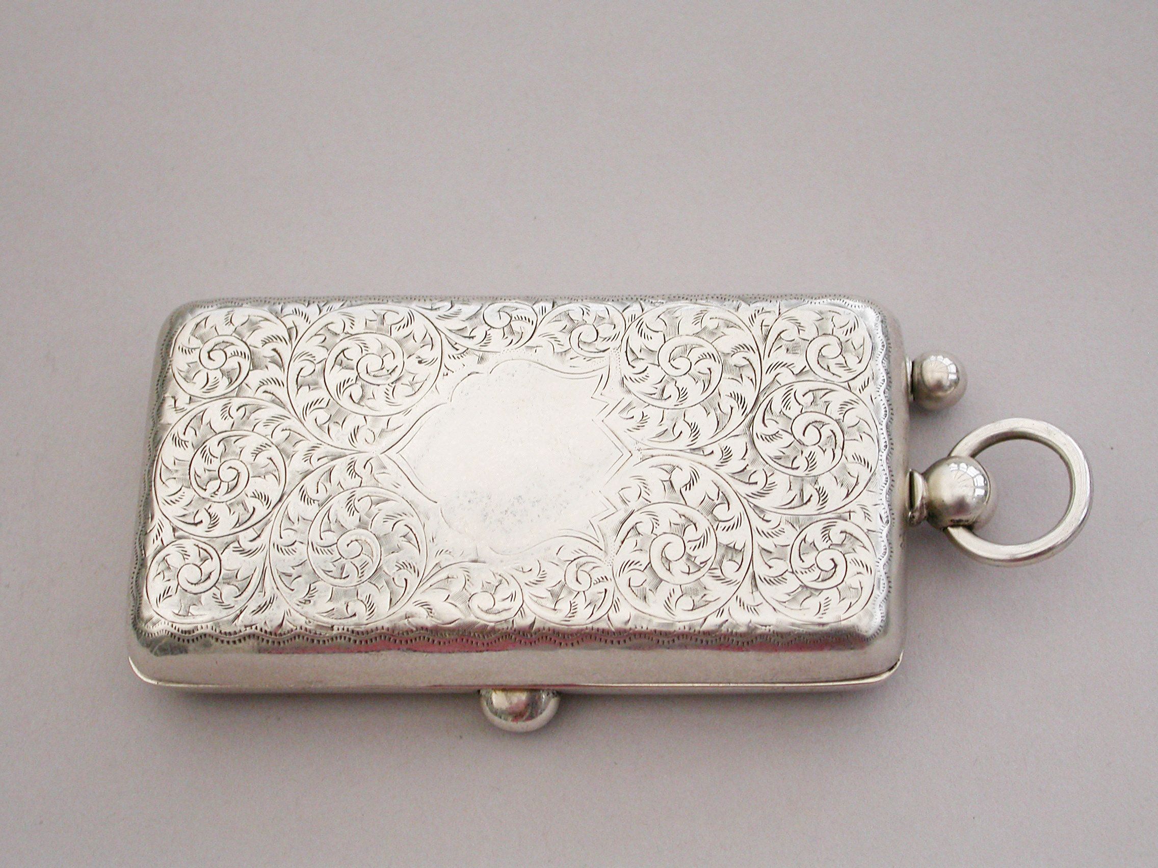 A good quality Edwardian Silver Combined Sovereign Case, Stamp Holder, Propelling Pencil and Note Case, of rounded rectangular form with foliate scroll engraved decoration and a vacant shield shaped cartouche, attached suspension ring and integral silver propelling pencil, a sprung push-button opening mechanism to the interior with full and half sovereign holders, a sprung stamp compartment and two clips to the lid to hold a note pad.