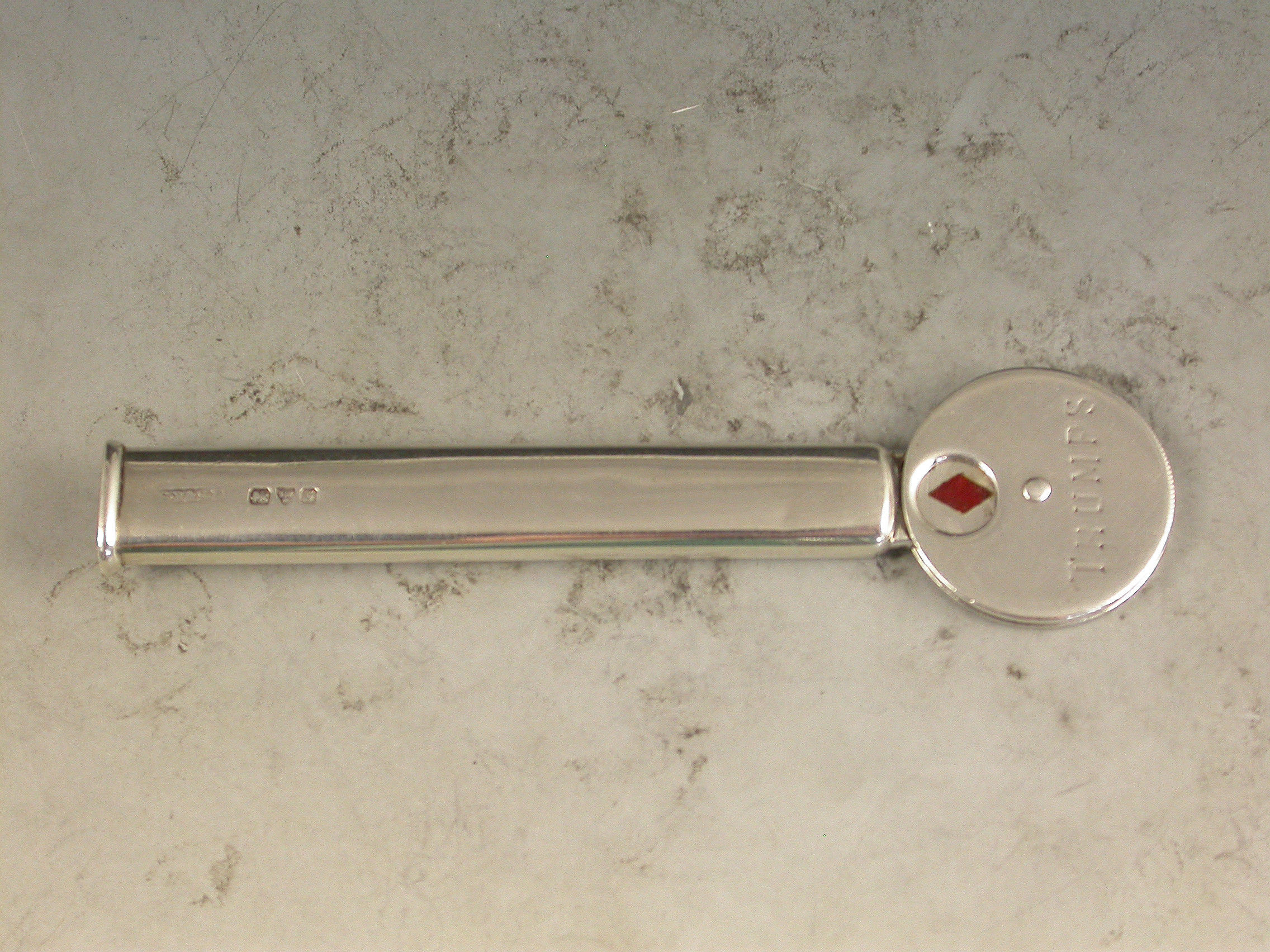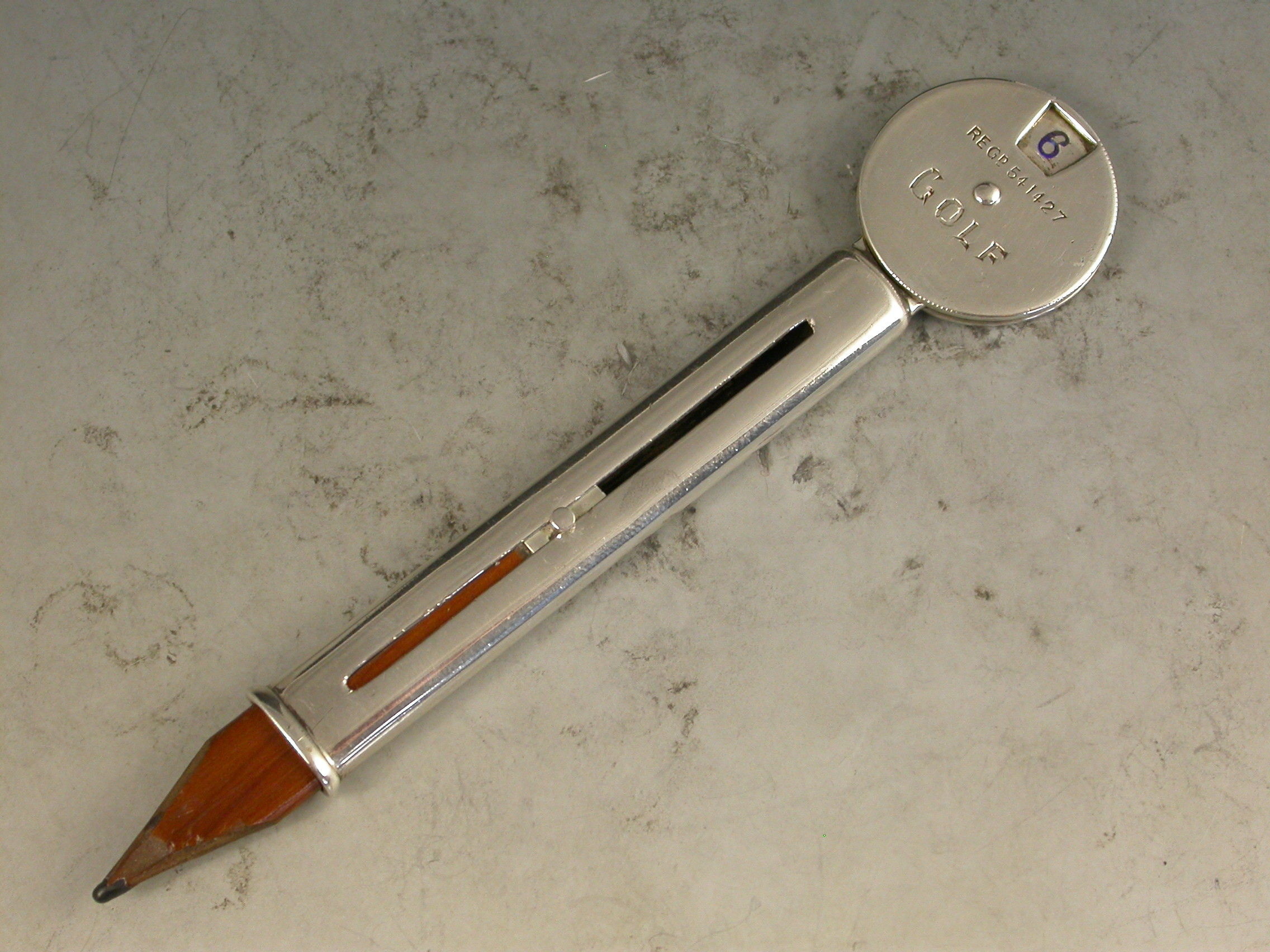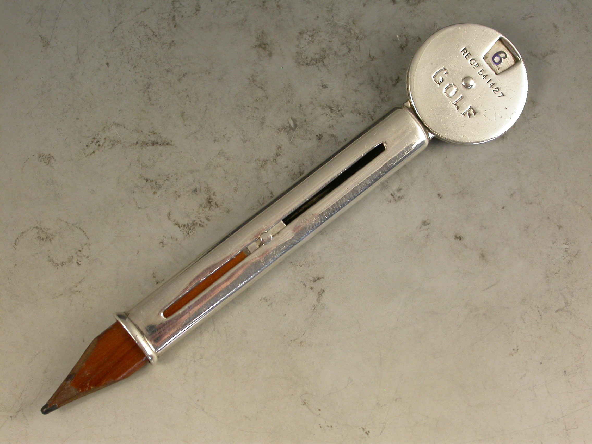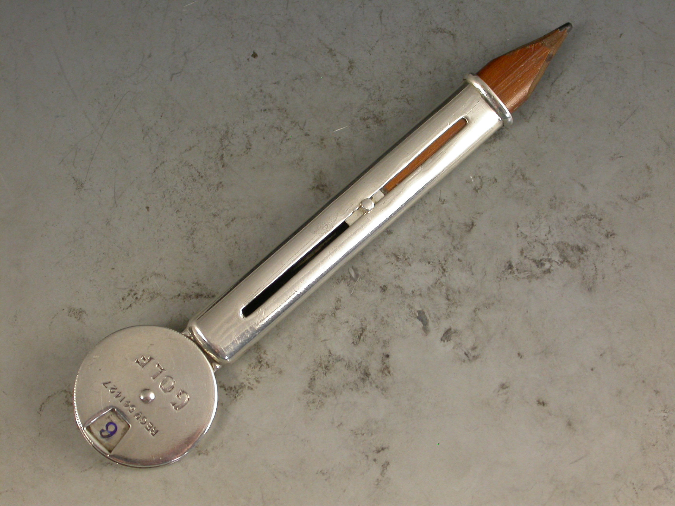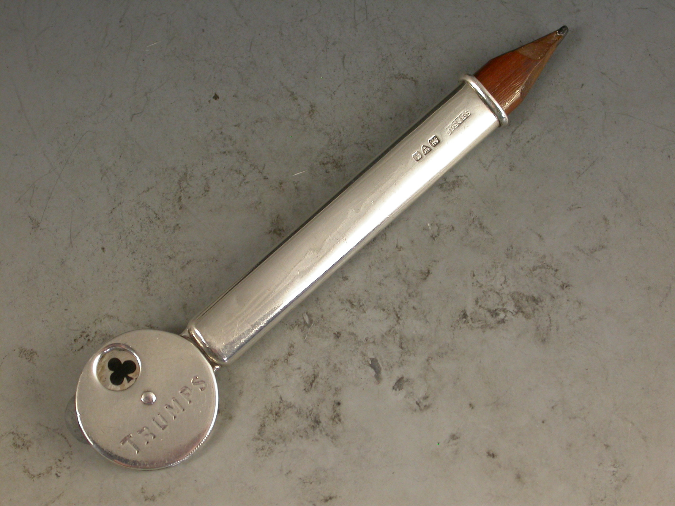 An unusual Edwardian silver mounted sliding cedar Pencil, the rotating circular terminal with one side engraved for 'Trumps' and the other for 'Golf'. The internal dial enameled with numbers and suits.