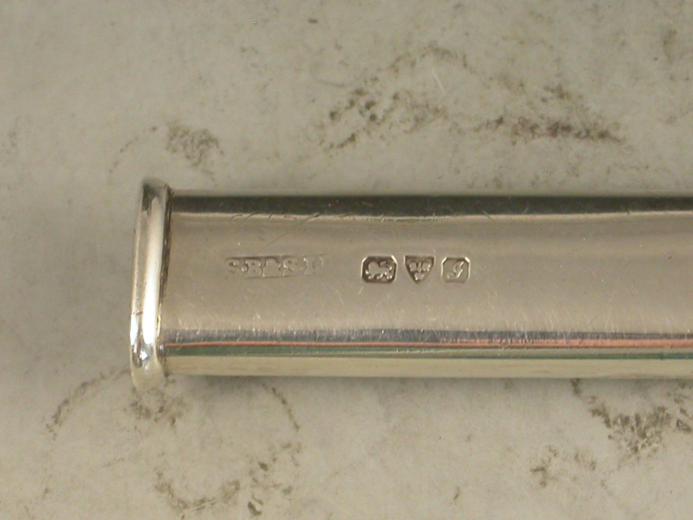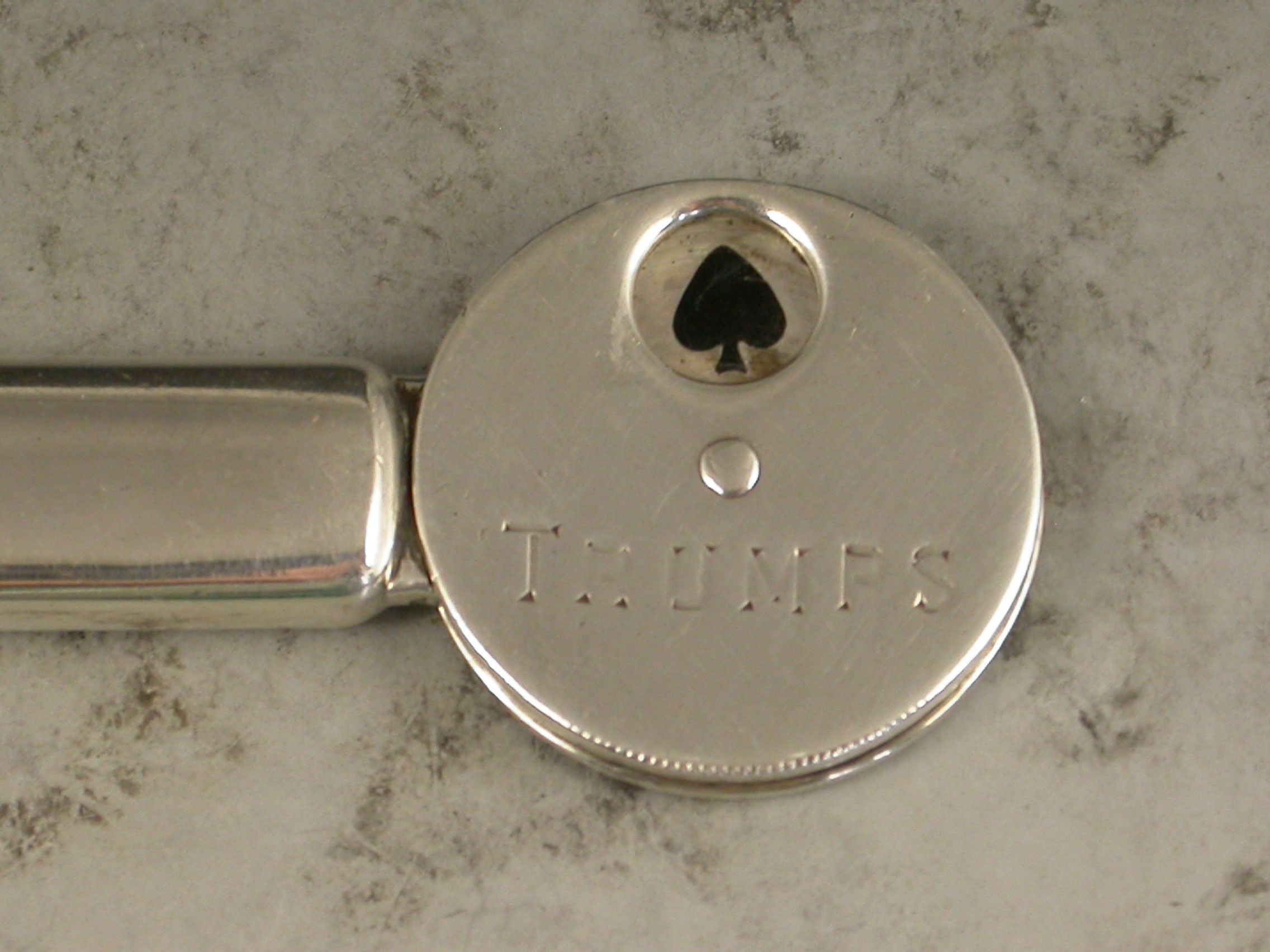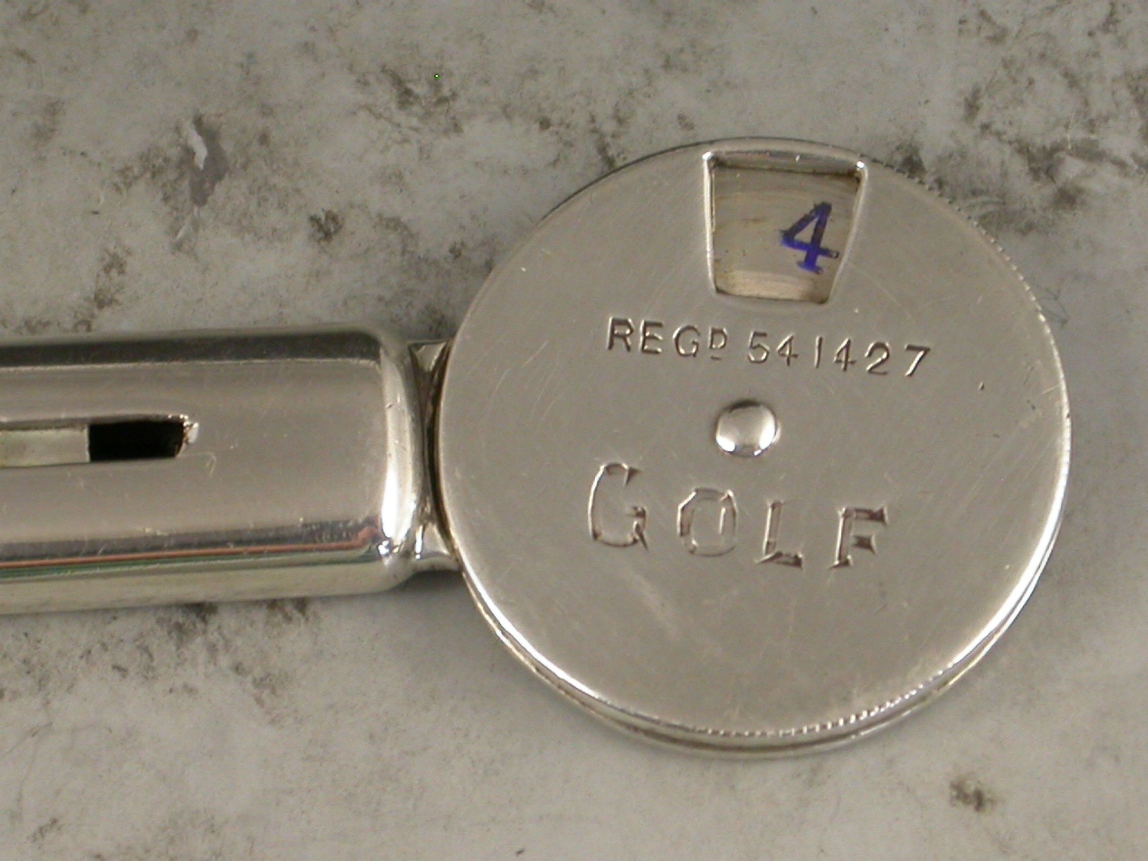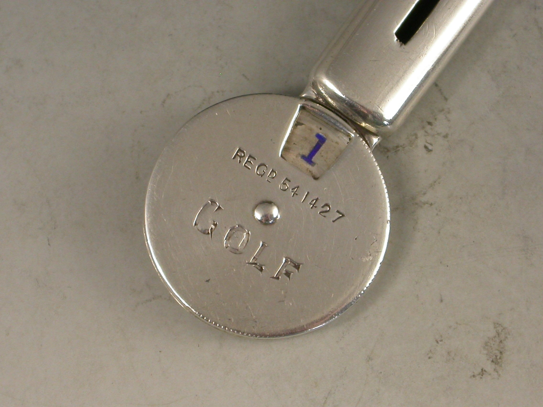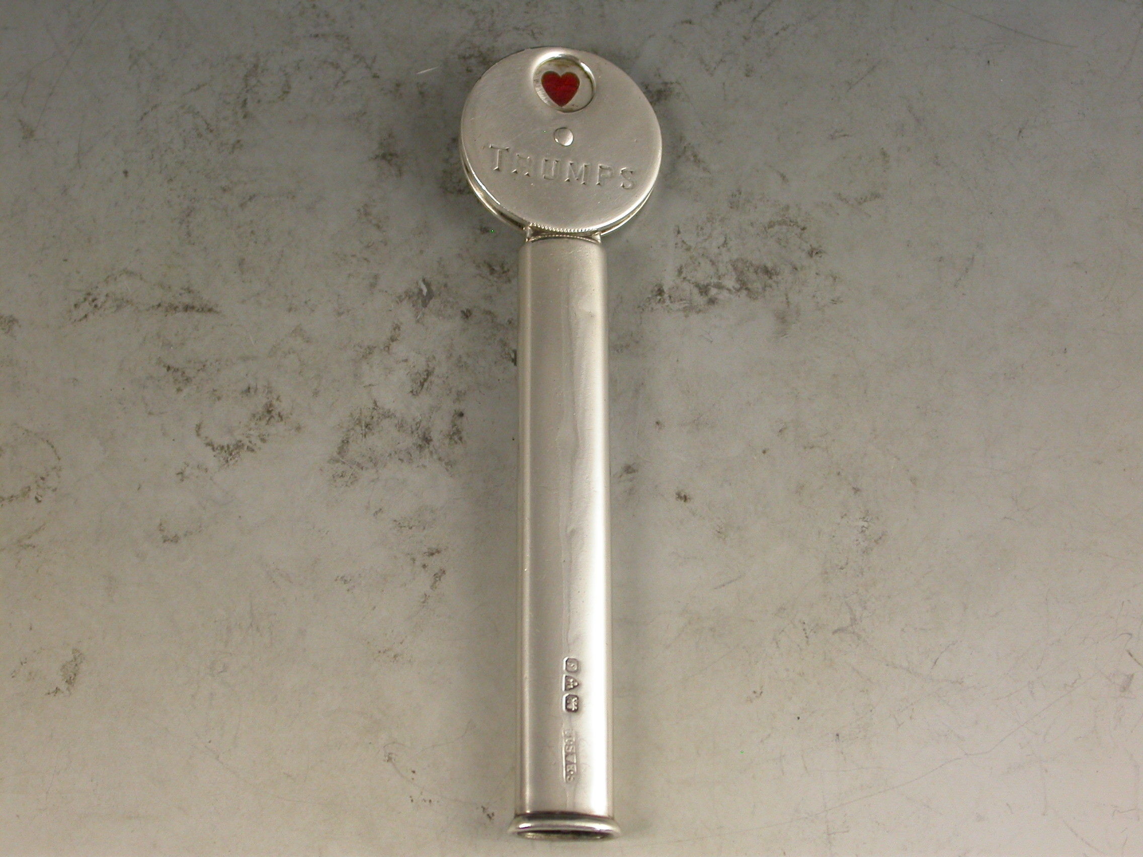 An unusual Edwardian silver mounted sliding cedar Pencil, the rotating circular terminal with one side engraved for 'Trumps' and the other for 'Golf'. The internal dial enameled with numbers and suits.
