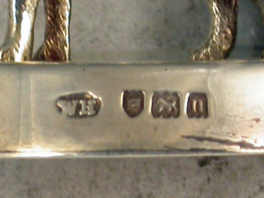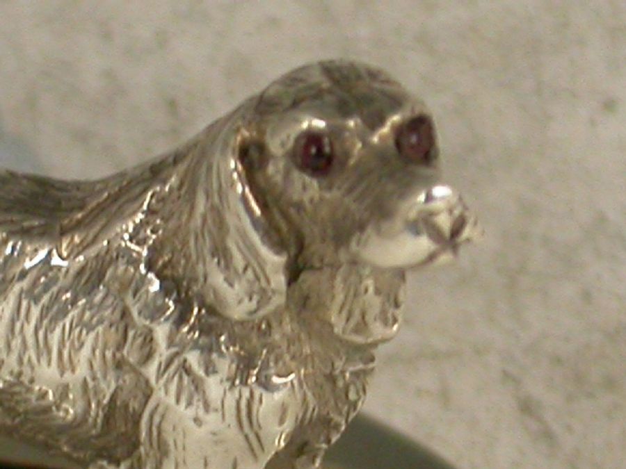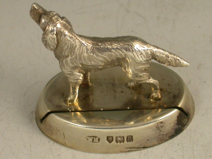 A fine quality Edwardian heavy cast silver Menu Holder, made in the form of a golden retriever dog, with red glass eyes, standing on a filled slotted oval base.