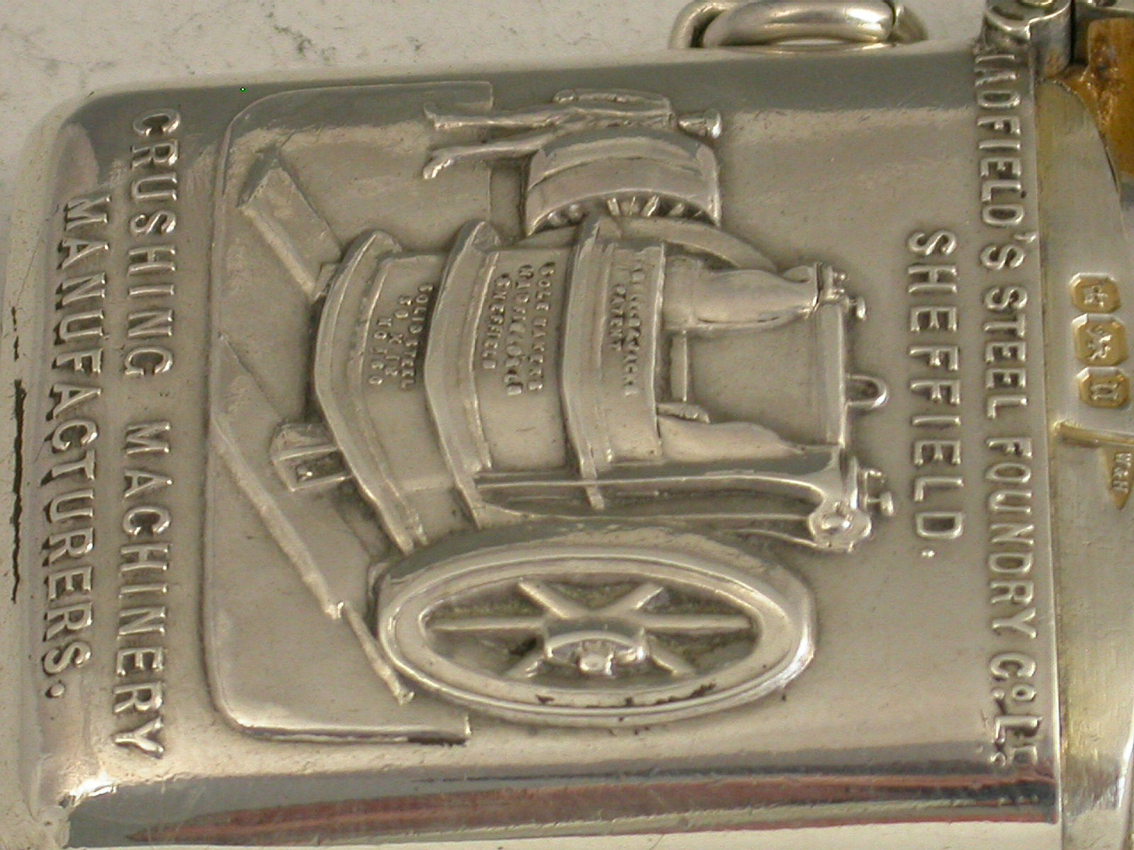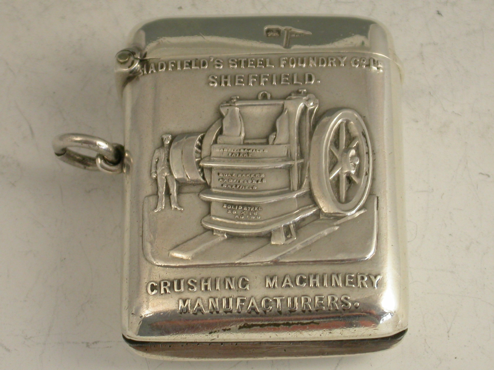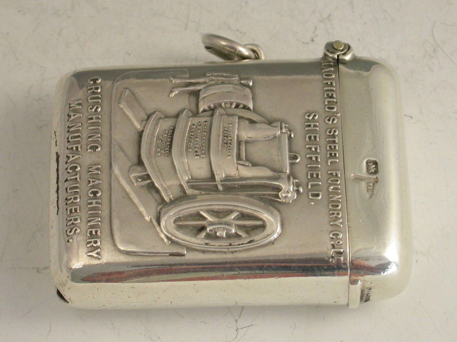 A rare Edwardian silver Vesta Case of rounded rectangular form with hinged flip top lid, the face embossed with a steel crushing machine and ""Hadfield's Steel Foundry Co Ltd, Sheffield, Crushing Machinery Manufacturers"".