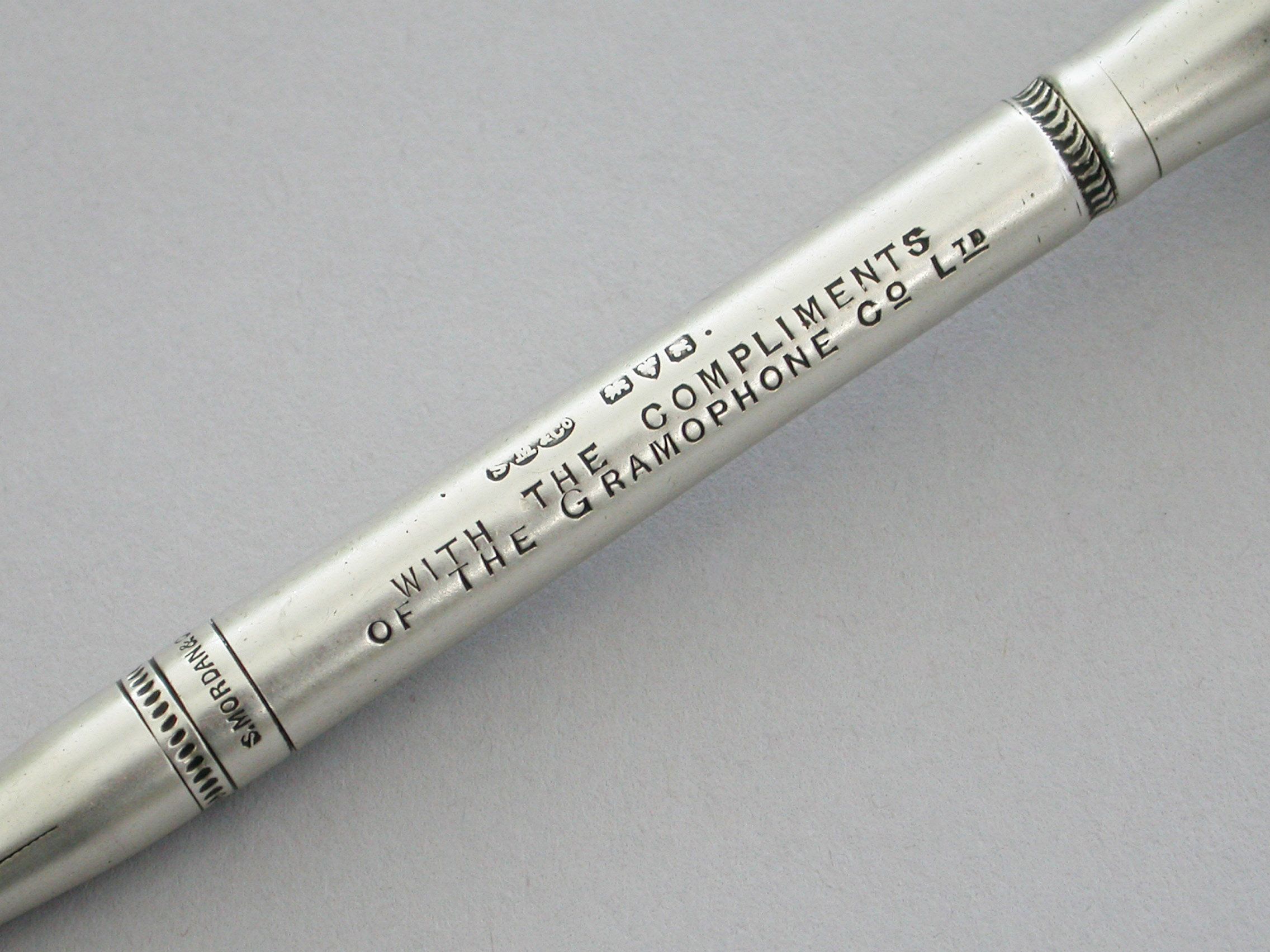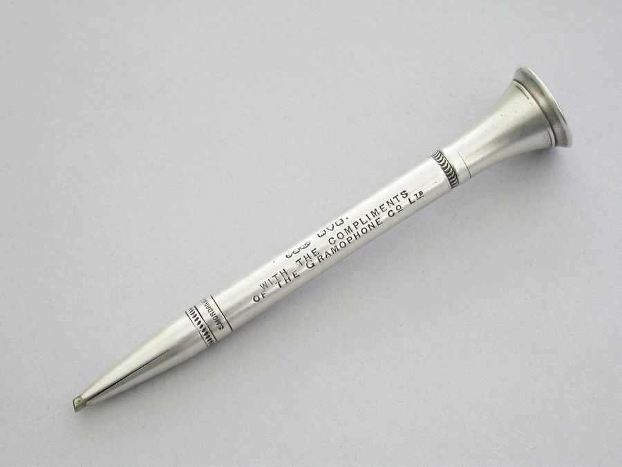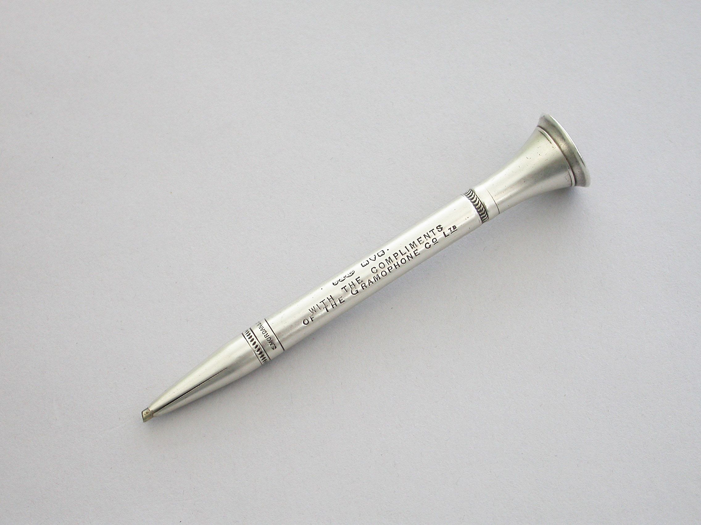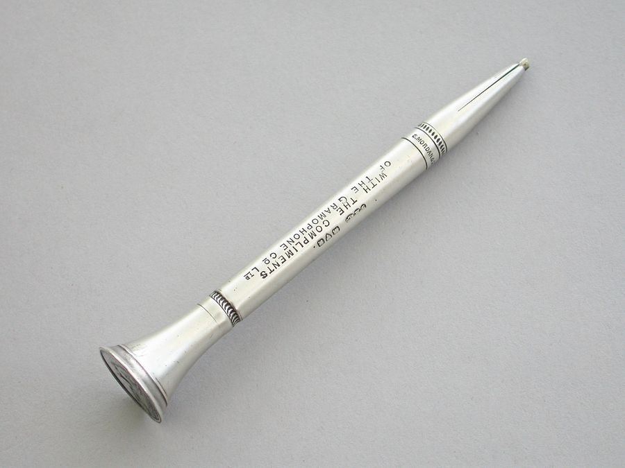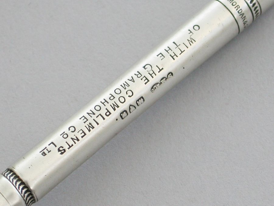 A rare early 20th century silver advertising Propelling Pencil, of plain tubular form with flared terminal set with the trademark of the Gramophone Company Ltd, depicting a dog named Nipper curiously peering into the horn of a wind-up gramophone. The nozzle twists to propel the lead. The barrel engraved - 'With the Compliments of the Gramophone Co Ltd'.