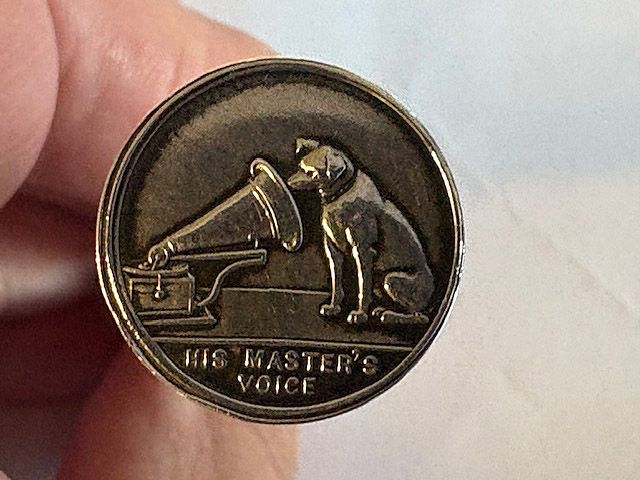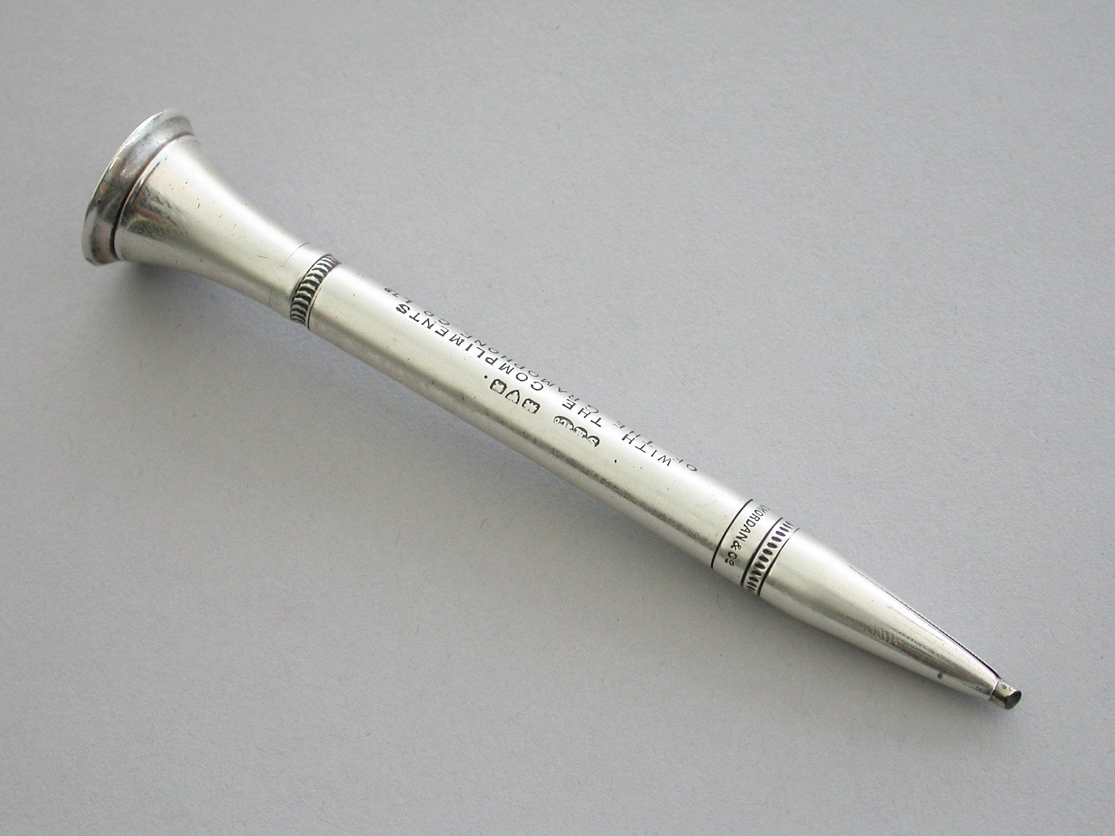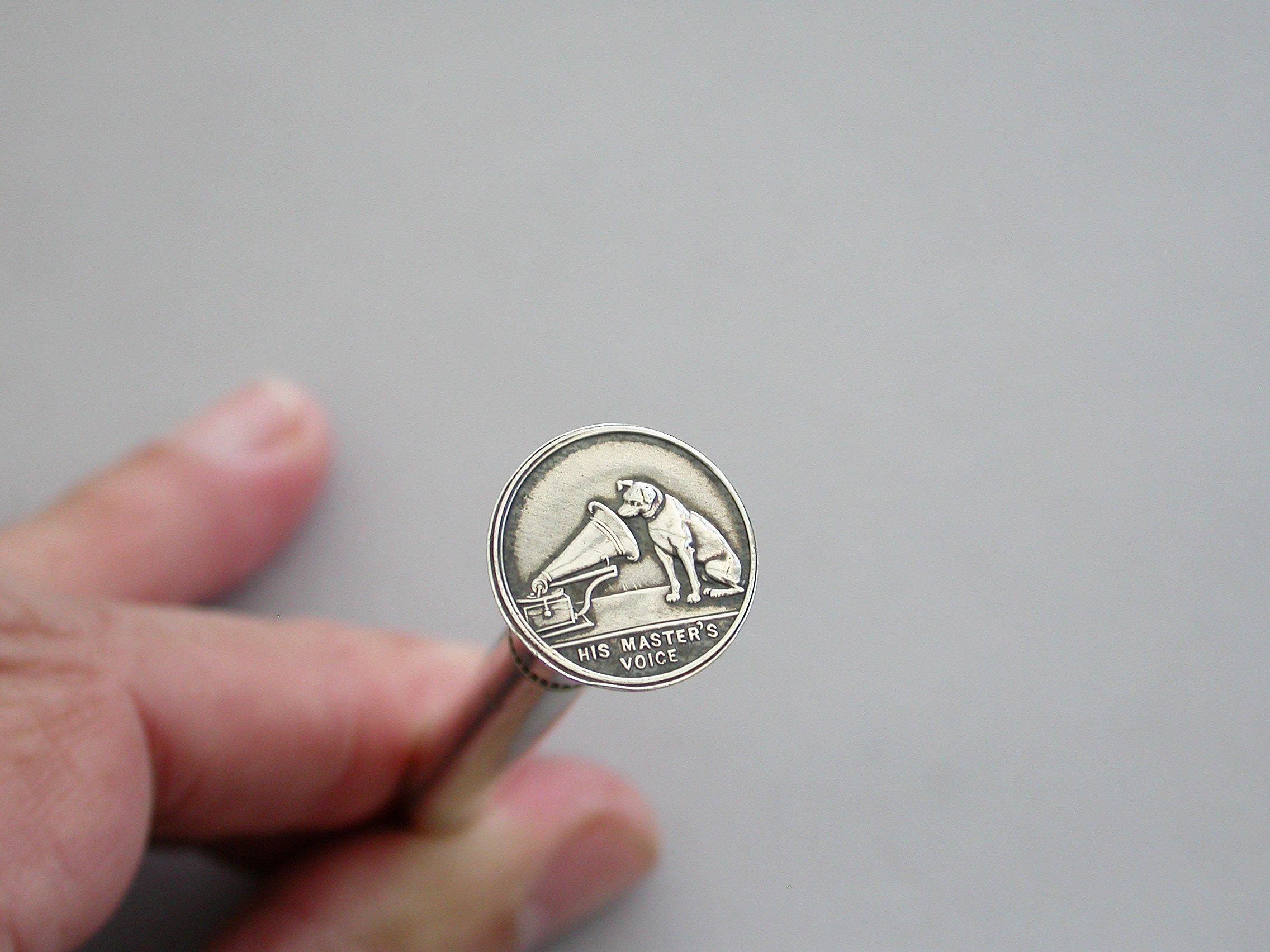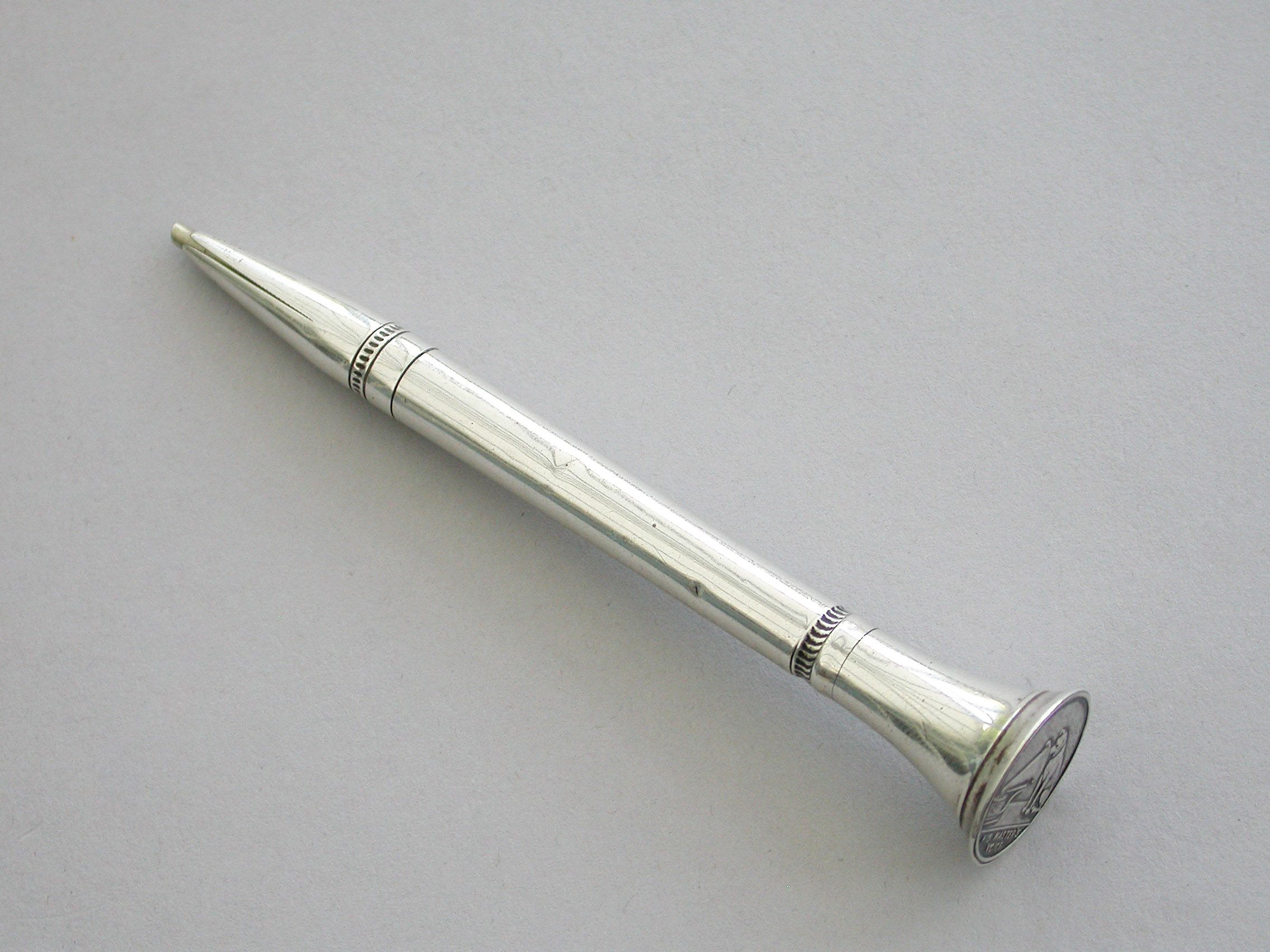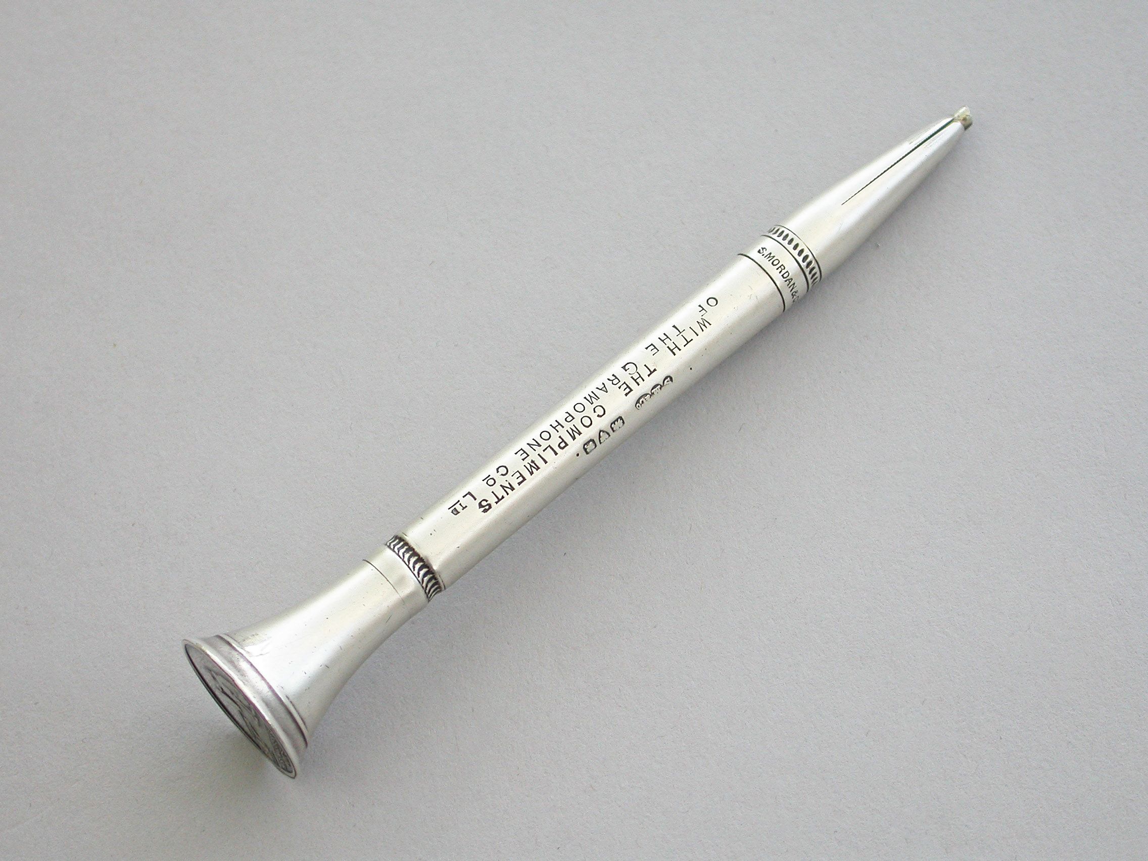 A rare early 20th century silver advertising Propelling Pencil, of plain tubular form with flared terminal set with the trademark of the Gramophone Company Ltd, depicting a dog named Nipper curiously peering into the horn of a wind-up gramophone. The nozzle twists to propel the lead. The barrel engraved - 'With the Compliments of the Gramophone Co Ltd'.