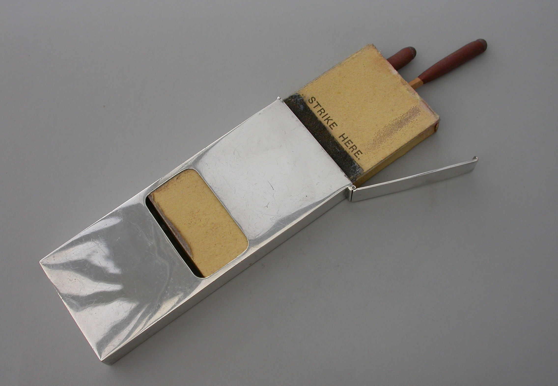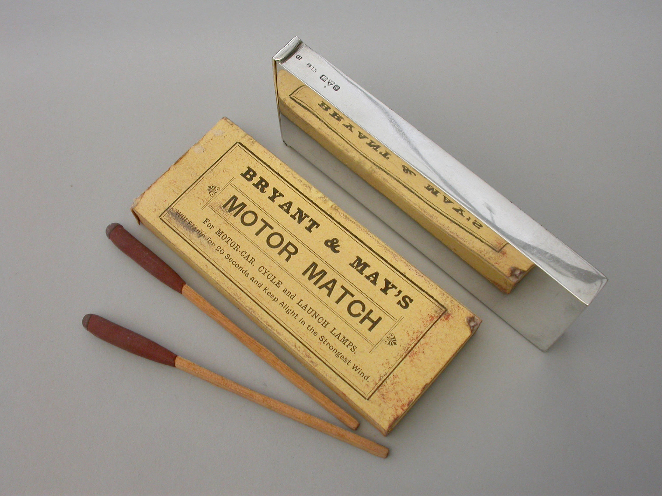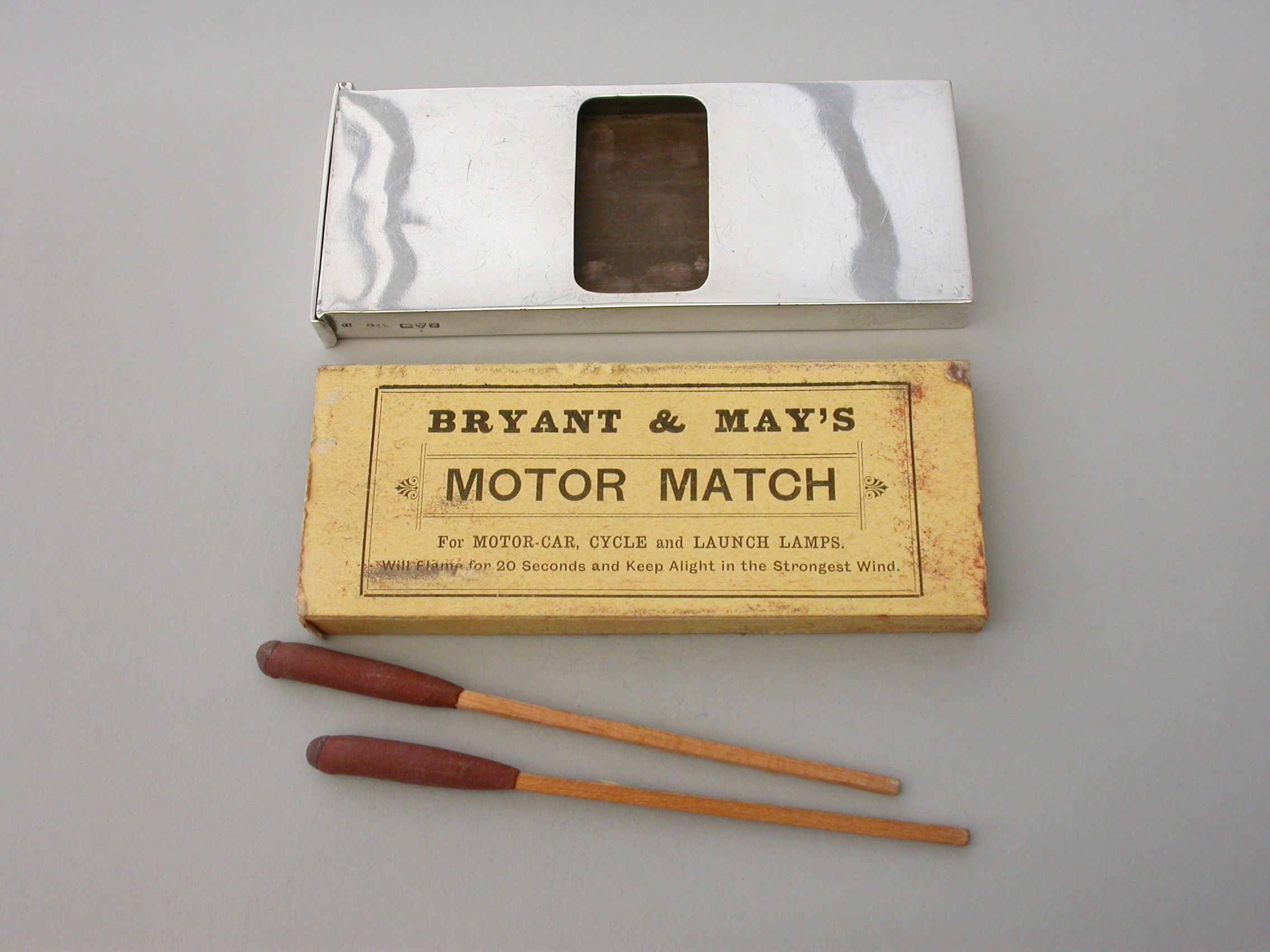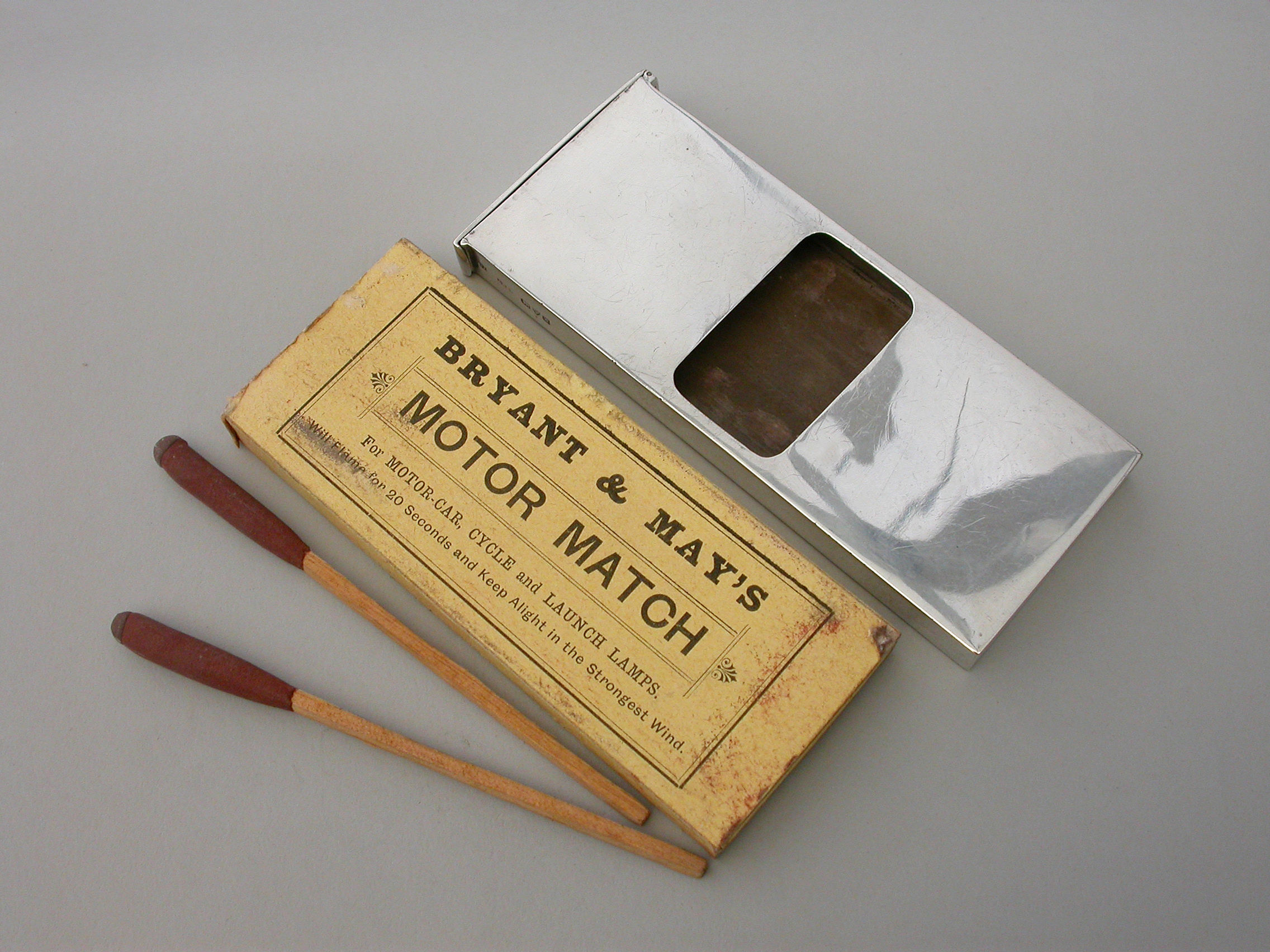 An unusual Edwardian large silver Matchbox Case of plain narrow rectangualr form with hinged lid and aperture for striking, containing an original box of Bryant & May's ""Motor Matches"", for motor-car, cycle and launch lamps. Will flame for 20 seconds and keep alight in the strongest wind. Complete with two original matches.