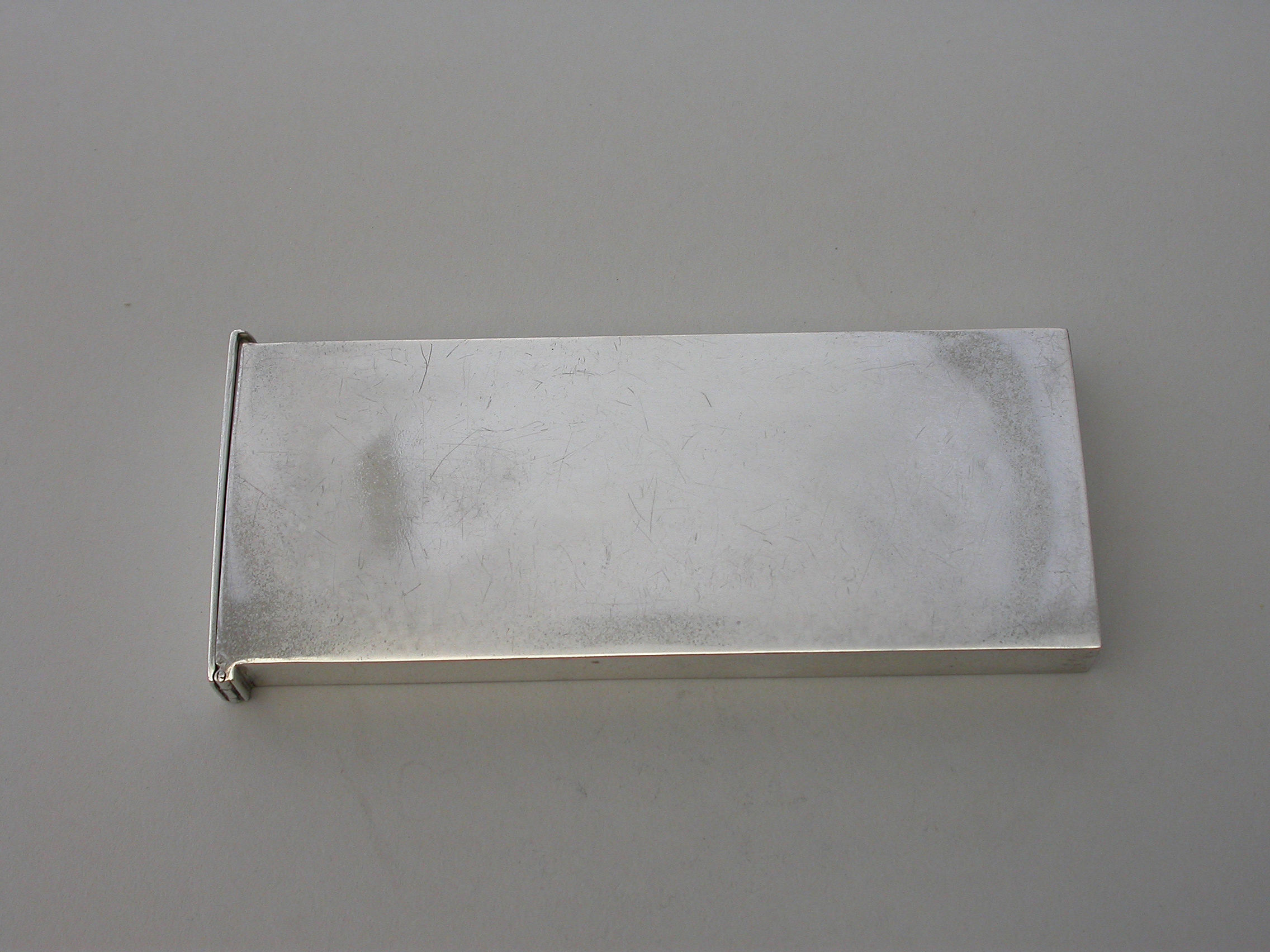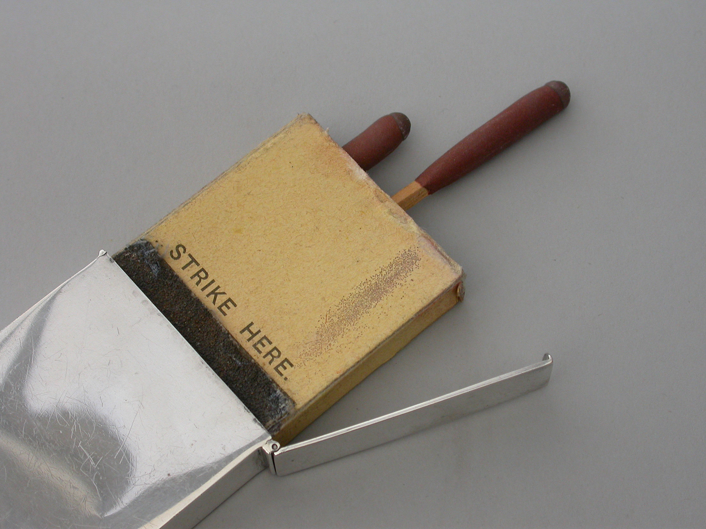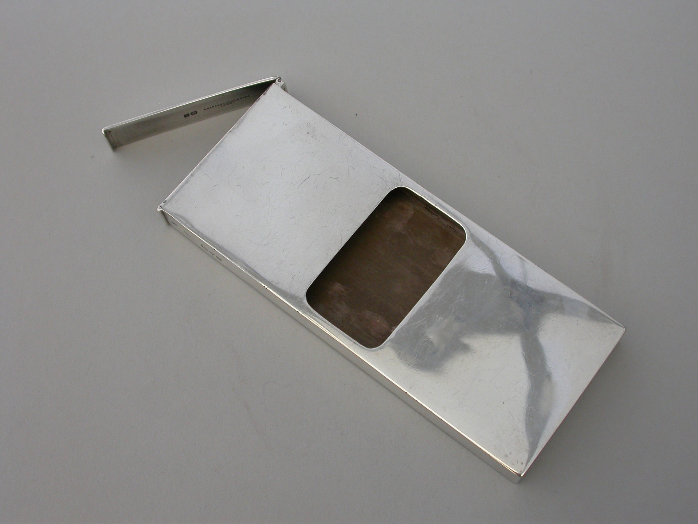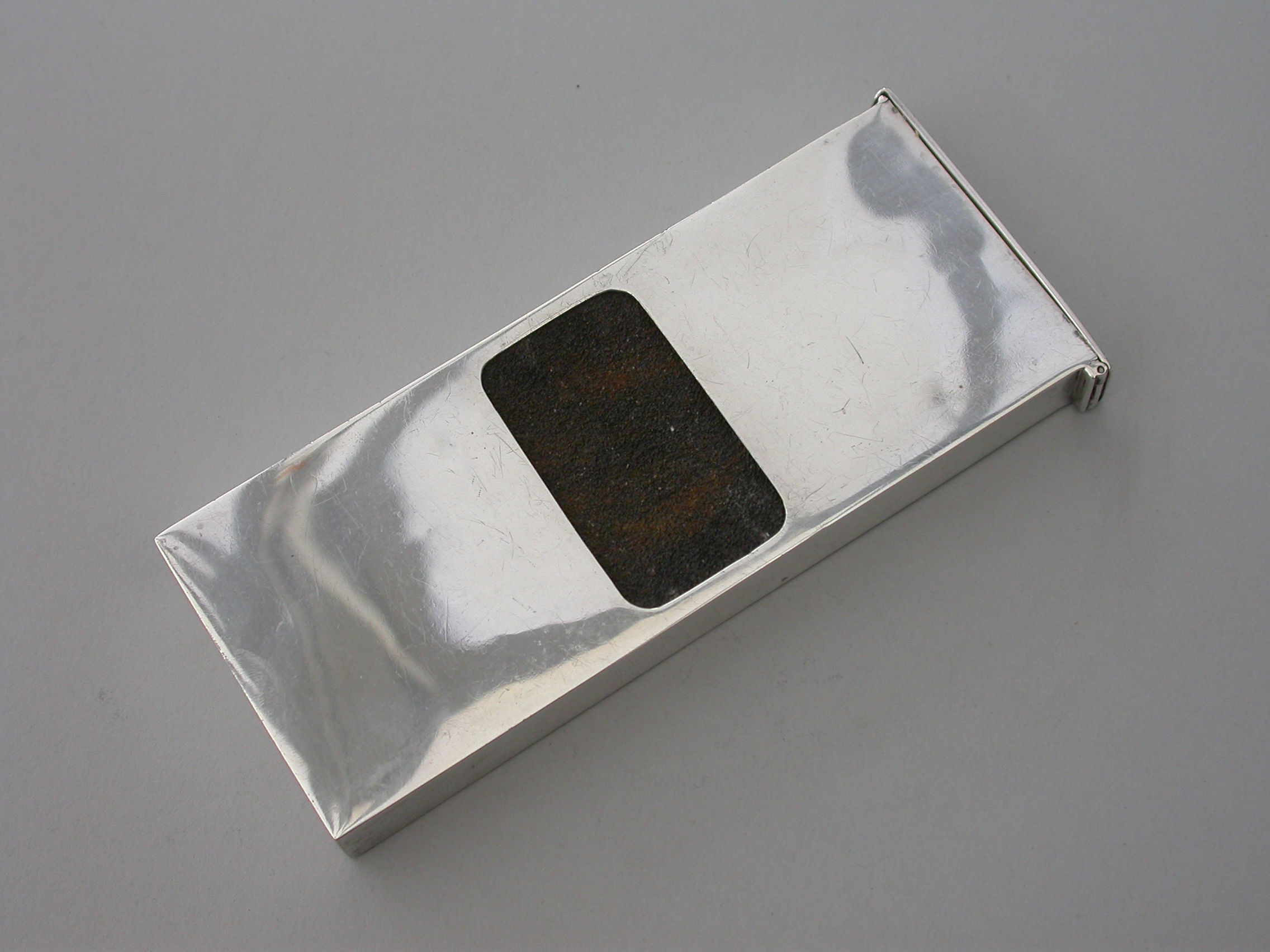 An unusual Edwardian large silver Matchbox Case of plain narrow rectangualr form with hinged lid and aperture for striking, containing an original box of Bryant & May's ""Motor Matches"", for motor-car, cycle and launch lamps. Will flame for 20 seconds and keep alight in the strongest wind. Complete with two original matches.