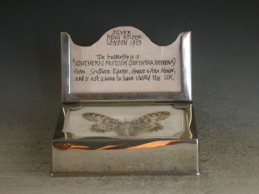 An Edwardian silver mounted Menu Holder with Lepidoptera Interest, formed from a ""Denton's Patent Butterfly Tablet"" with attached silver frame. The encased and preserved butterfly is a ""Bath White"" from Southern Europe and a very rare visitor to the UK.