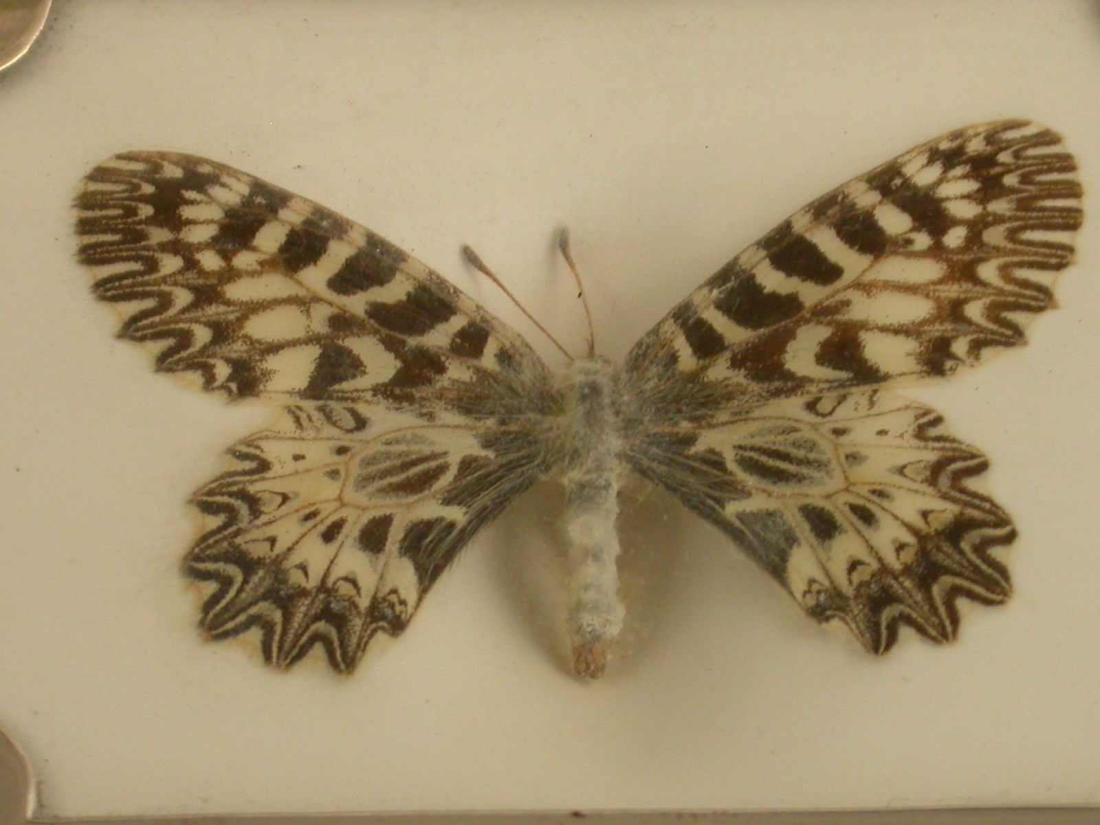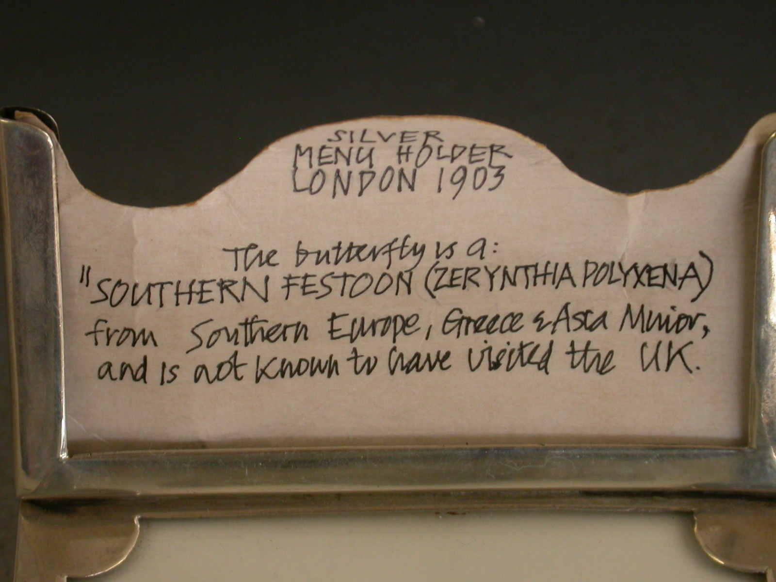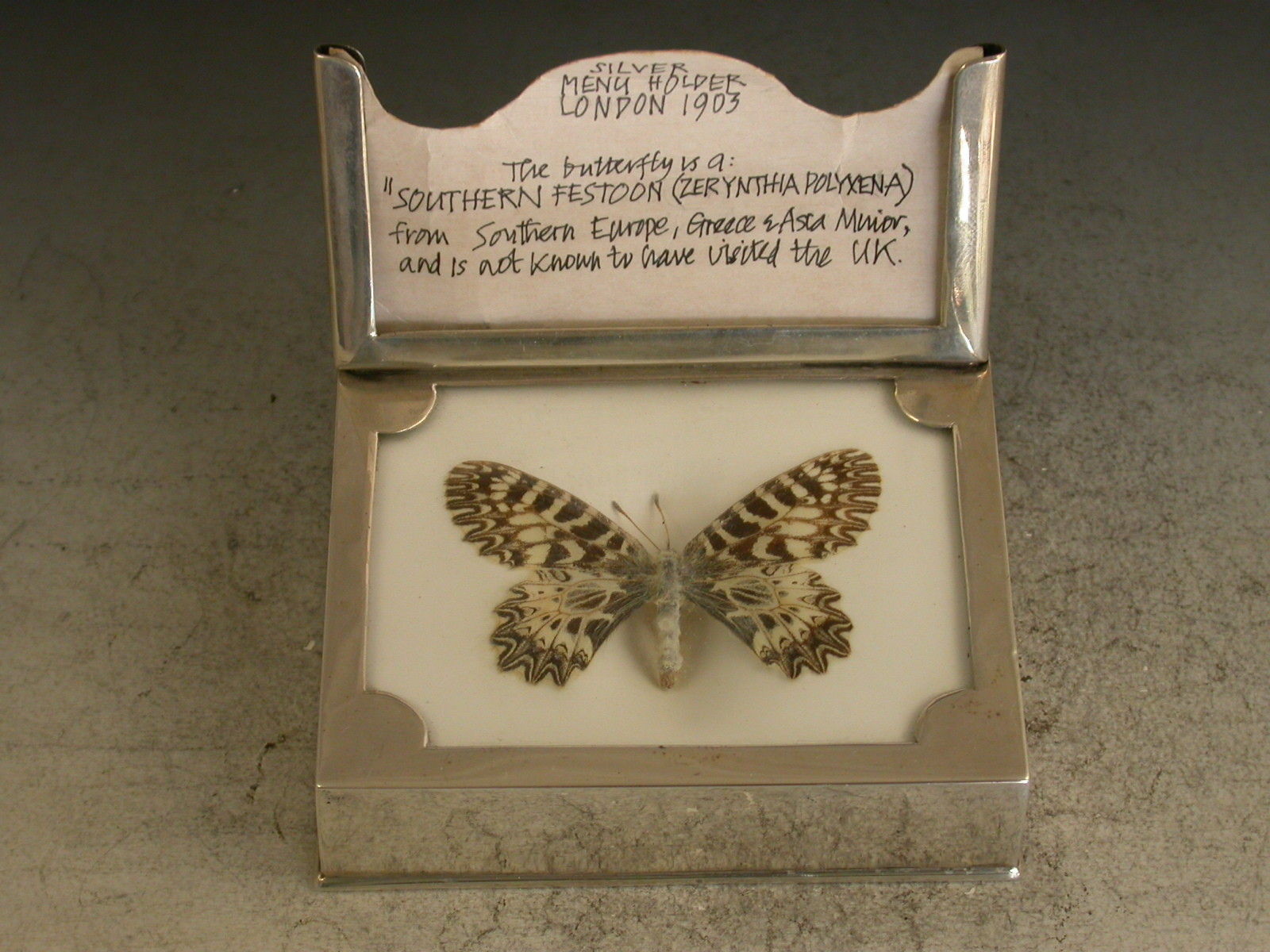 An Edwardian silver mounted Menu Holder with Lepidoptera Interest, formed from a Denton's Patent Butterfly Tablet with attached silver frame. The encased and preserved butterfly is a ""Southern Festoon"" from Southern Europe, Greece and Asia and is not known to have visited the UK.