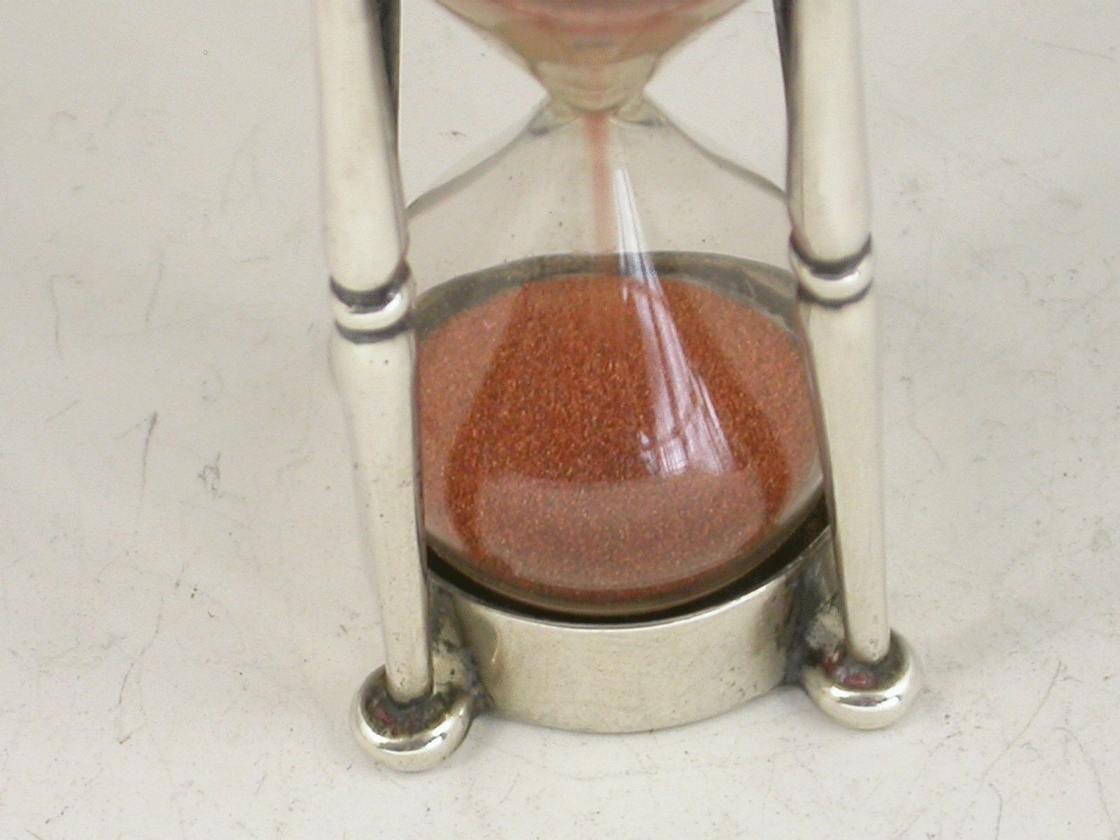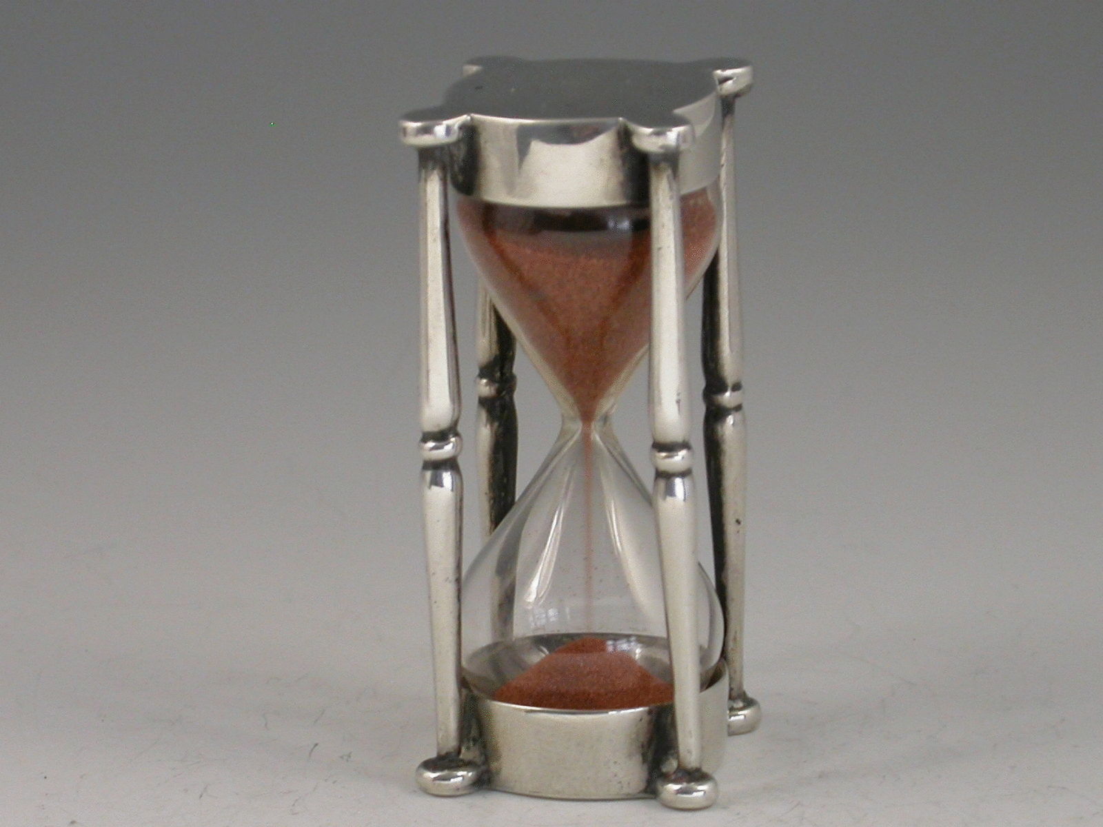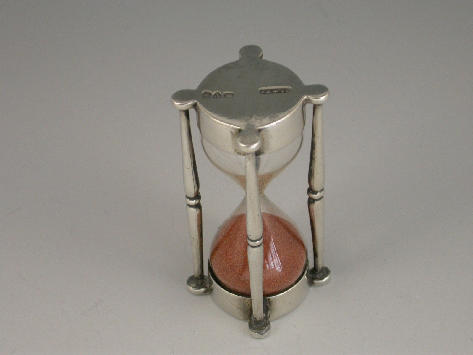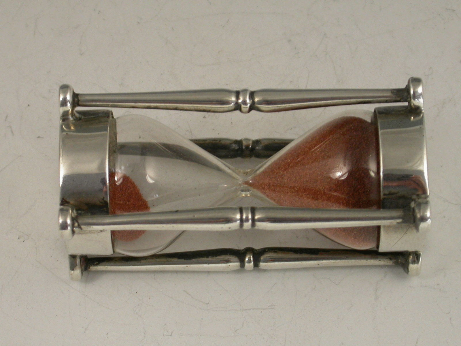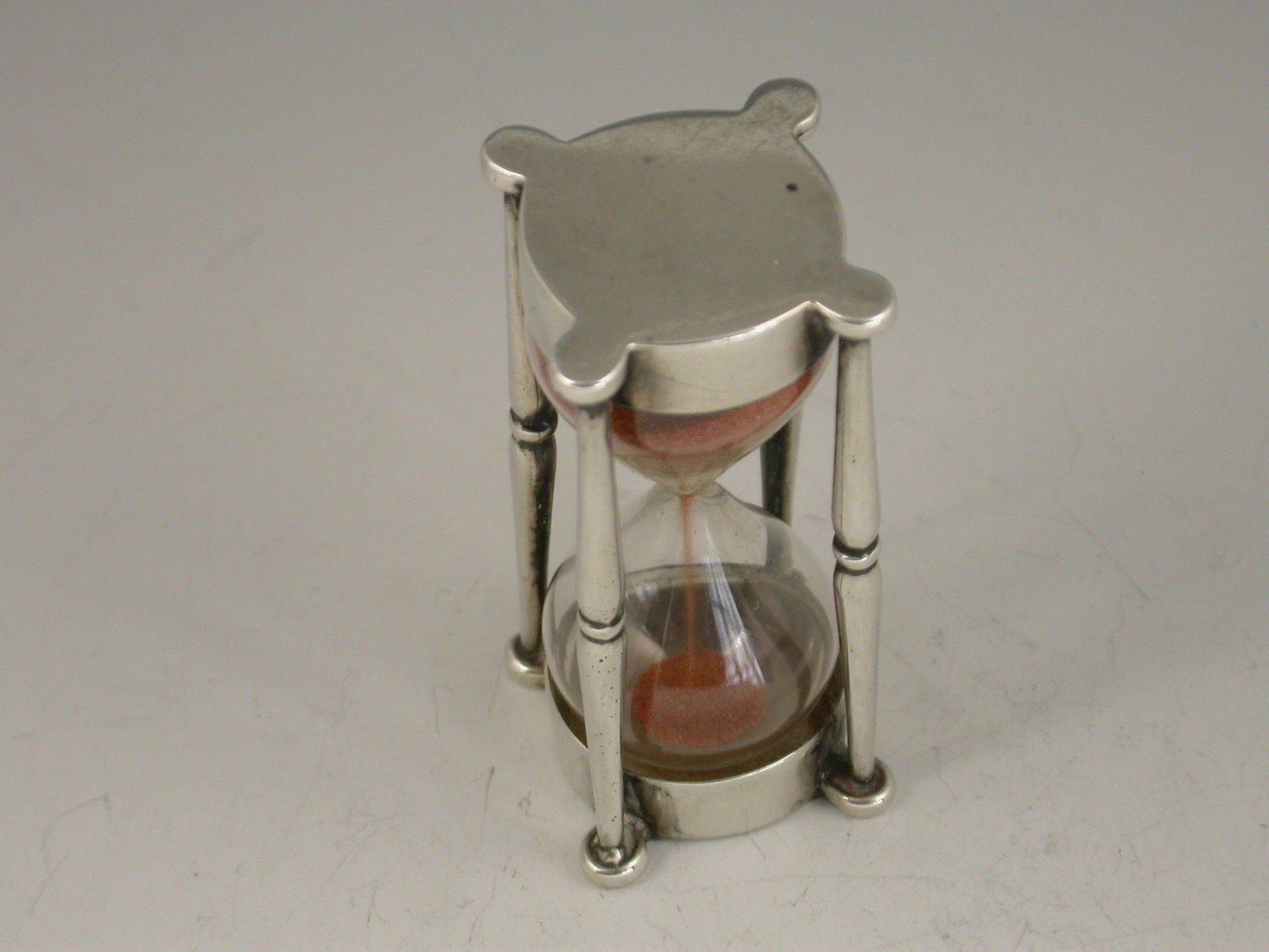 An Edwardian silver mounted glass Egg Timer, the two silver caps joined together by four pillars, one at each corner. The sand taking 3 minutes 30 seconds to run from one glass to another.