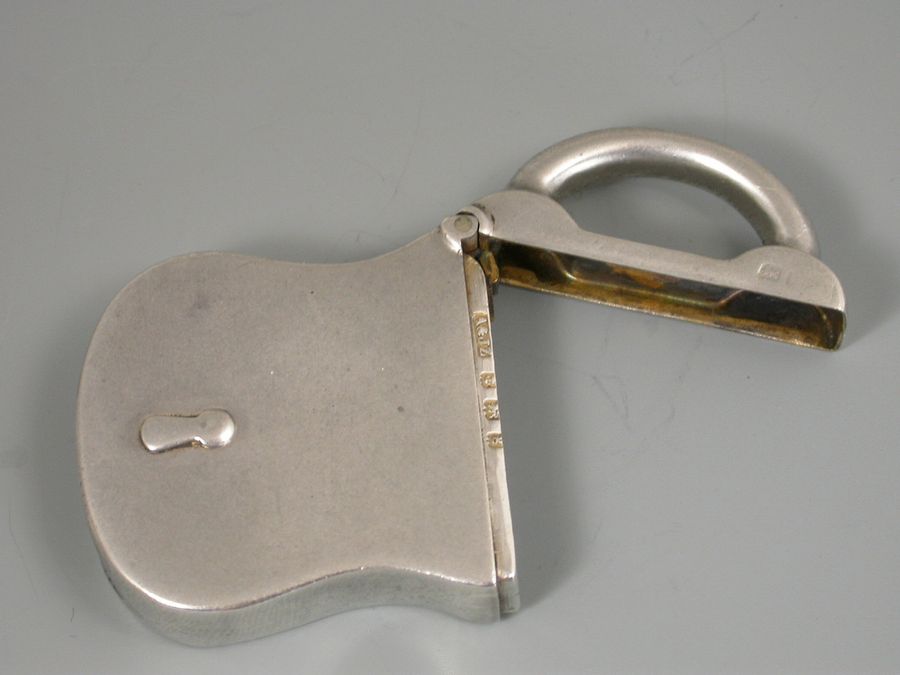 A rare Edwardian silver Vesta Case made in the form of a large padlock with sprung hinged flip top lid, the face engraved with contemporary initials 'HB'.