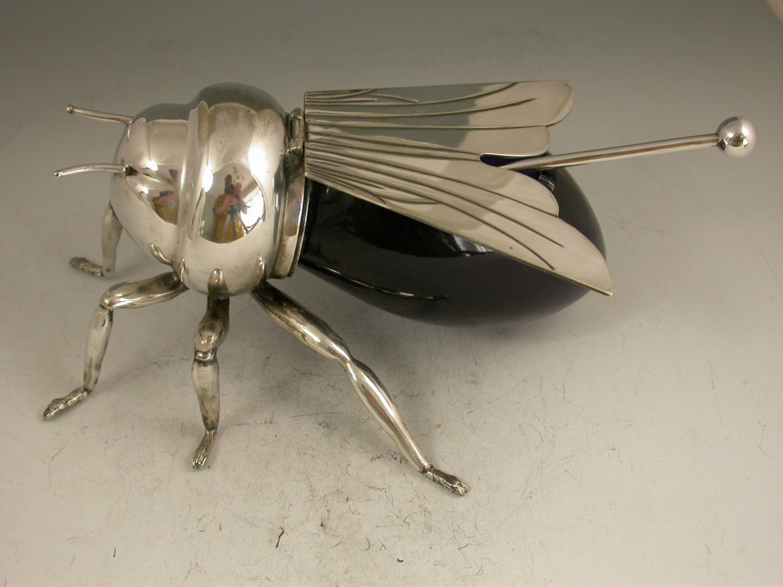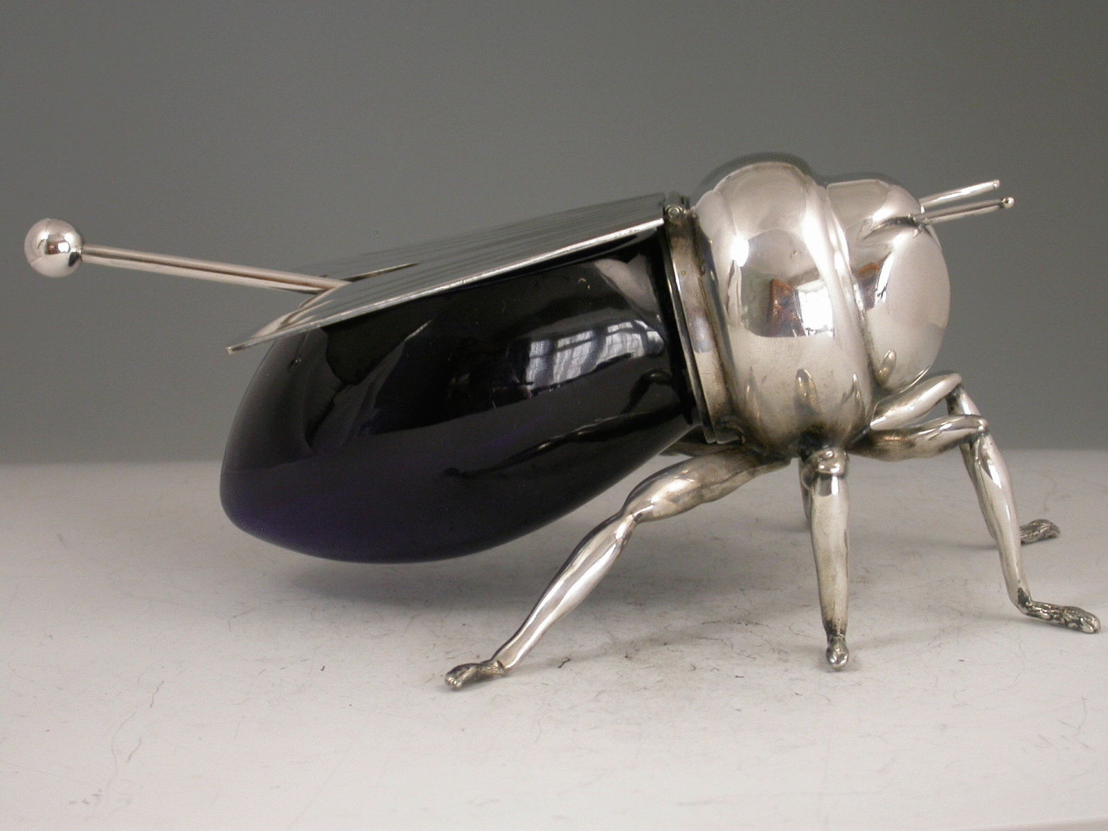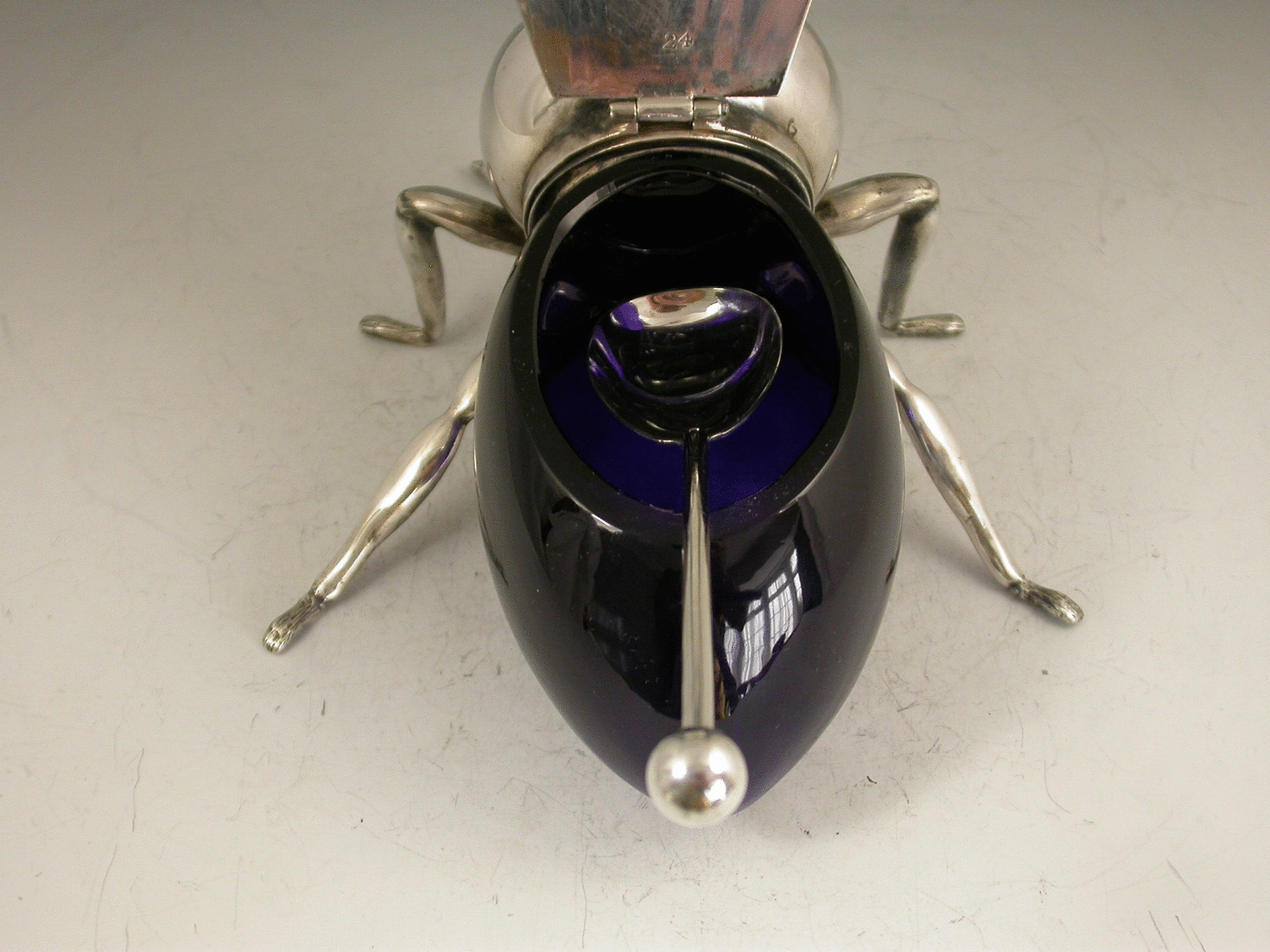 An Edwardian silver plated blue glass Honey Pot made in the form of a honey bee, standing on six legs with hinged lid formed from the wings, complete with associated spoon.