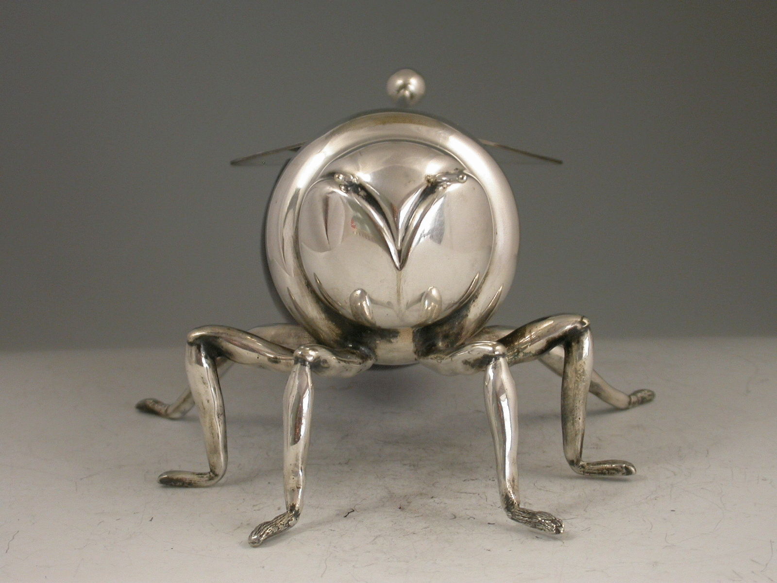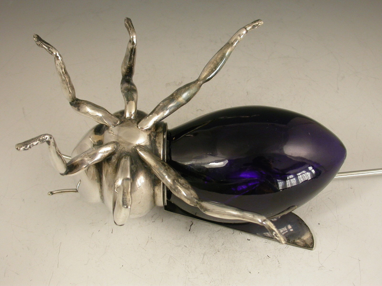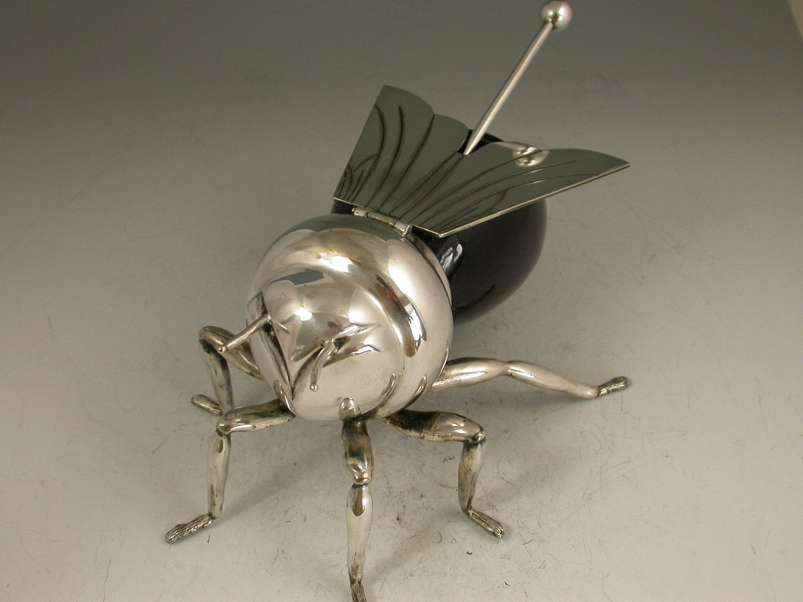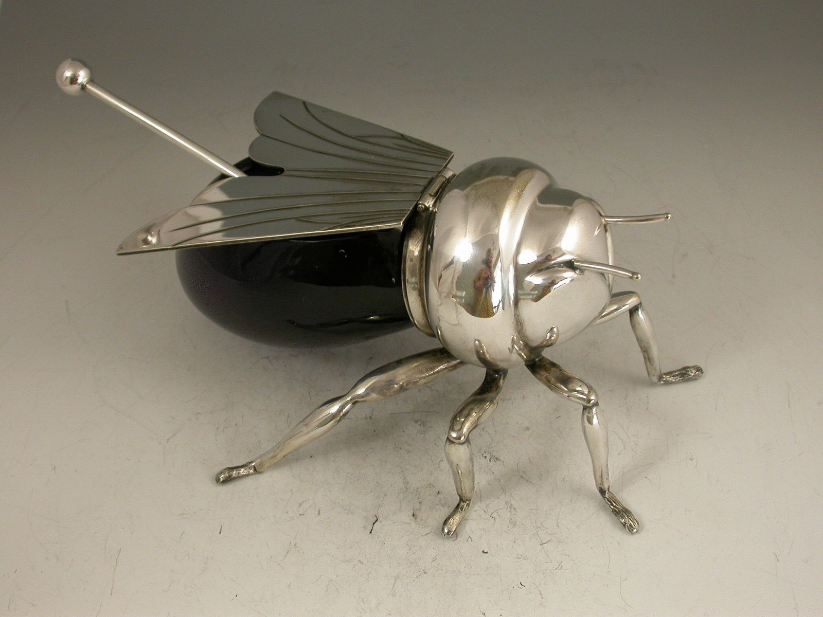 An Edwardian silver plated blue glass Honey Pot made in the form of a honey bee, standing on six legs with hinged lid formed from the wings, complete with associated spoon.
