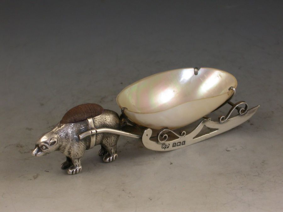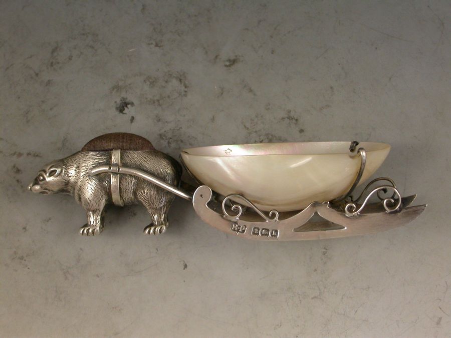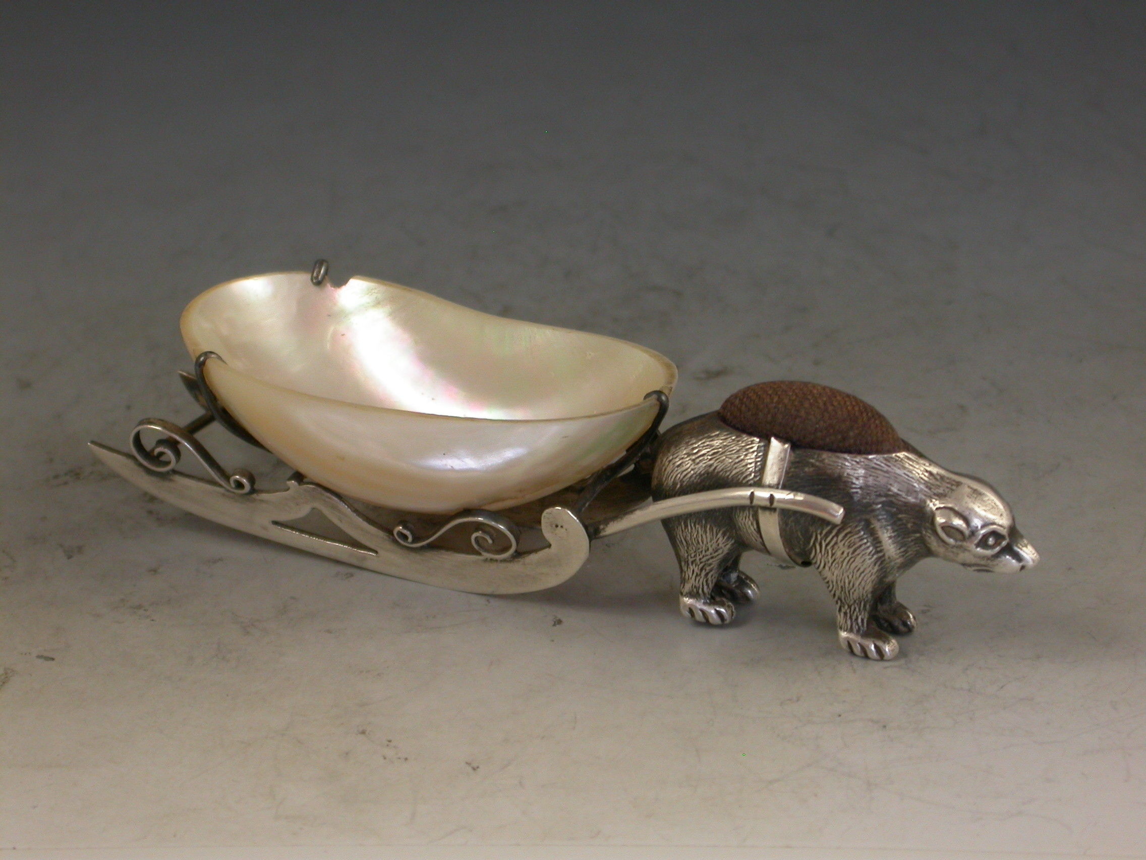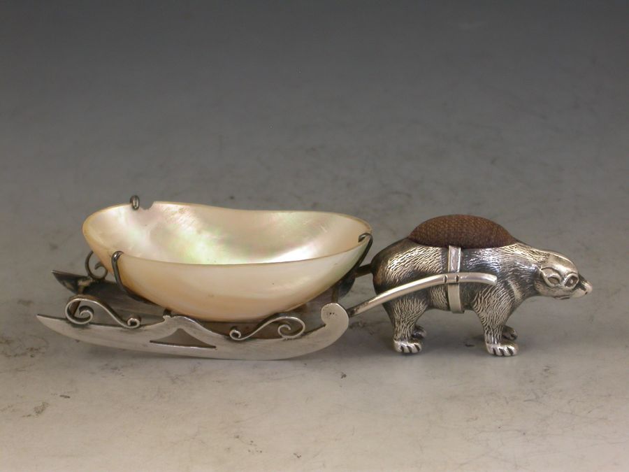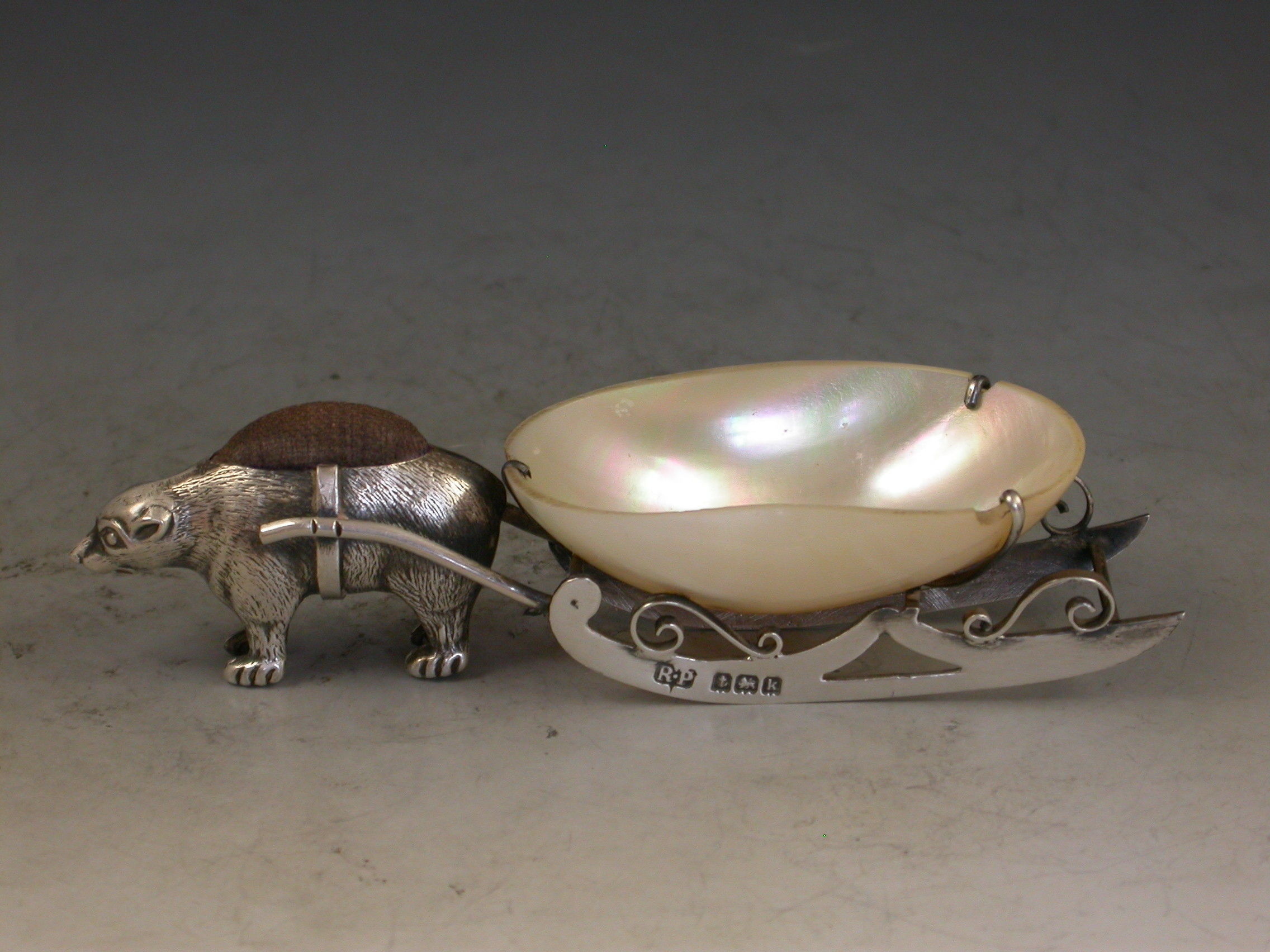 An extremely rare Edwardian silver Pin Cushion depicting a Polar Bear pulling a silver mounted mother of pearl Pin Tray made in the form of a sleigh.