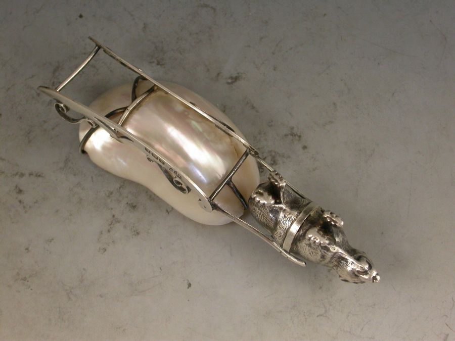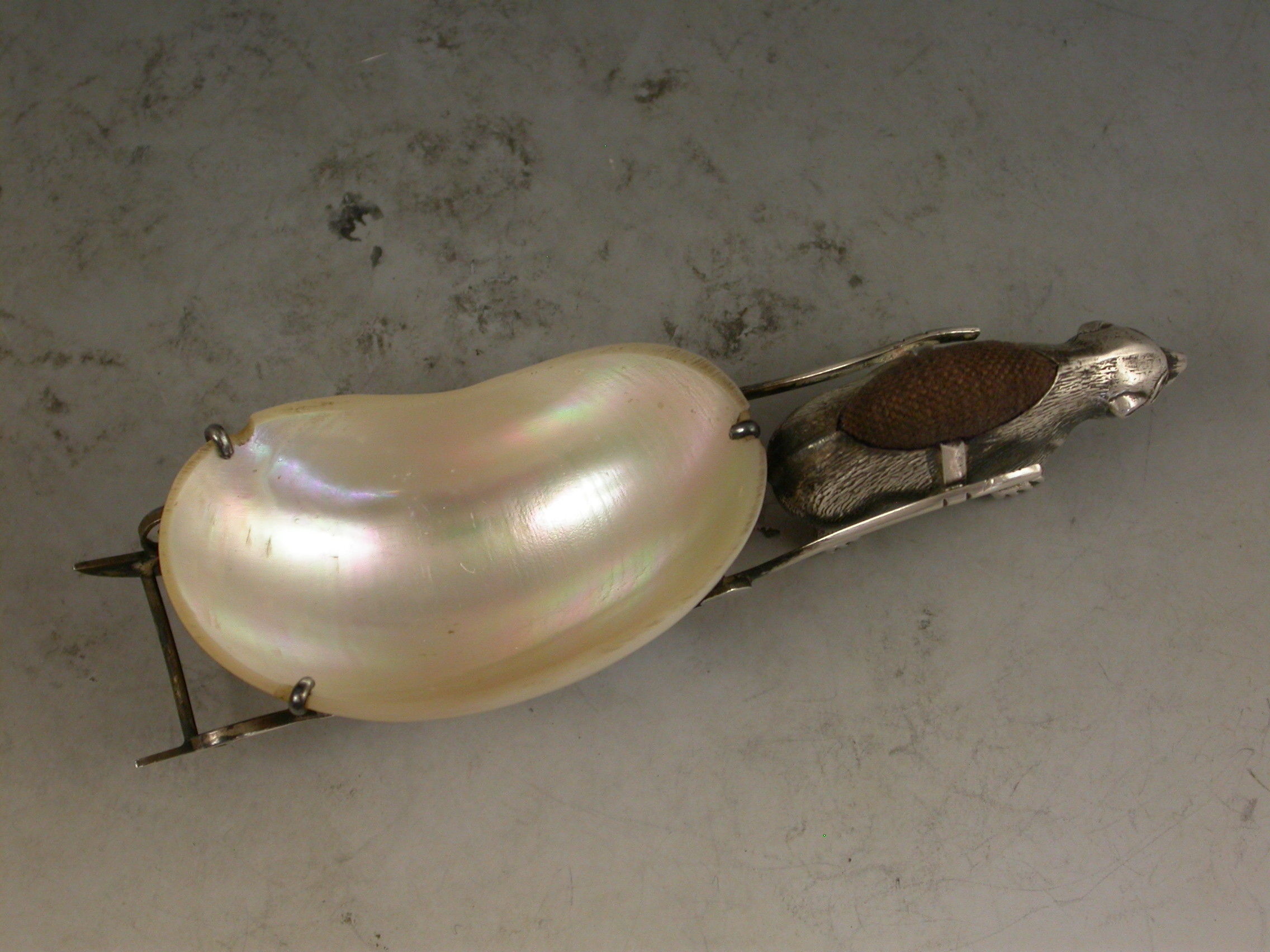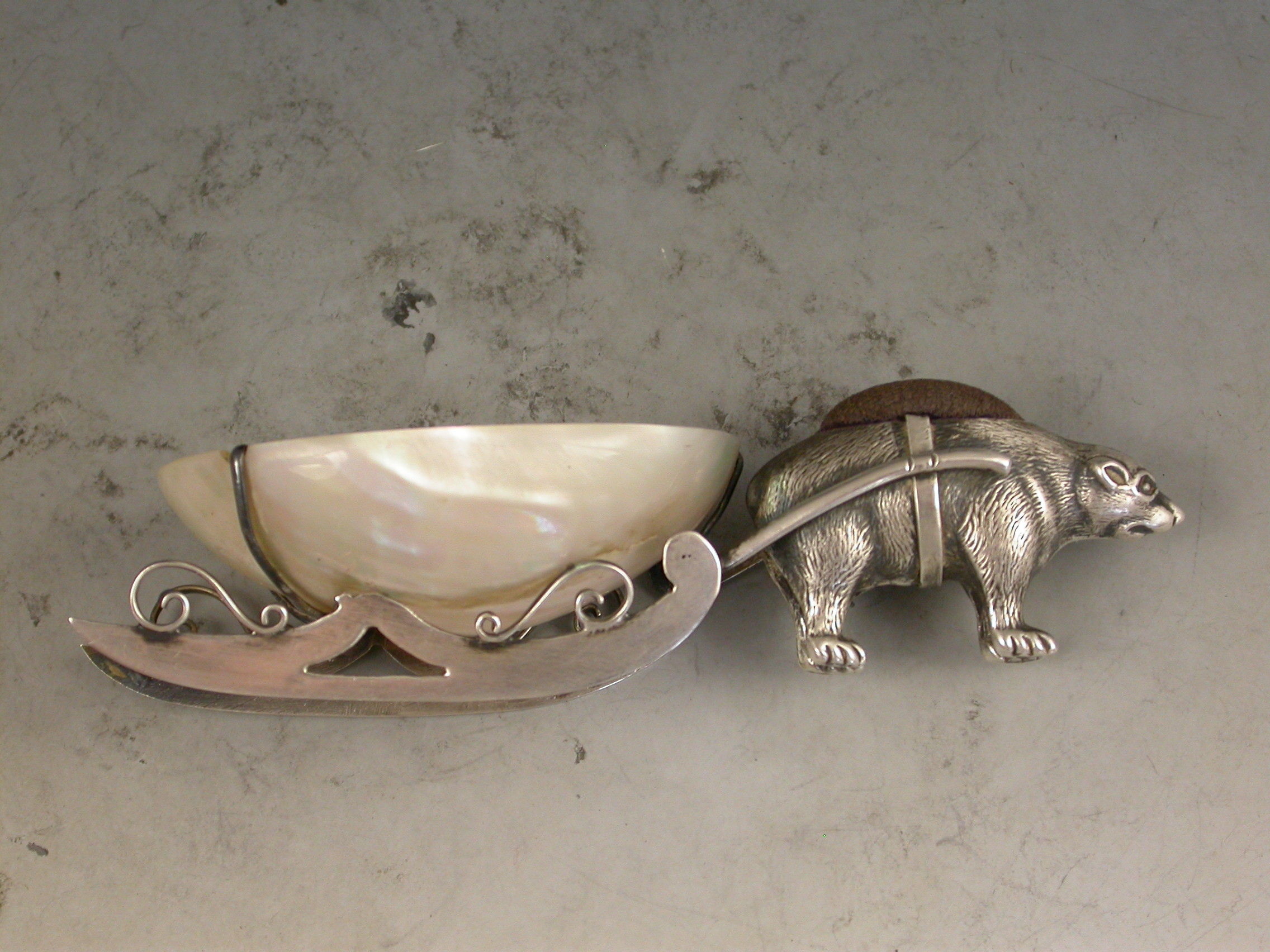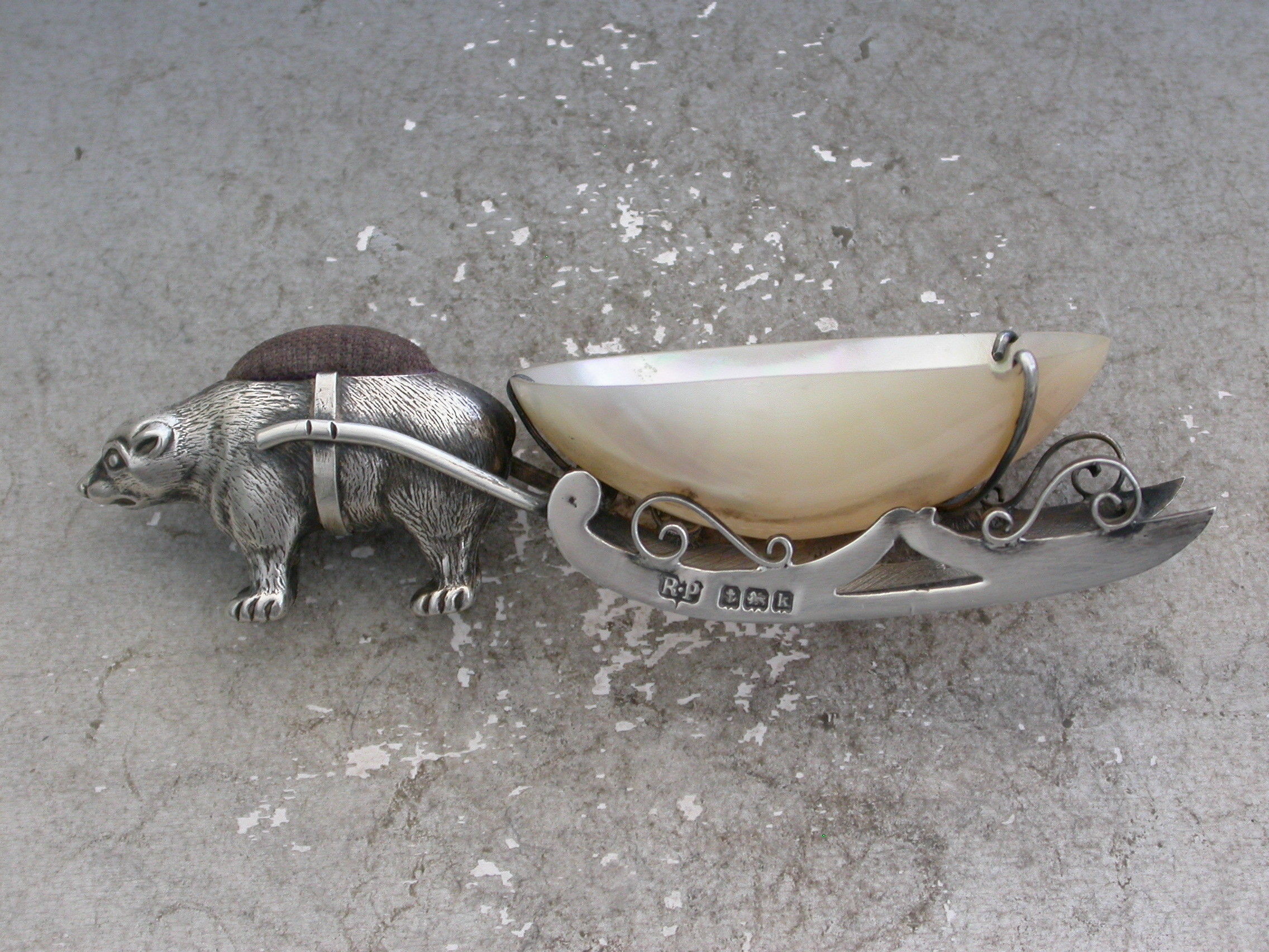An extremely rare Edwardian silver Pin Cushion depicting a Polar Bear pulling a silver mounted mother of pearl Pin Tray made in the form of a sleigh.