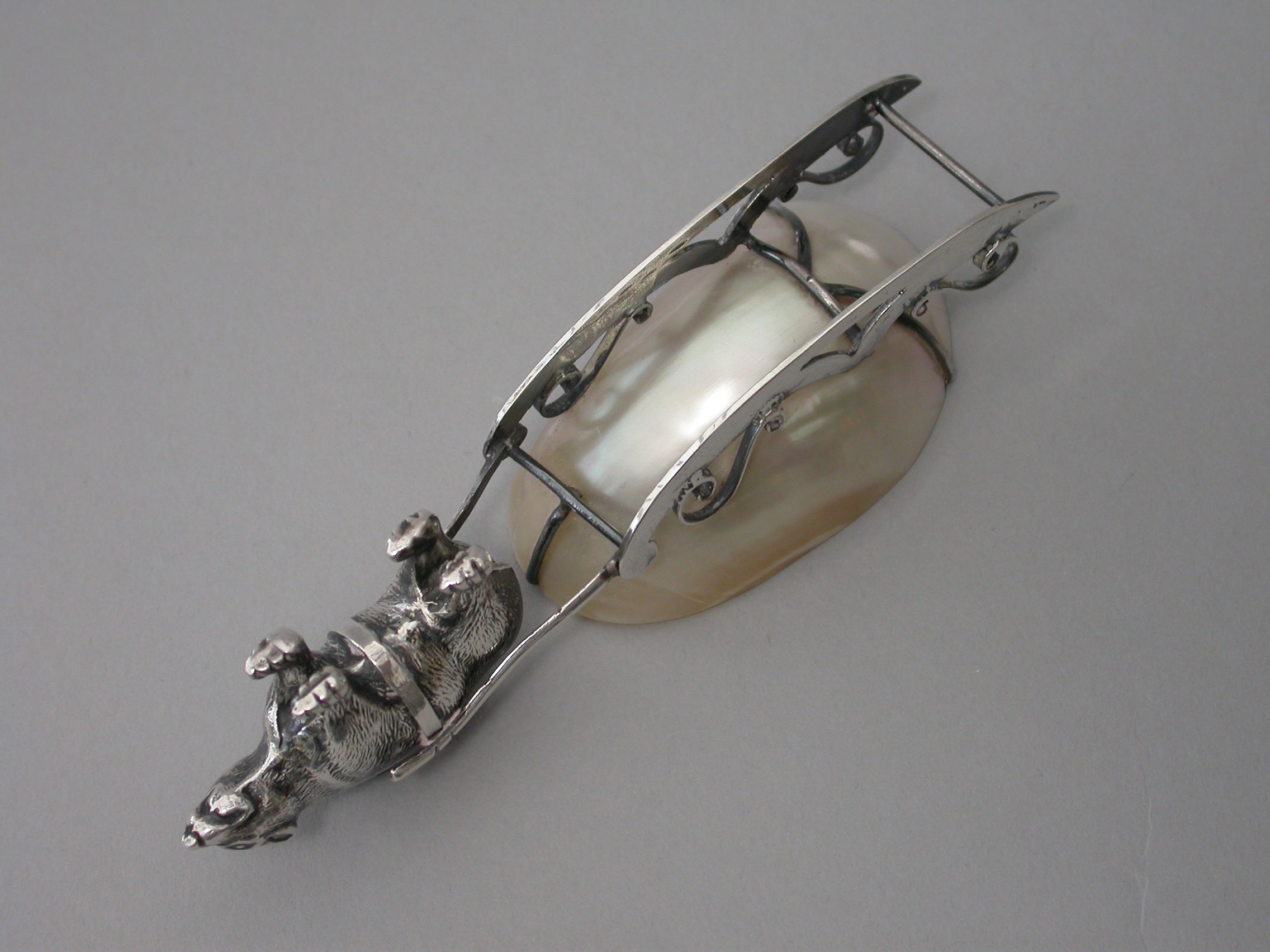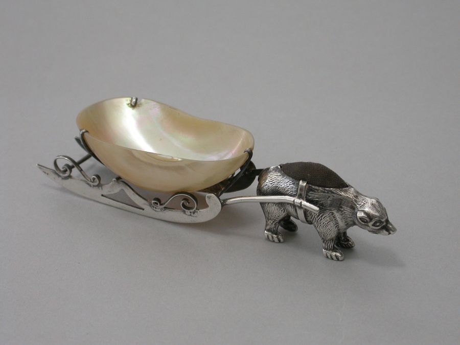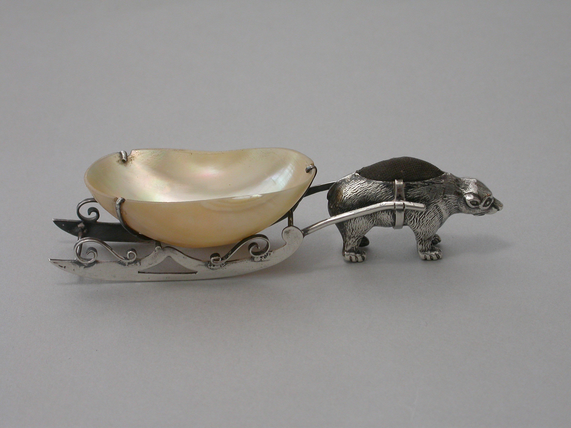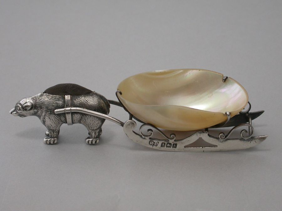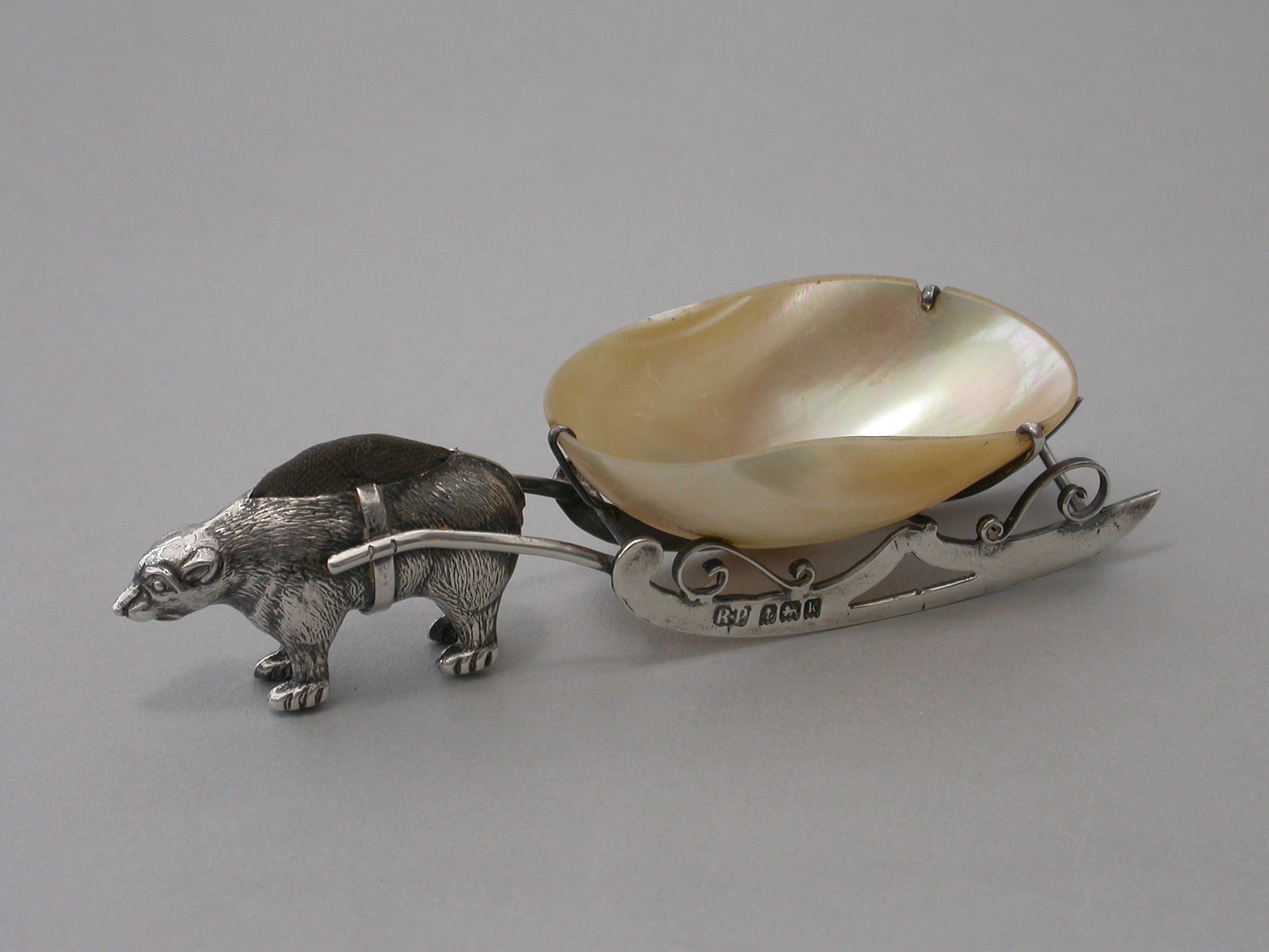 An extremely rare Edwardian silver Pin Cushion depicting a Polar Bear pulling a silver mounted mother of pearl Pin Tray made in the form of a sleigh.