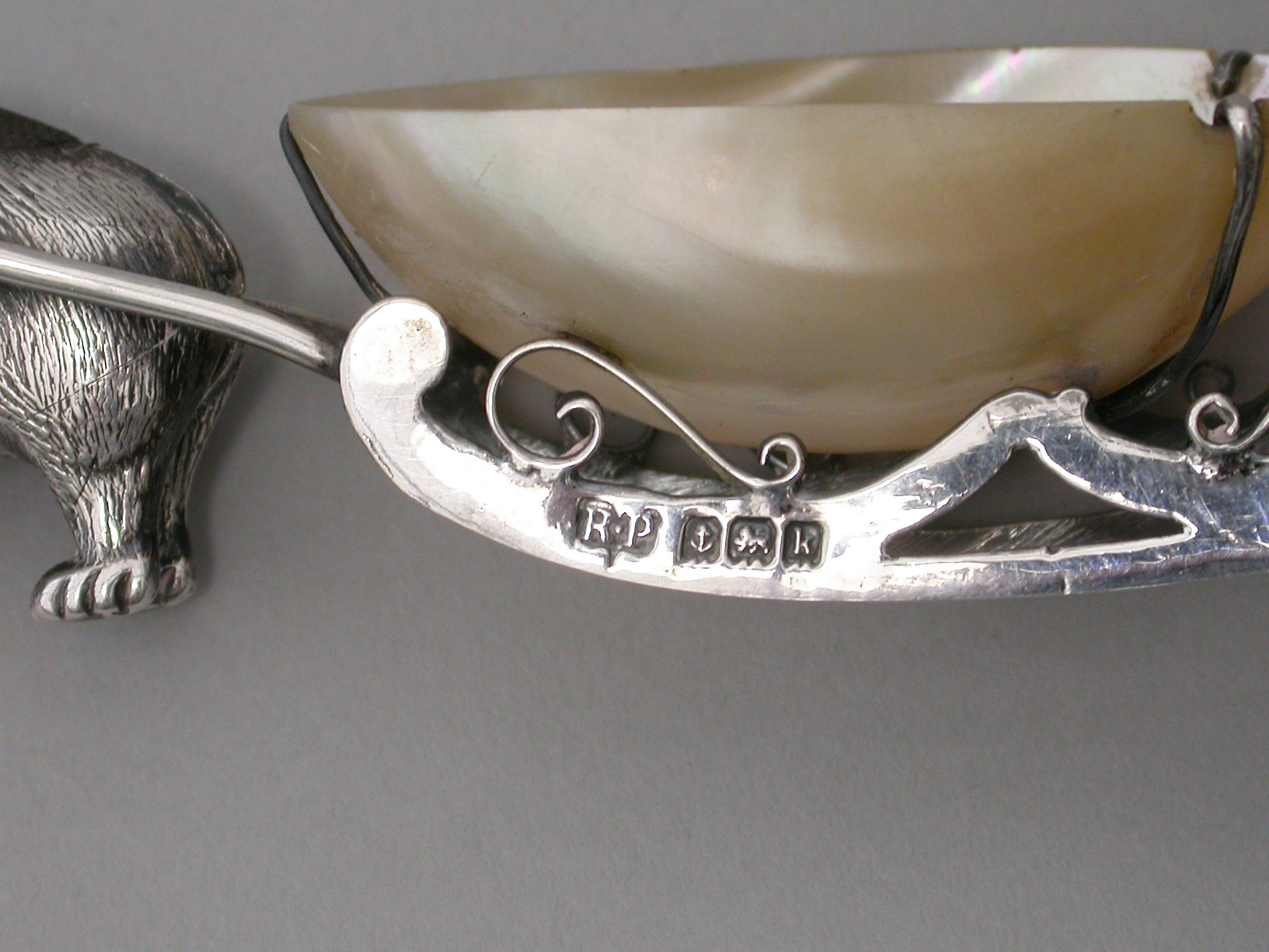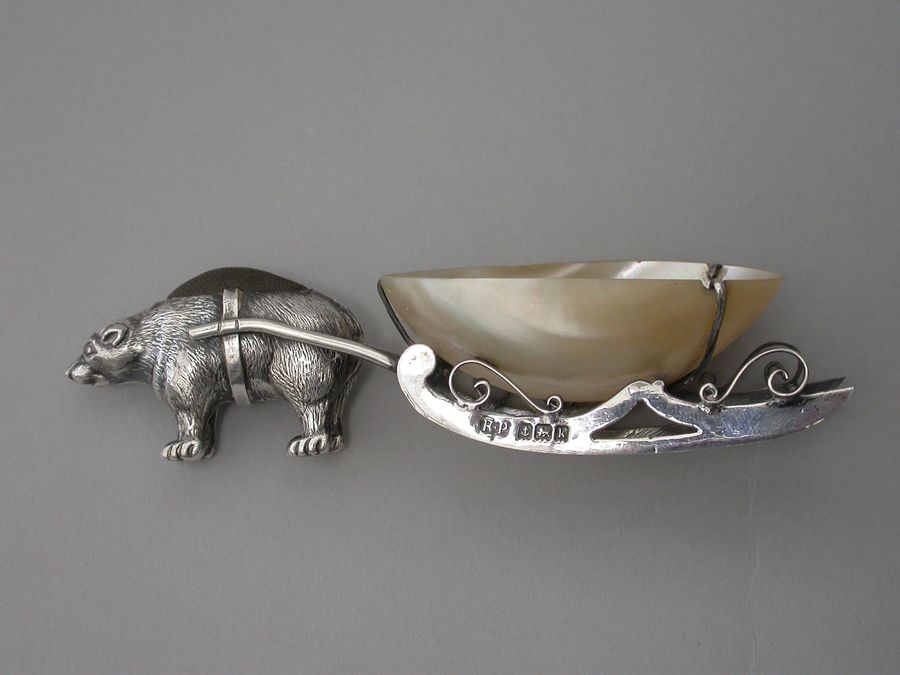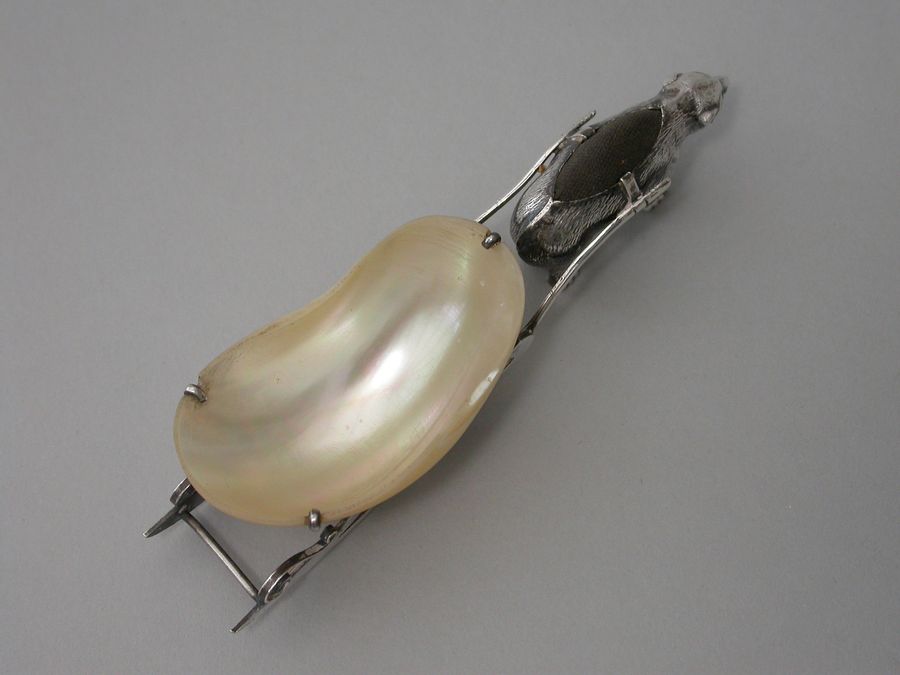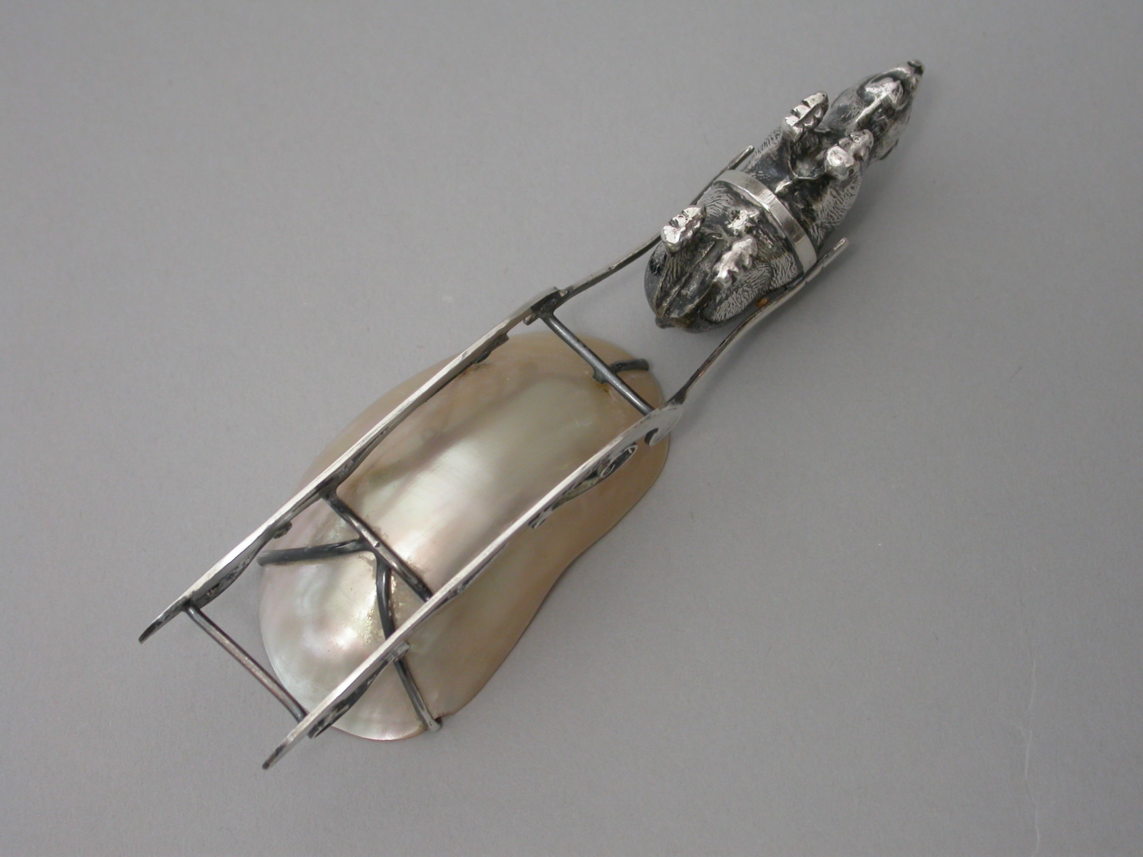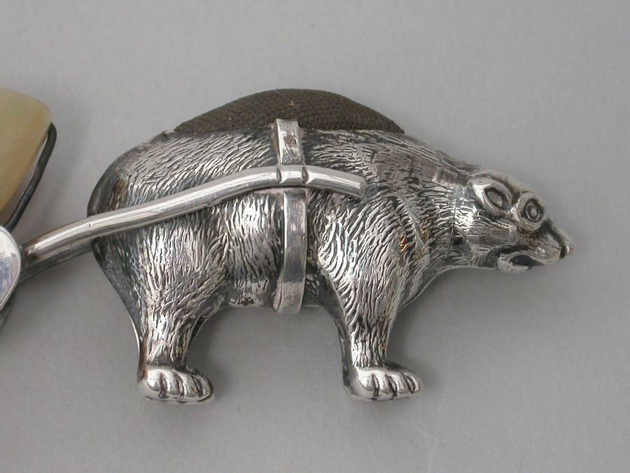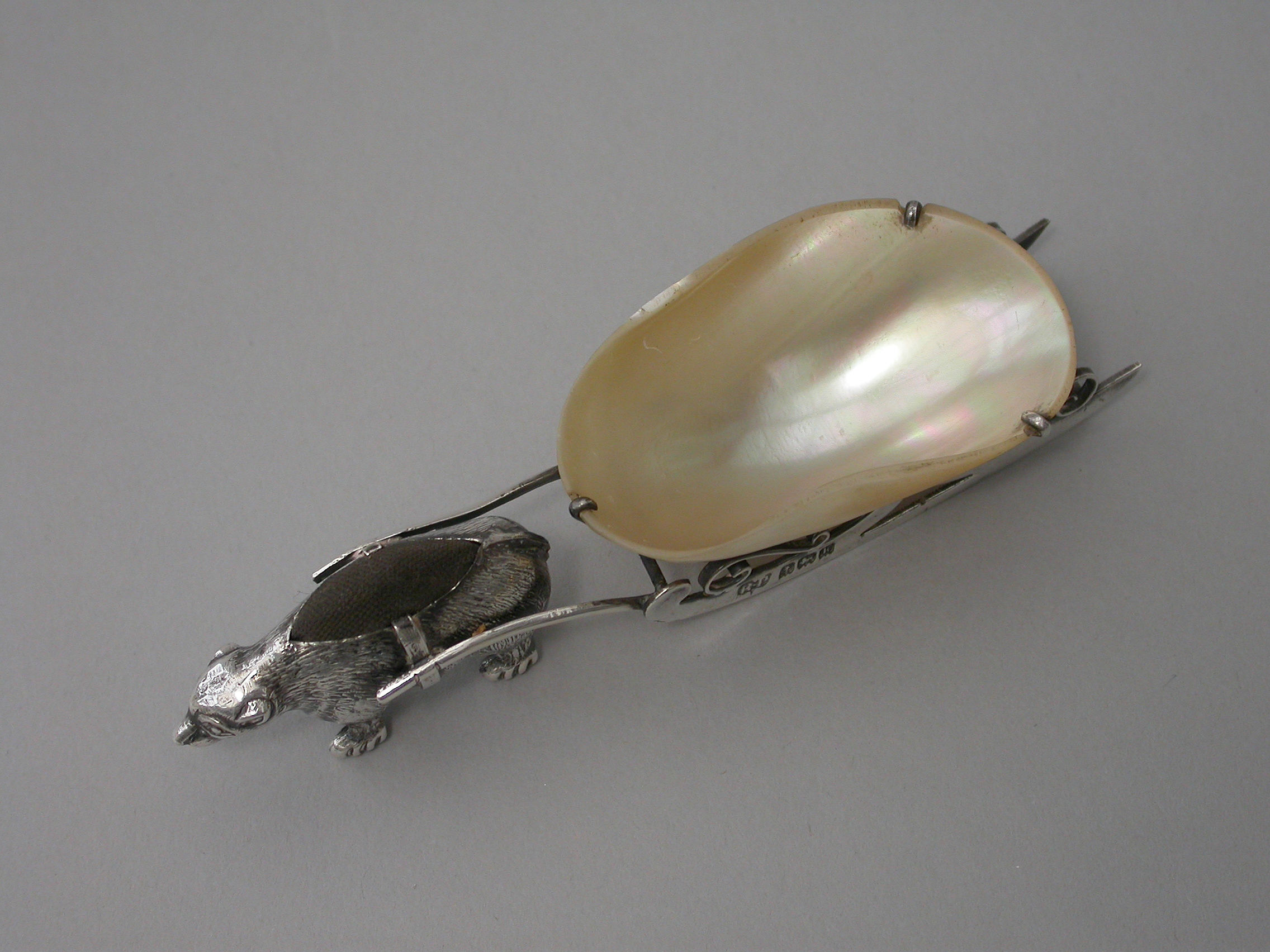 An extremely rare Edwardian silver Pin Cushion depicting a Polar Bear pulling a silver mounted mother of pearl Pin Tray made in the form of a sleigh.