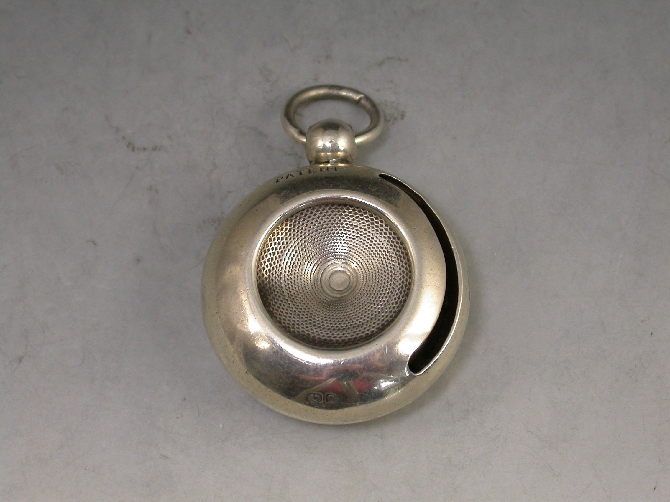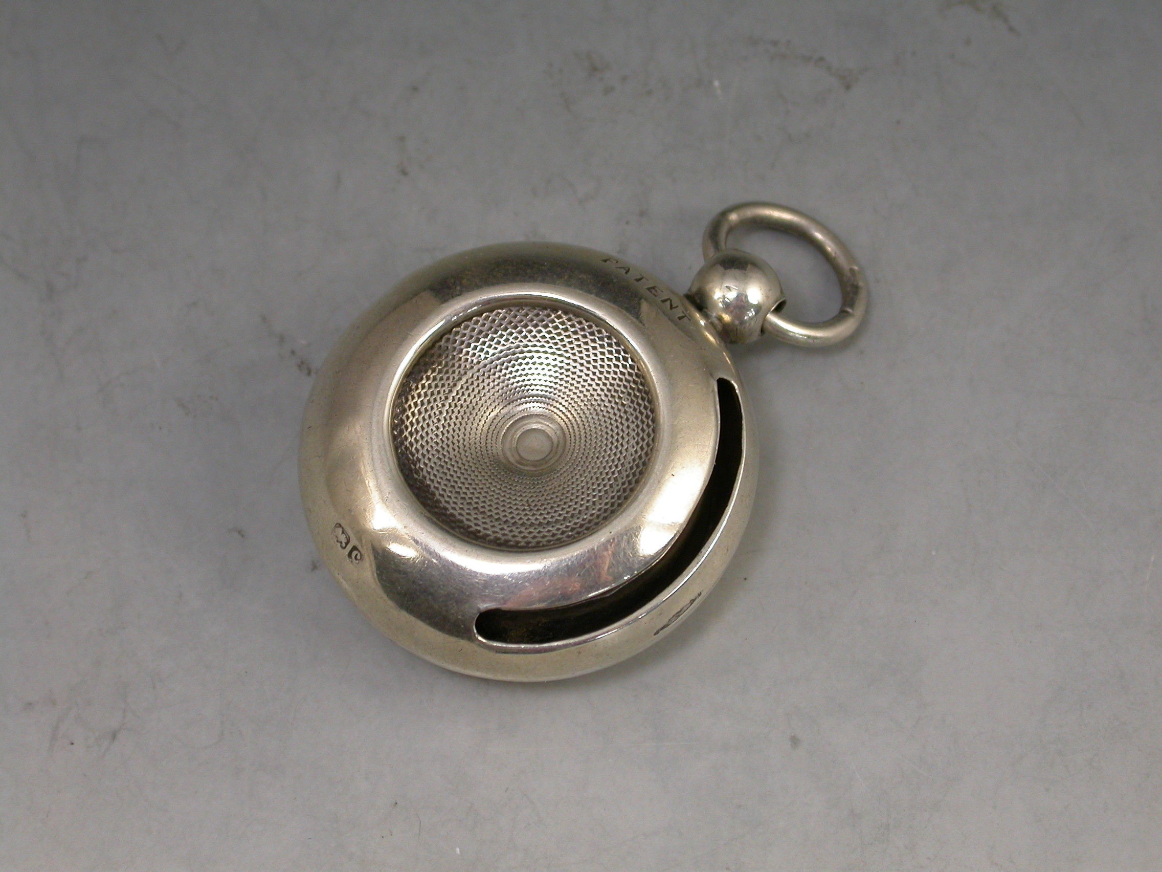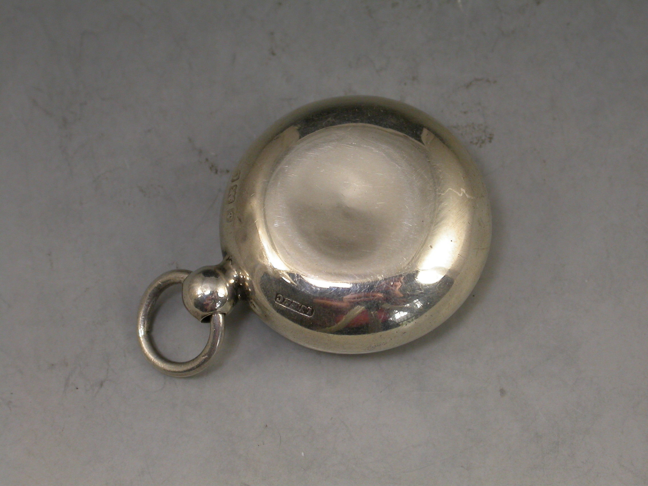 An unusual Edwardian silver Sovereign Case of compressed circular form with attached suspension ring, an open sprung central sovereign compartment with side loading slot. A patented design.
