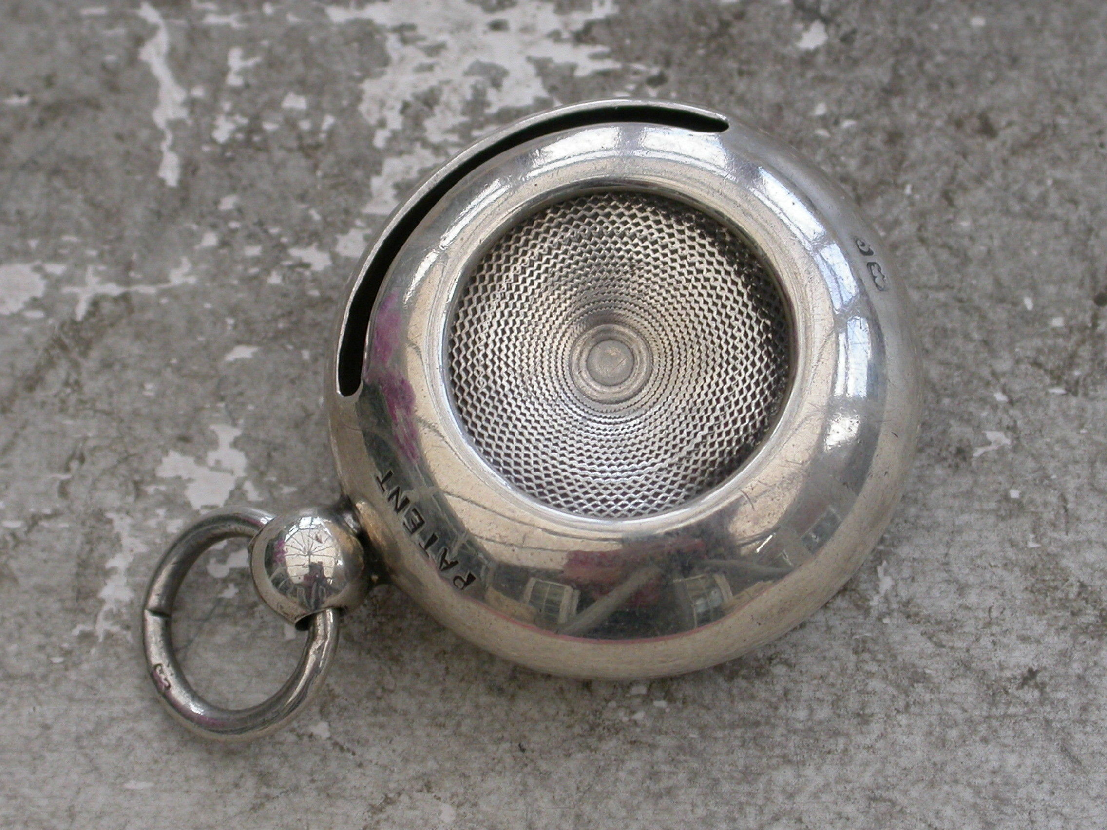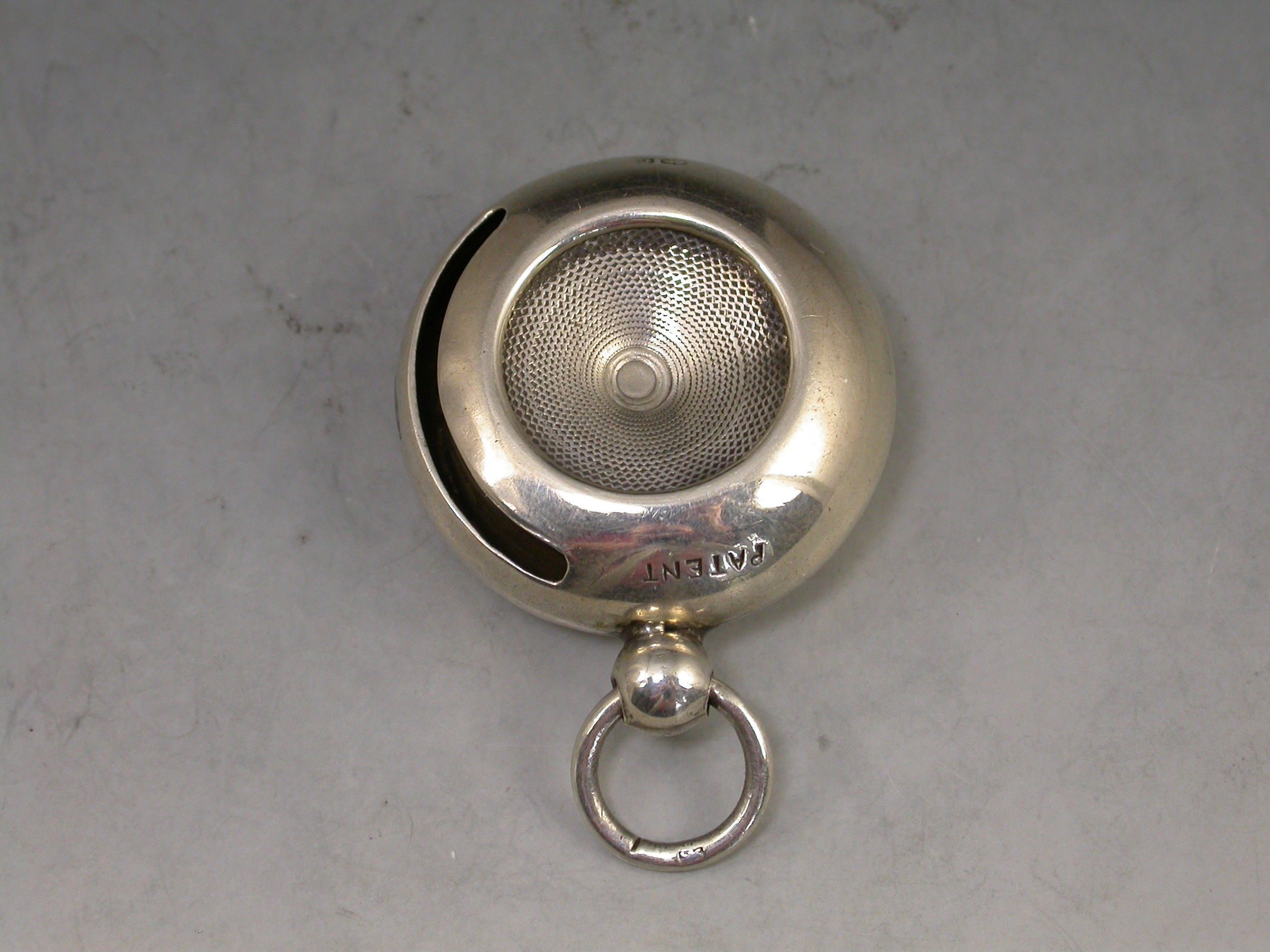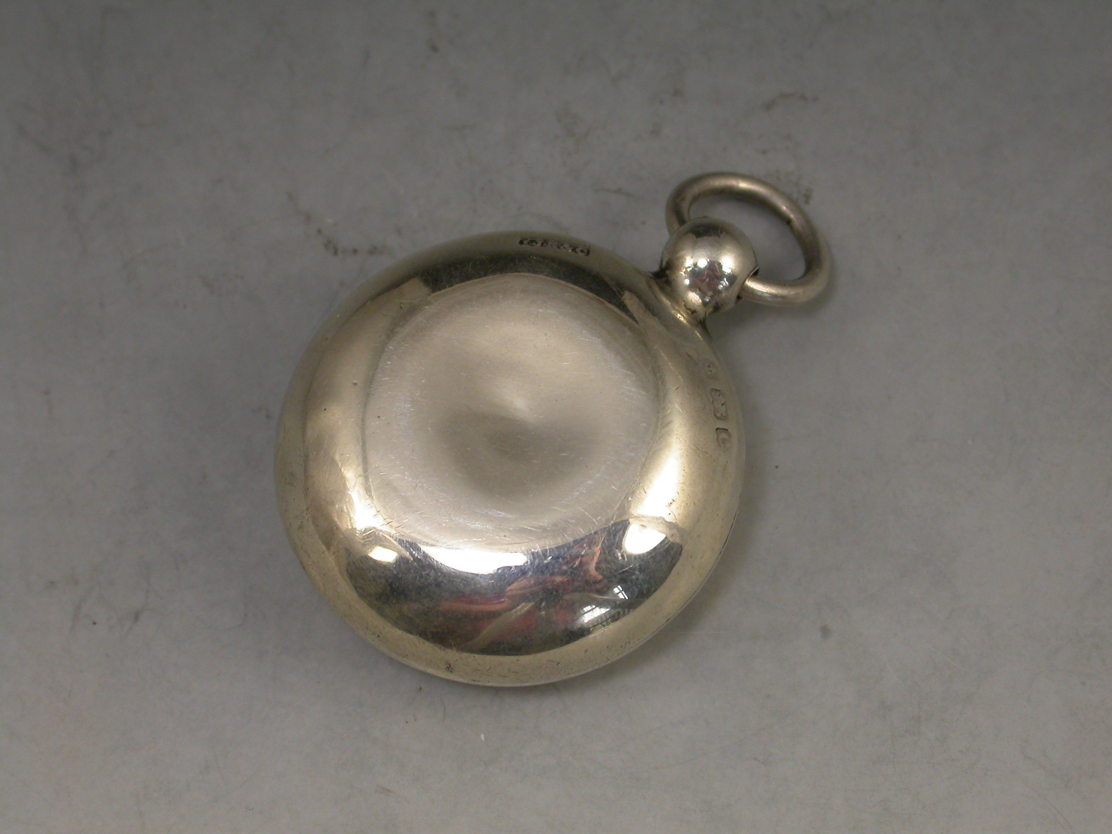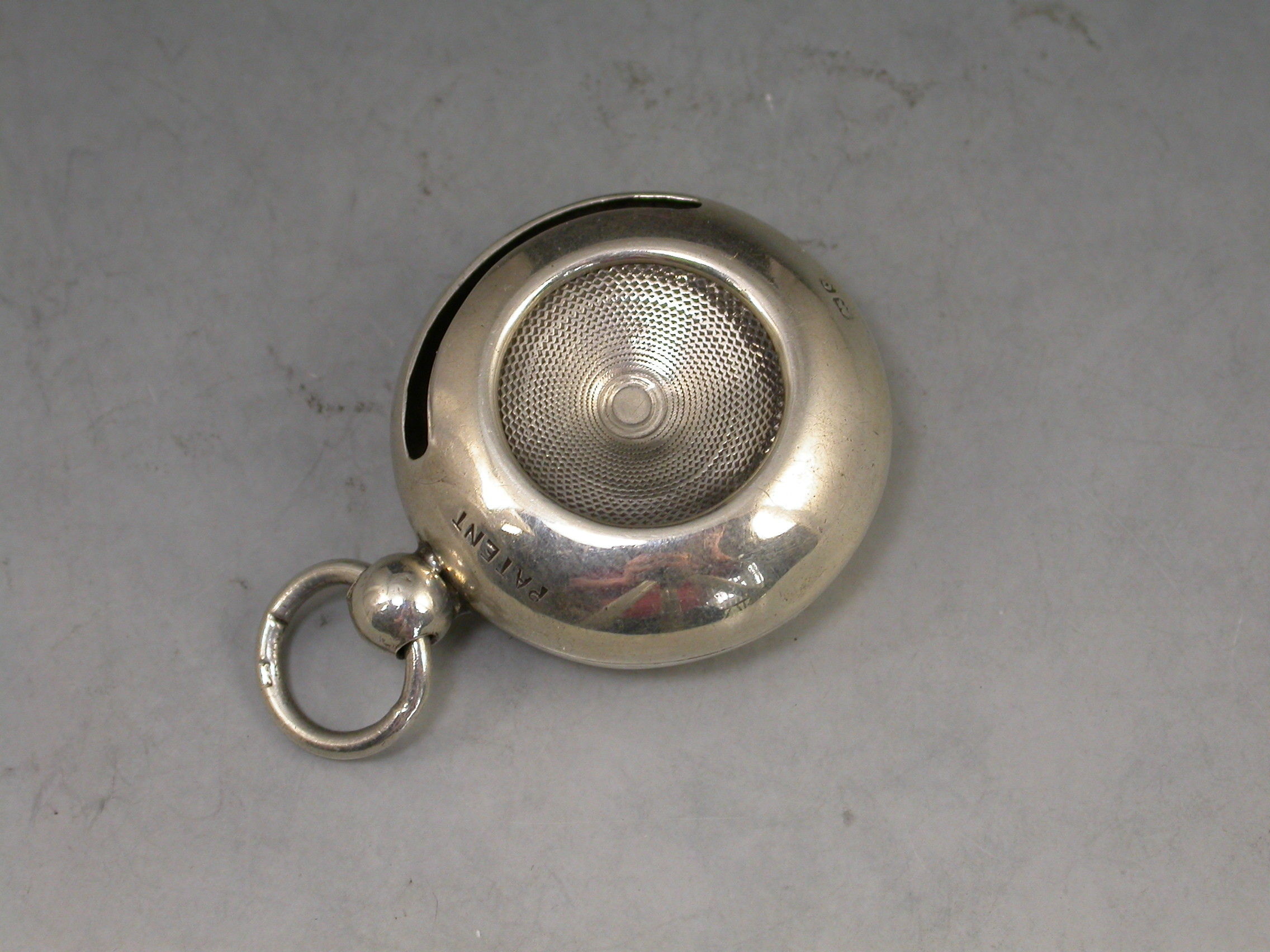 An unusual Edwardian silver Sovereign Case of compressed circular form with attached suspension ring, an open sprung central sovereign compartment with side loading slot. A patented design.