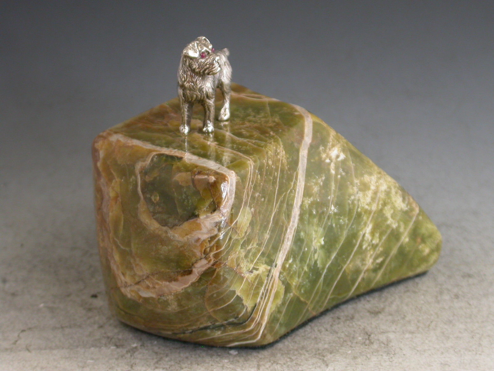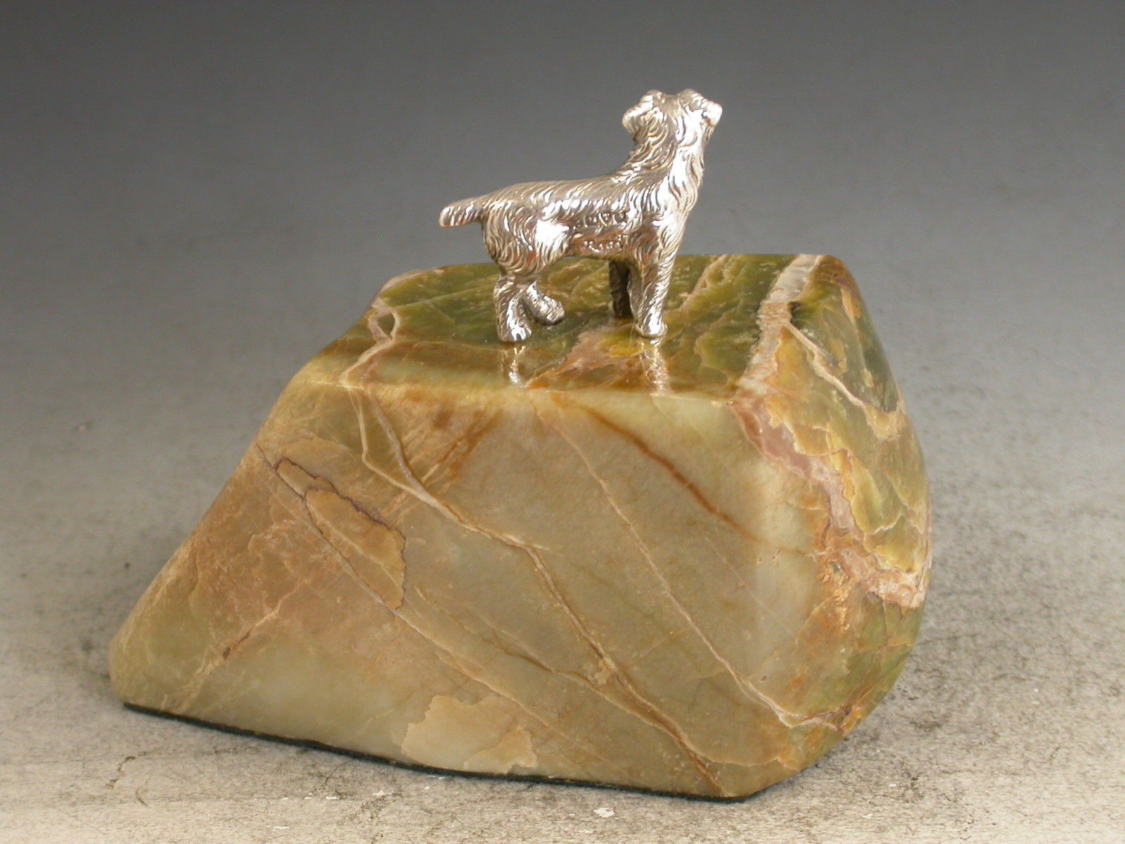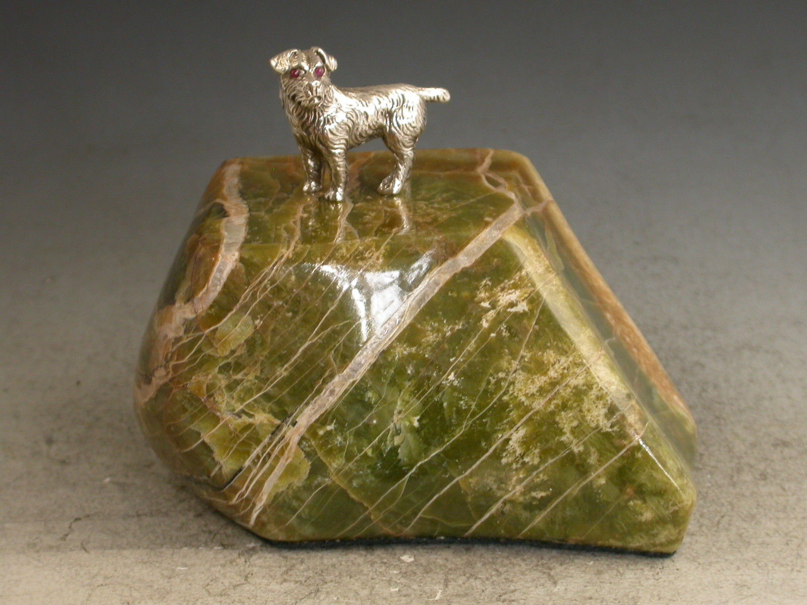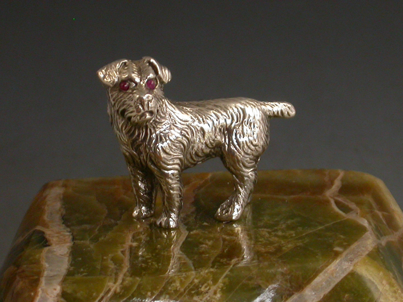 A fine quality Edwardian silver model of a Terrier standing on a shaped green Connemara marble base with ruby glass eyes. Realistically modelled and very well defined.